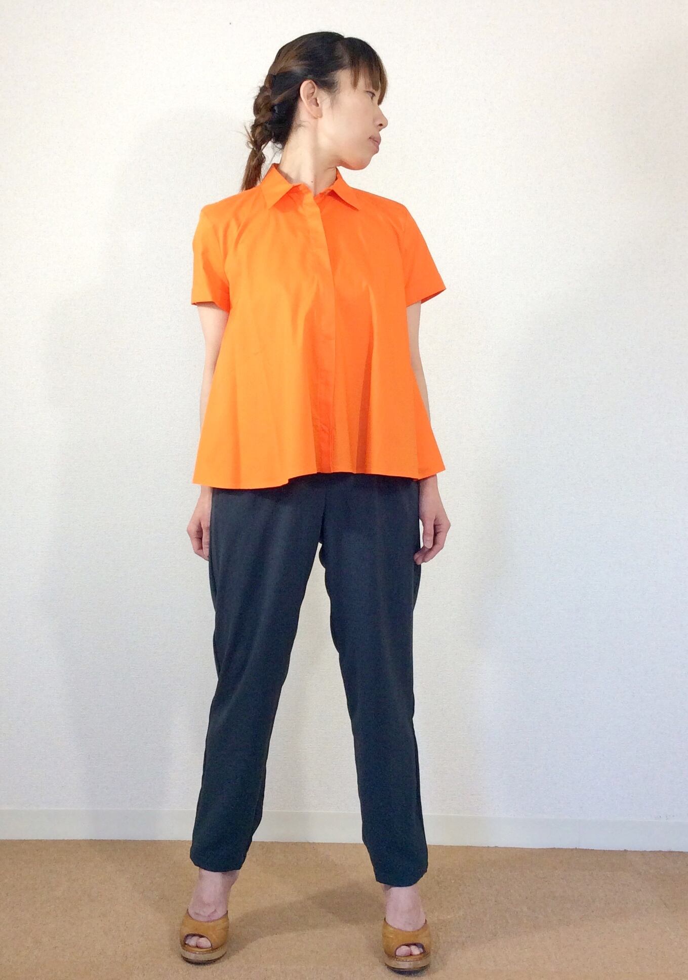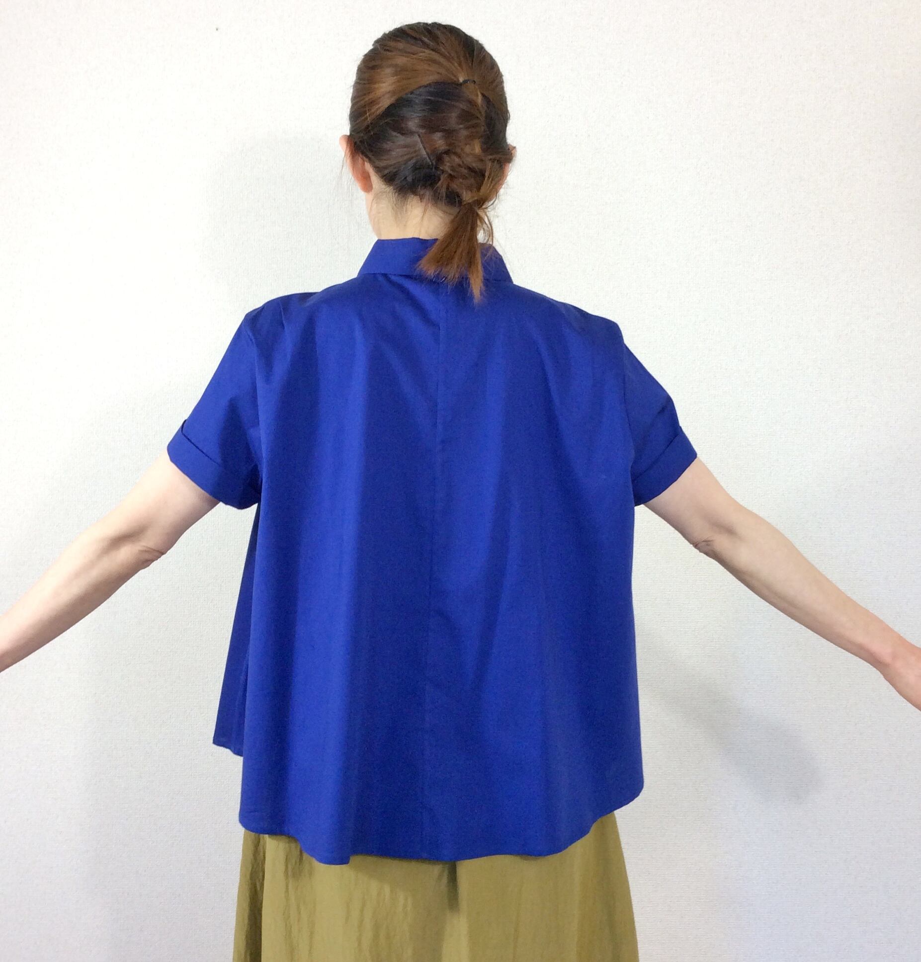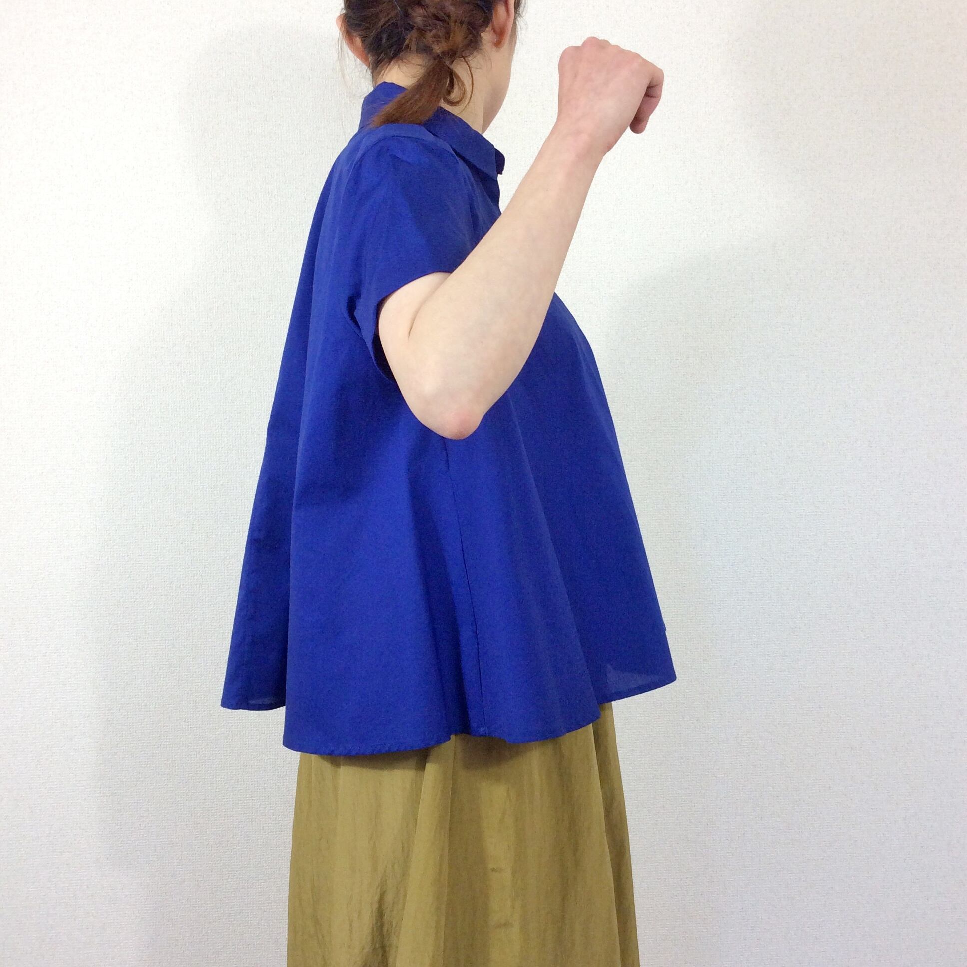 肩のラインや、首元はシンプルなブラウスですが、脇辺りから生地をたっぷり使い自然なフレアなラインが生まれます。