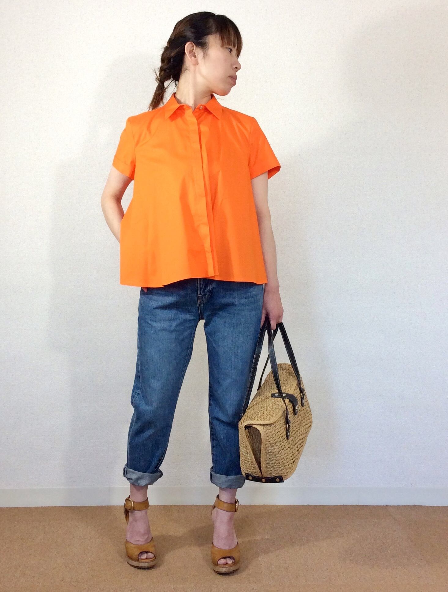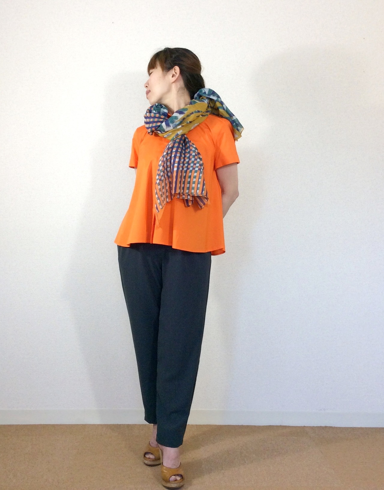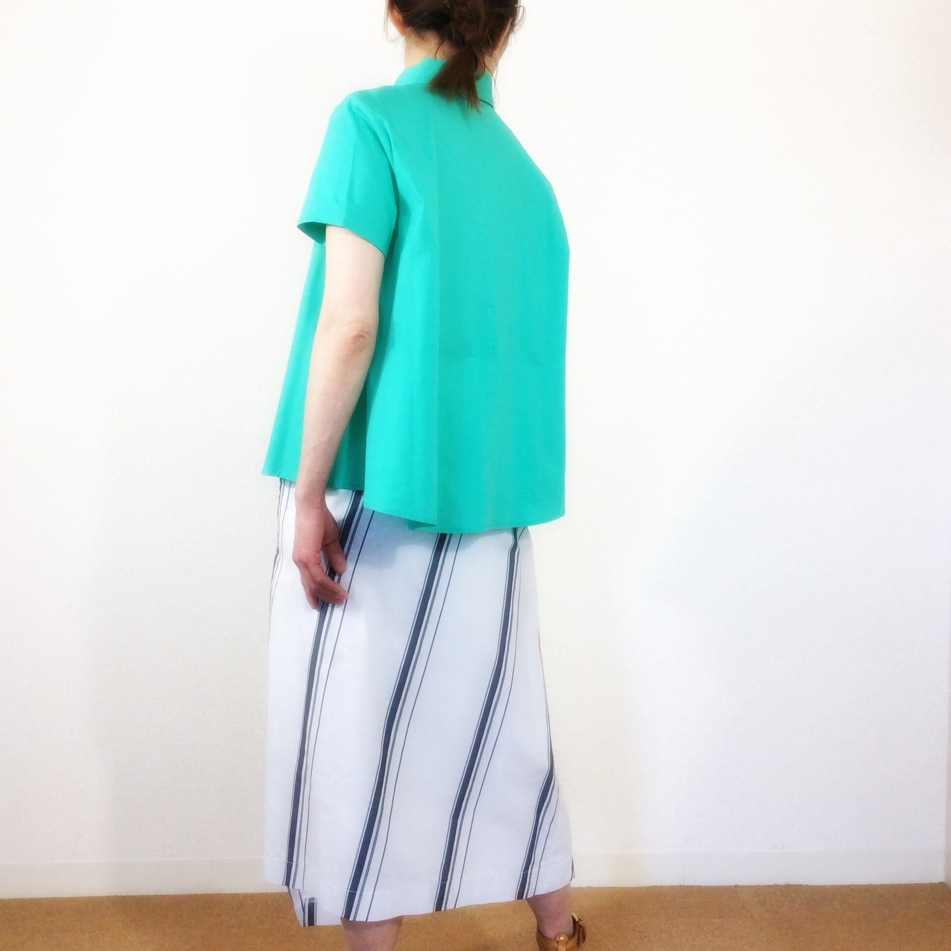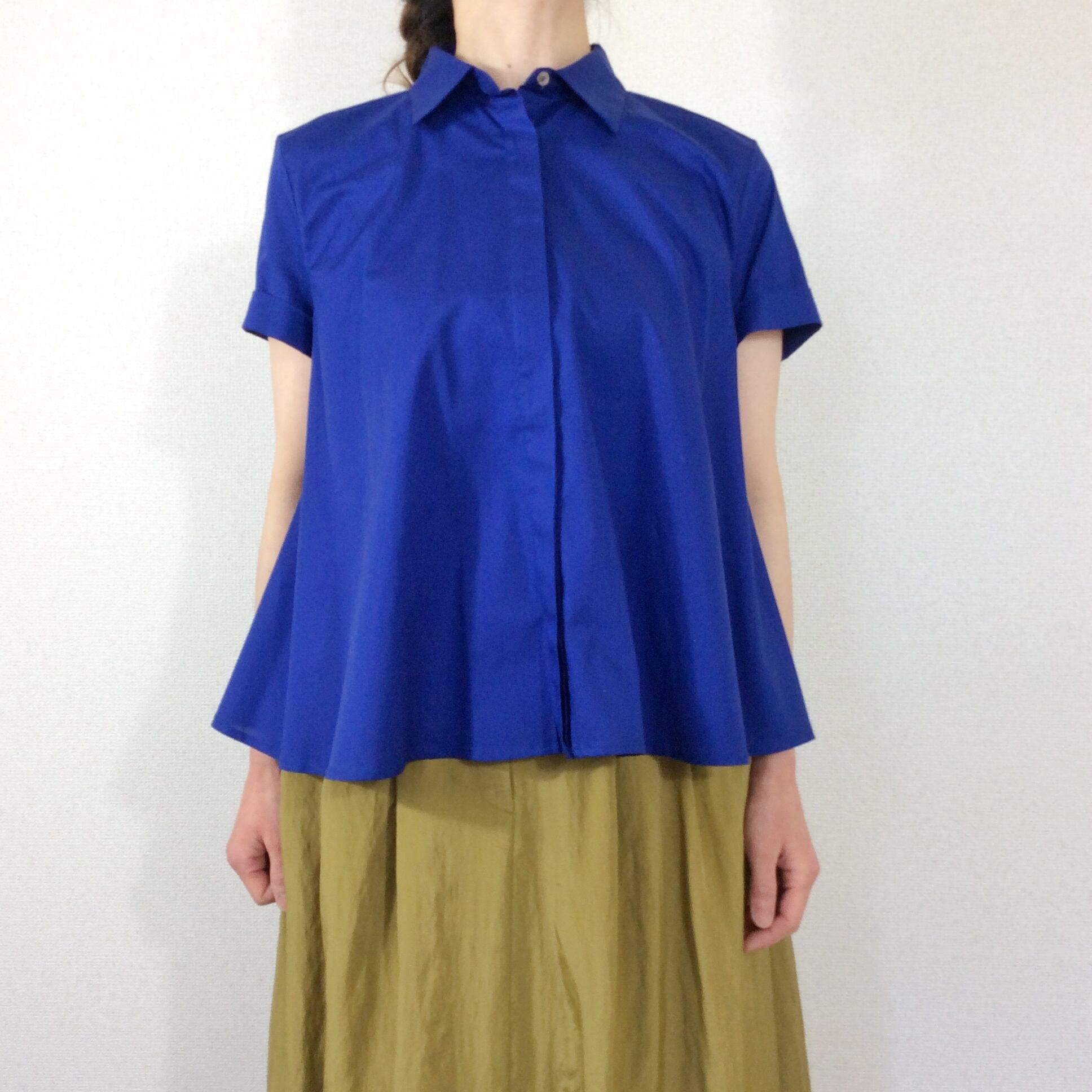 肩のラインや、首元はシンプルなブラウスですが、脇辺りから生地をたっぷり使い自然なフレアなラインが生まれます。