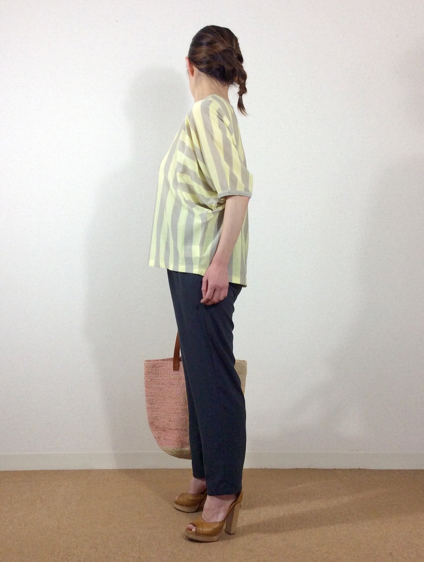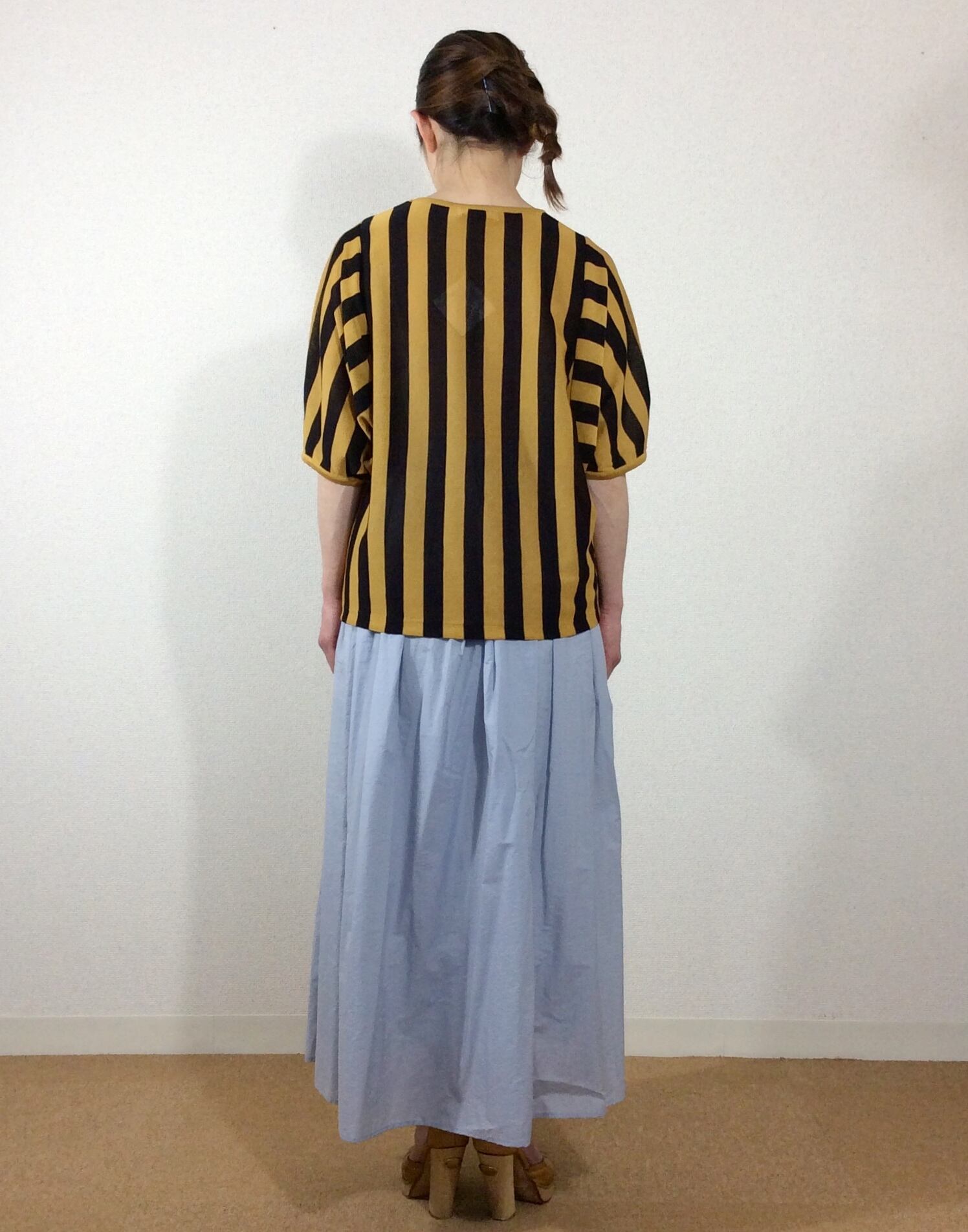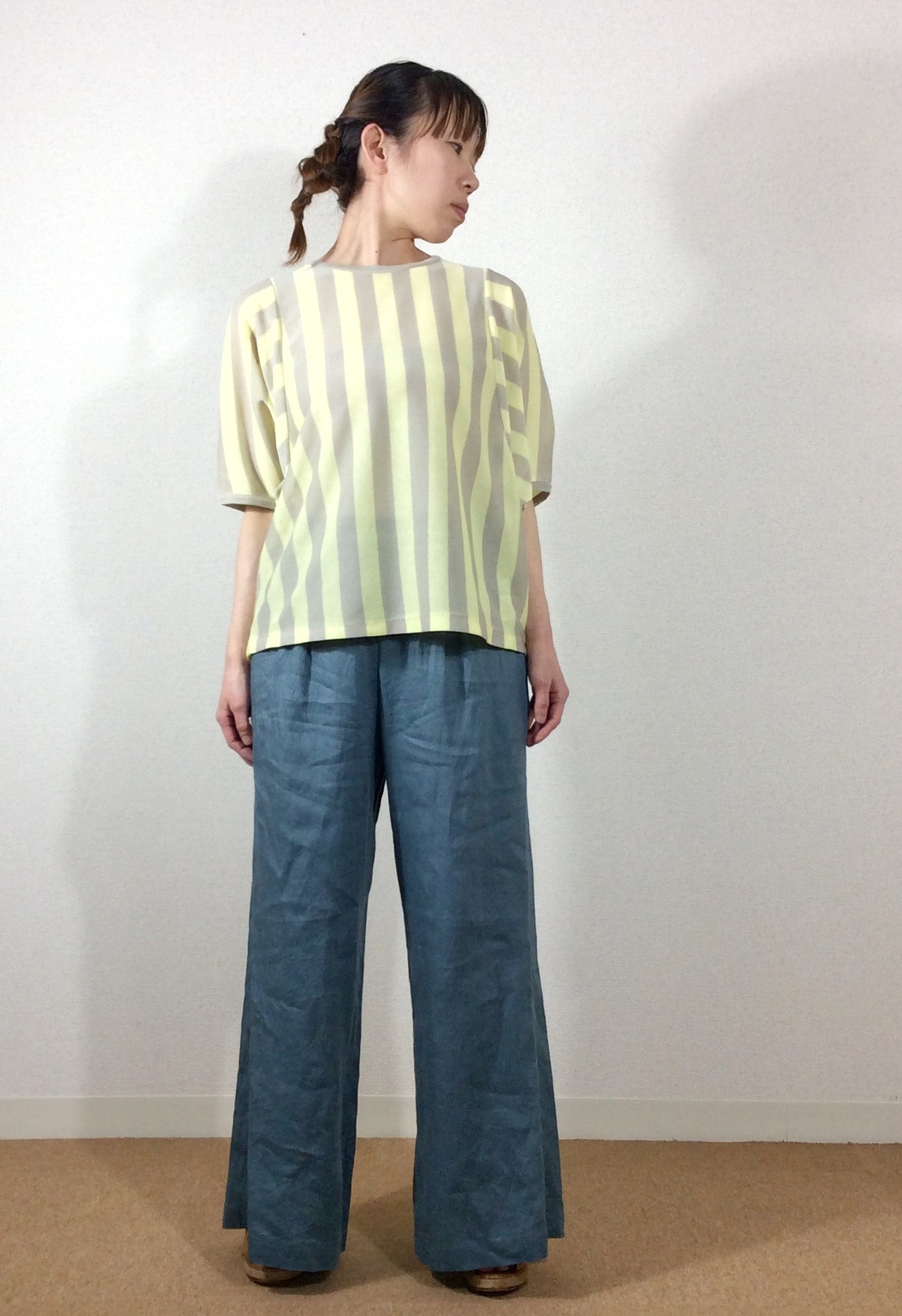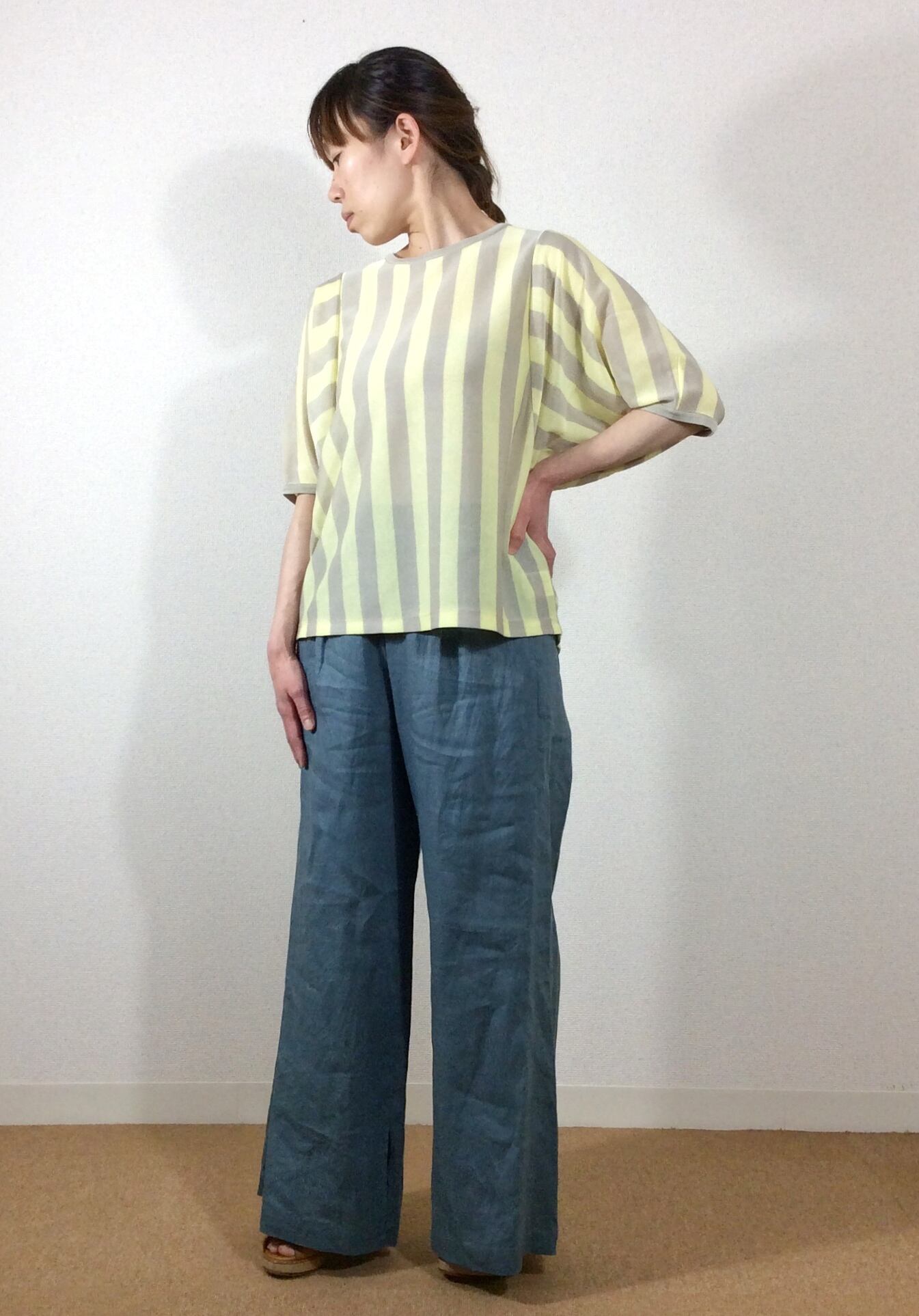 <Design Detail> 袖が身頃の中に入った付け方なので、縦のストライプとの相乗効果でゆったりしているのに、ボディーラインを細く見せます。