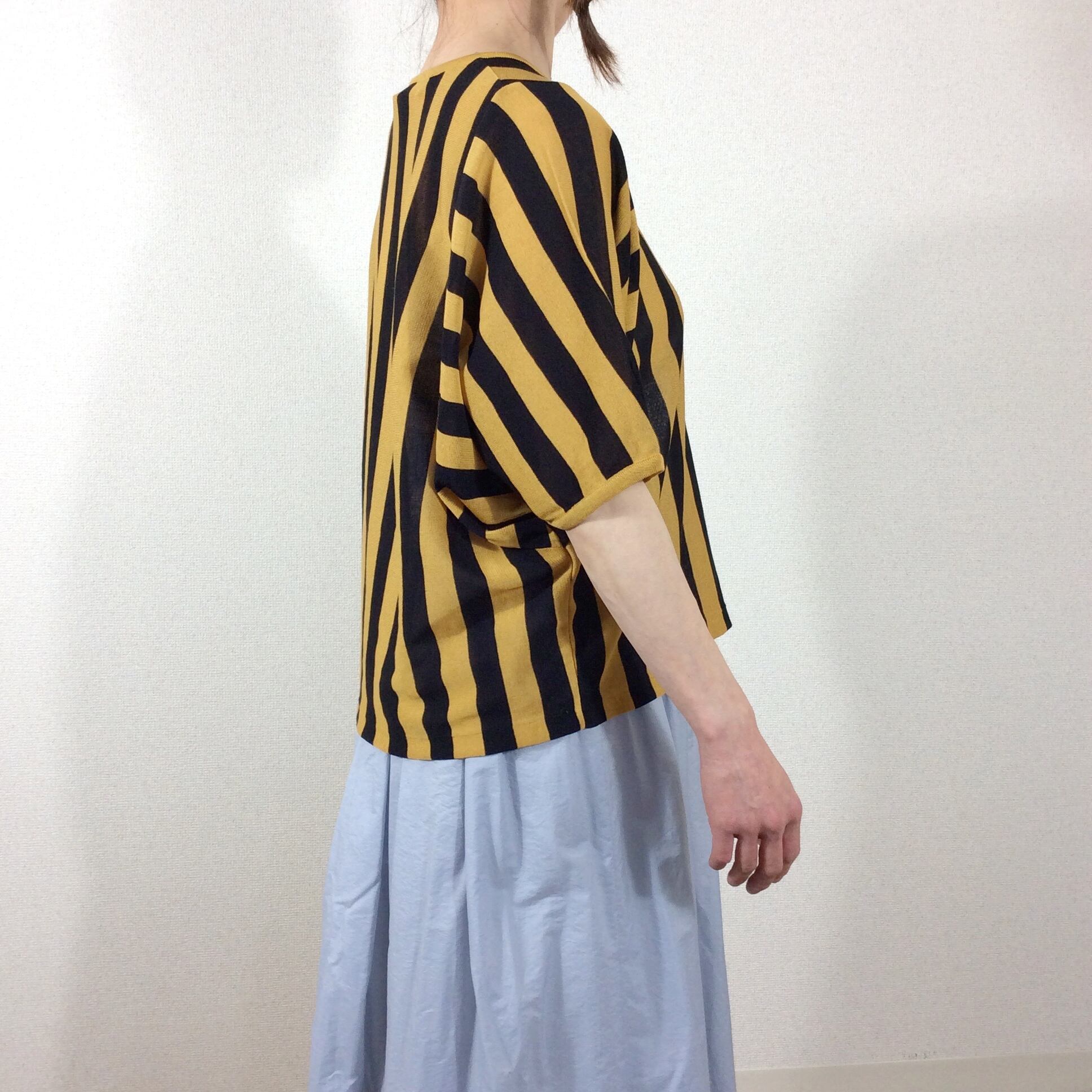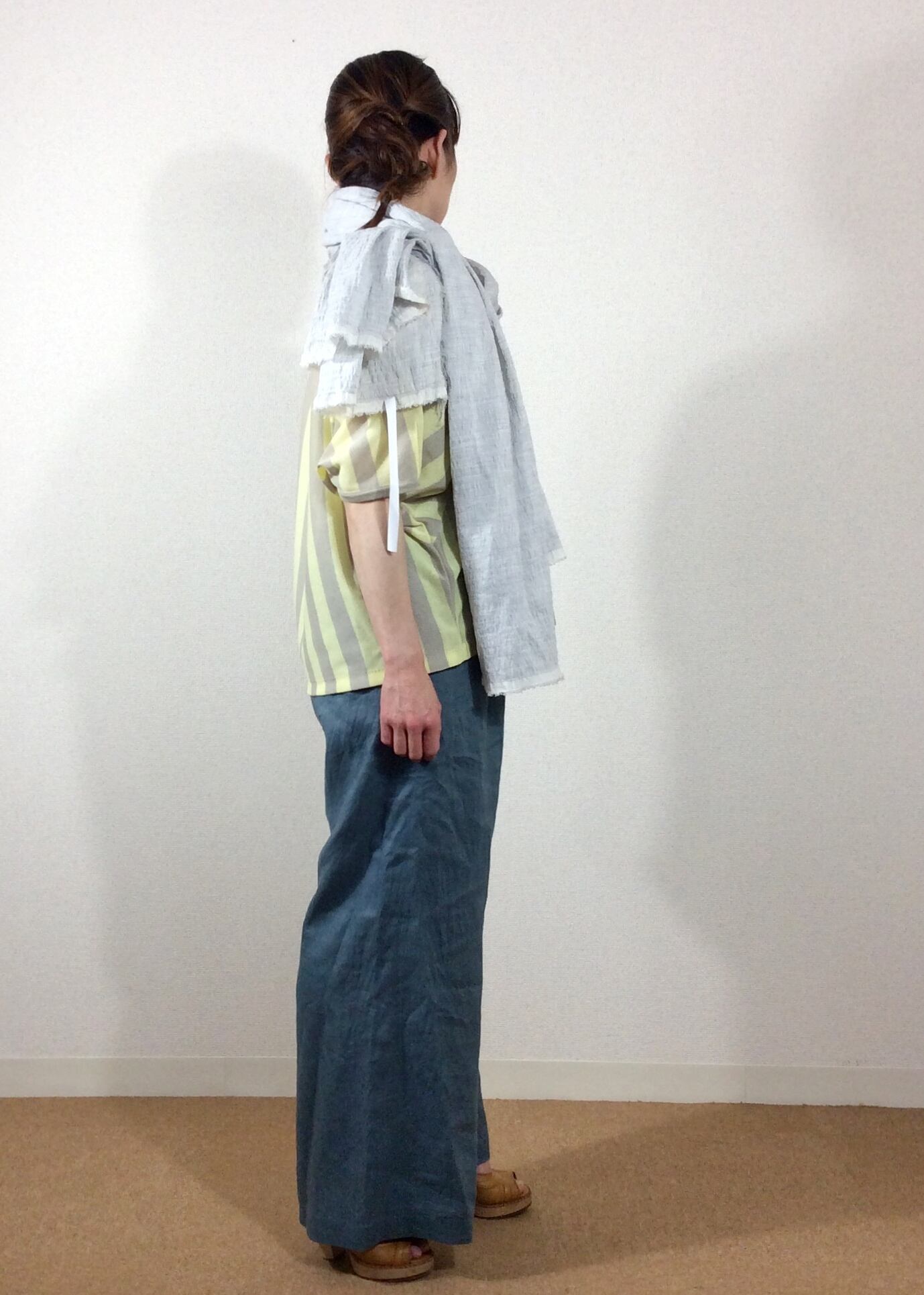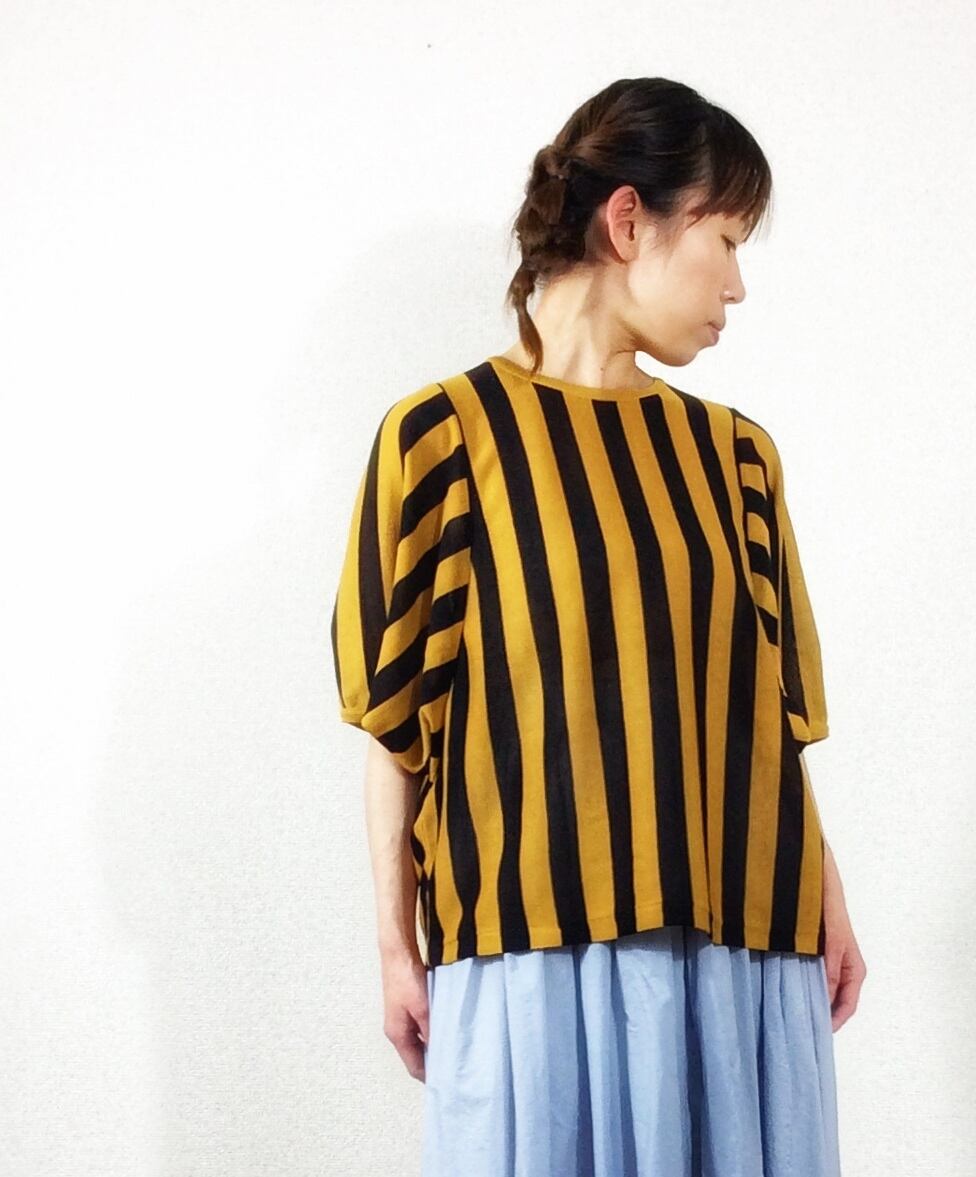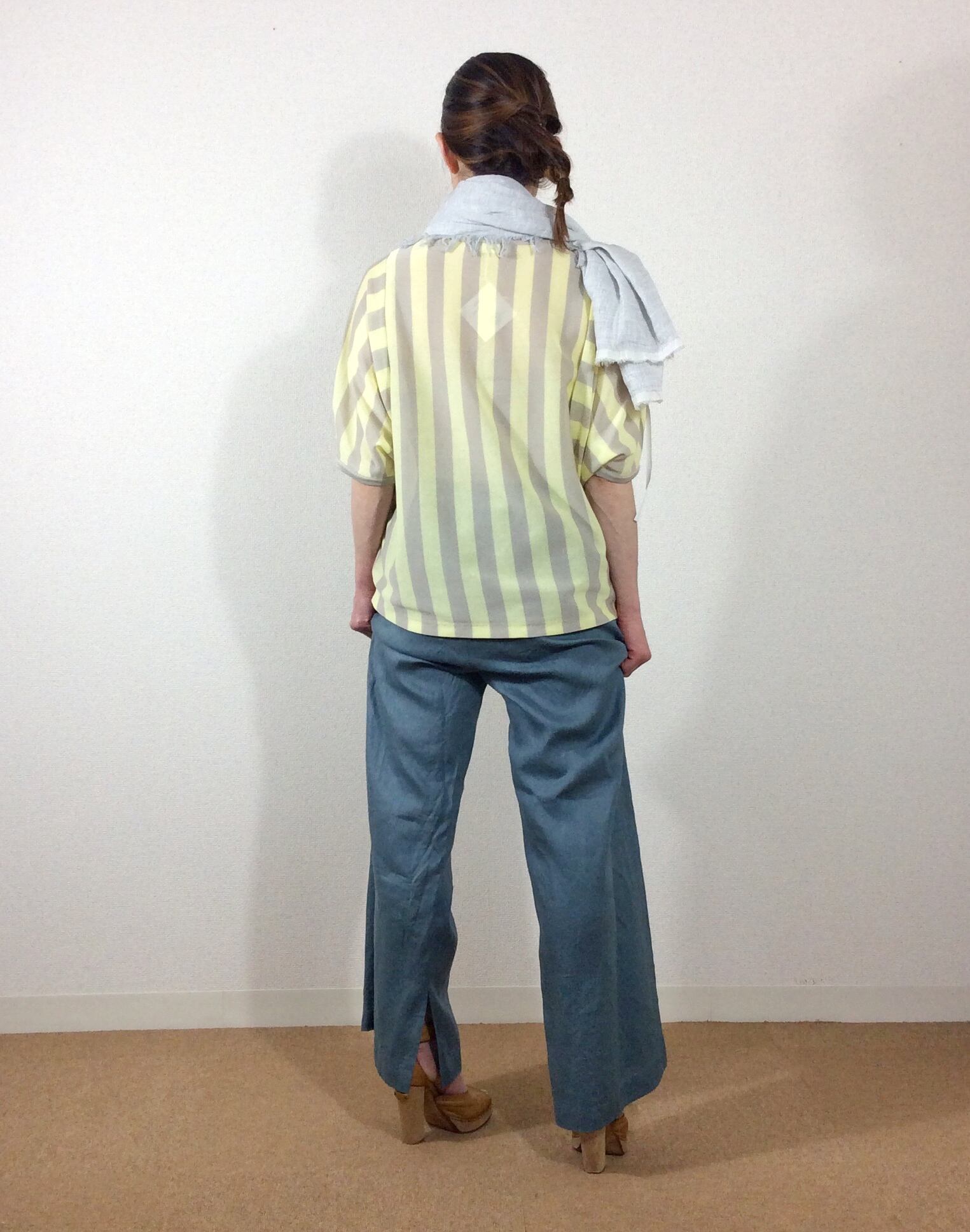 <Design Detail> 袖が身頃の中に入った付け方なので、縦のストライプとの相乗効果でゆったりしているのに、ボディーラインを細く見せます。