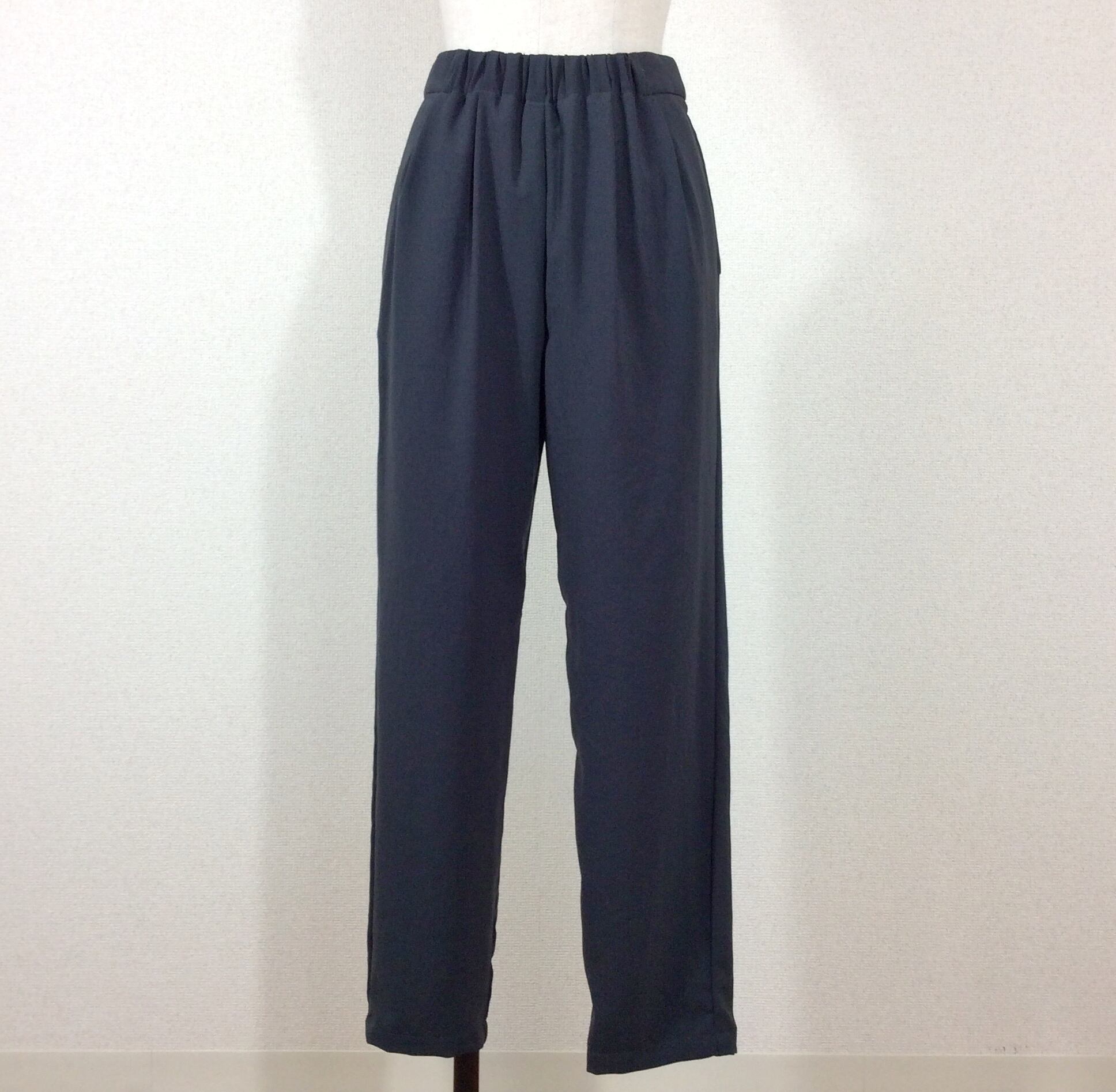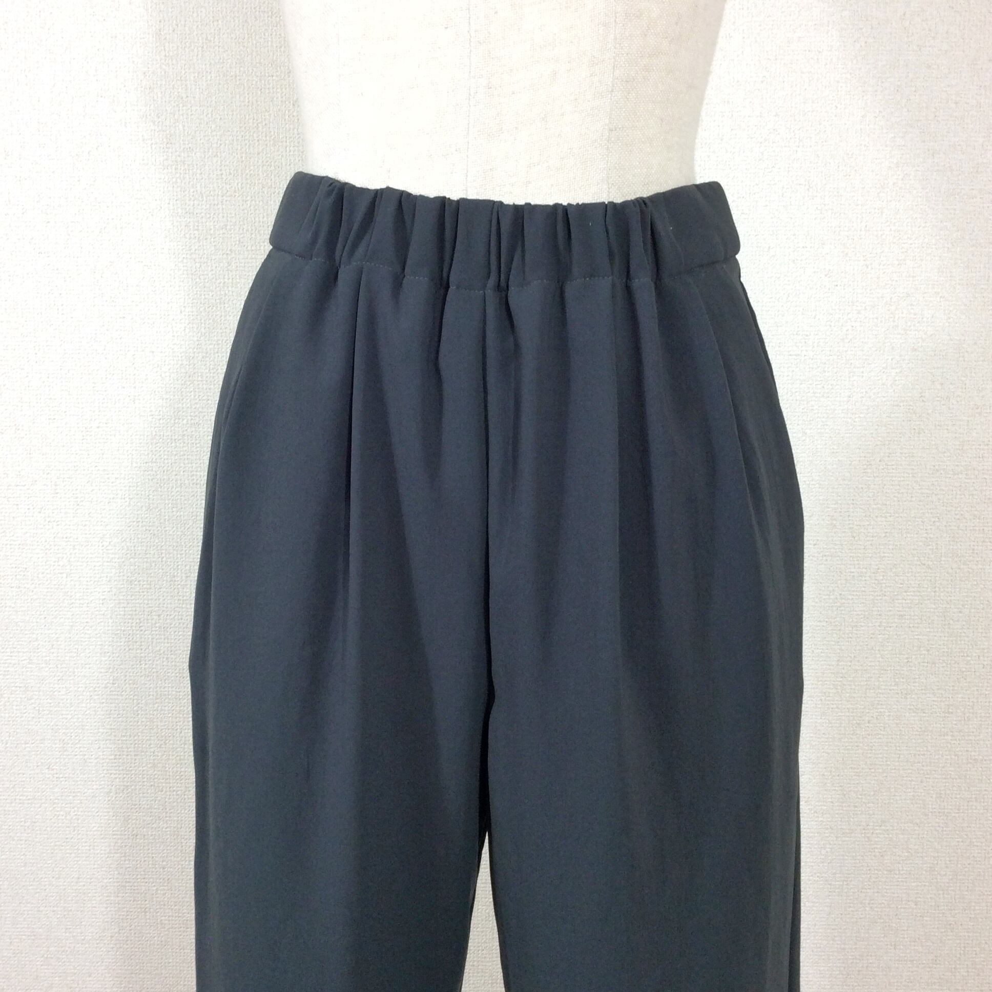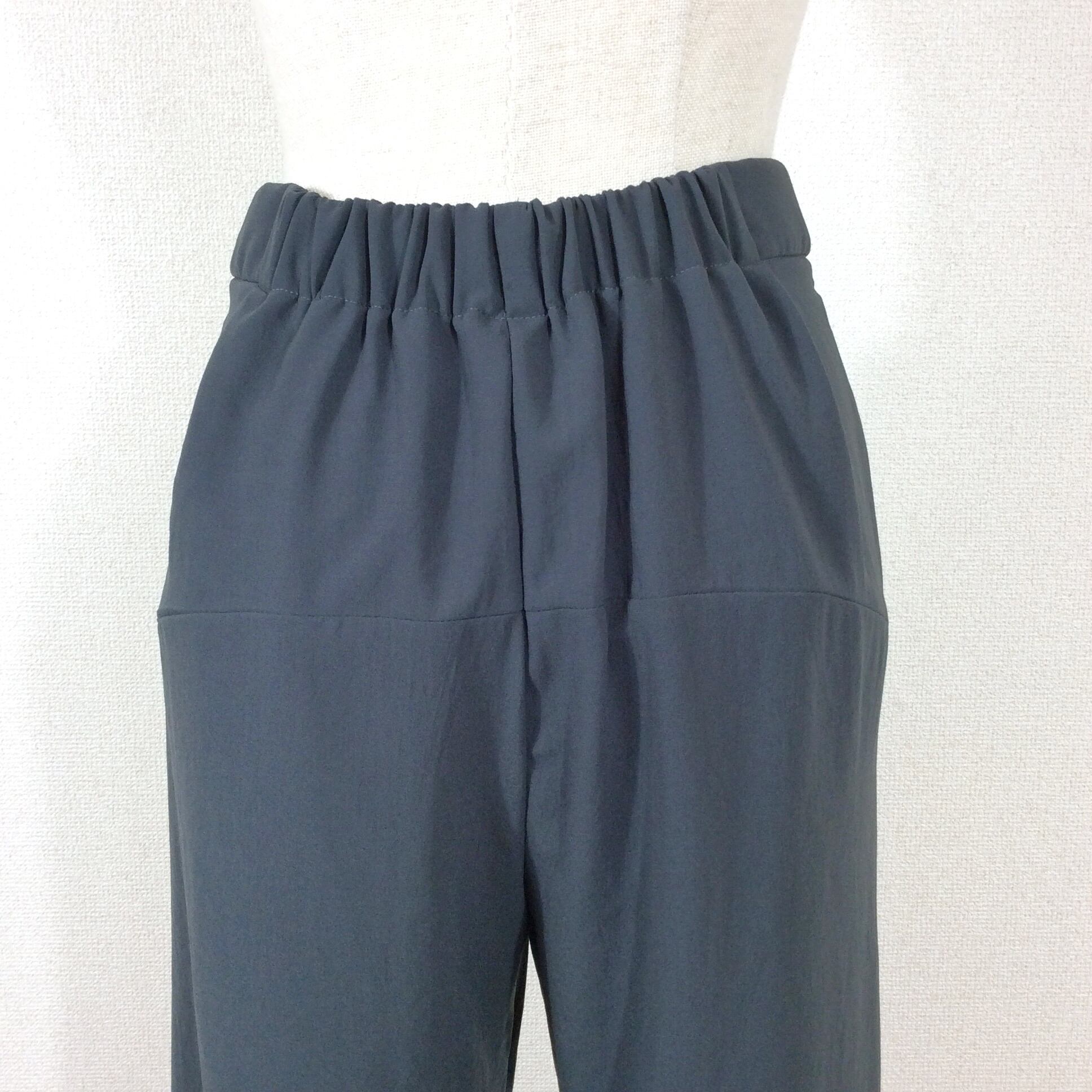 <Design Detail>総ゴムで楽ちん。落ち感のある生地にギャザーを寄せて太もも周りはゆったり。裾にかけて自然に細んくなるテーパードシルエット。