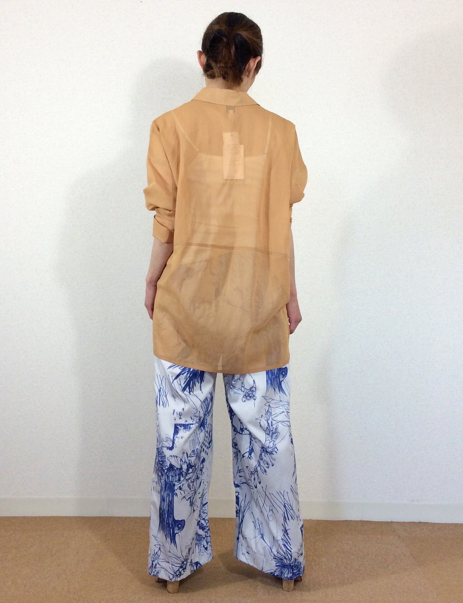 <Design Detail> 太ももからの深めのタックが縦のラインを強調し、細見えするワイドパンツ。手描きのイラストをプリントにしているので、大柄なのにケバケバしい感じは一切なく、コーデしやすいと思います。地の色は、真っ白というより、少しグレーがかっているので、透けはほぼ気になりません。