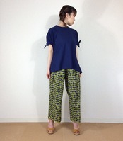 黄色のパンツとコーデしている短めのブルーブラウスはこちら
