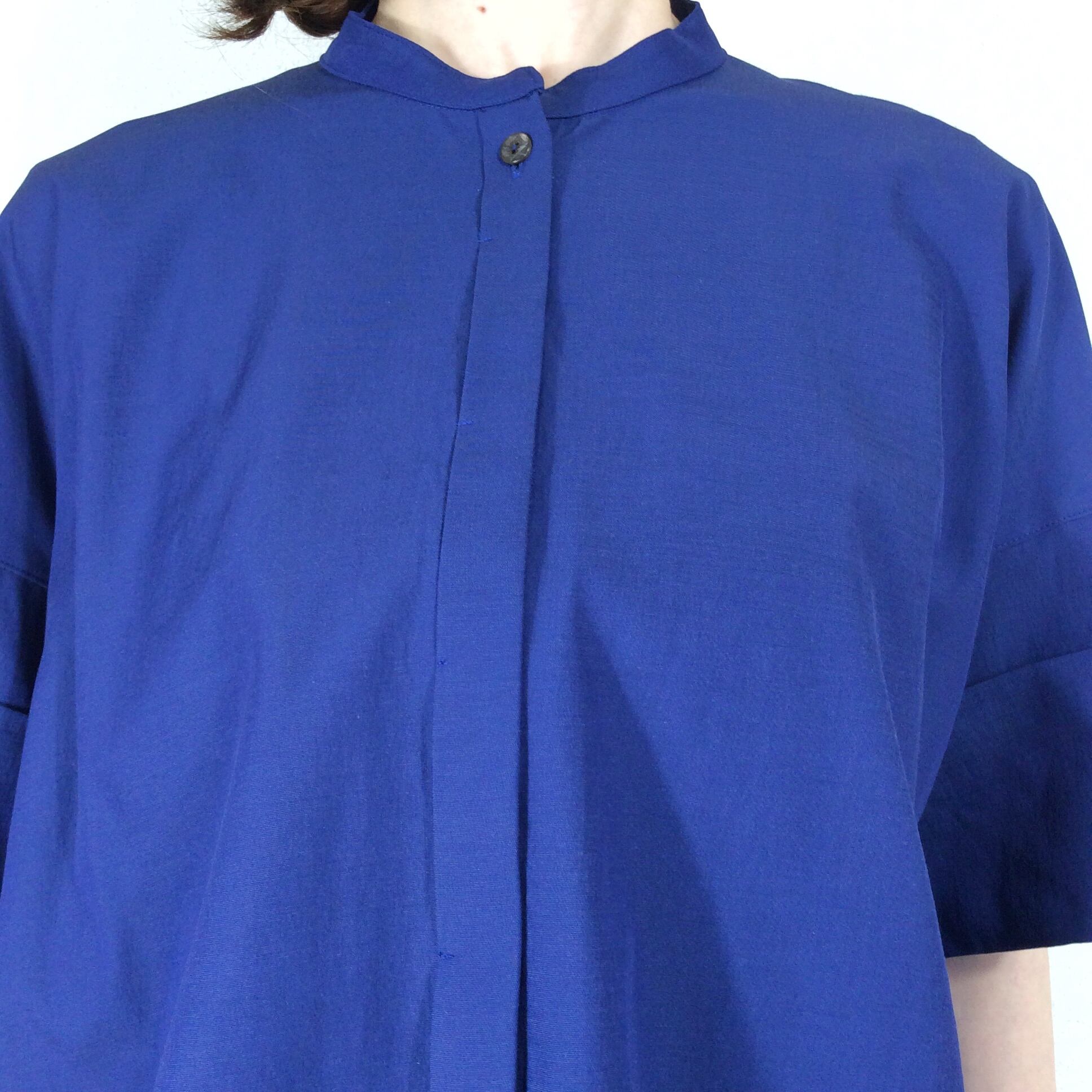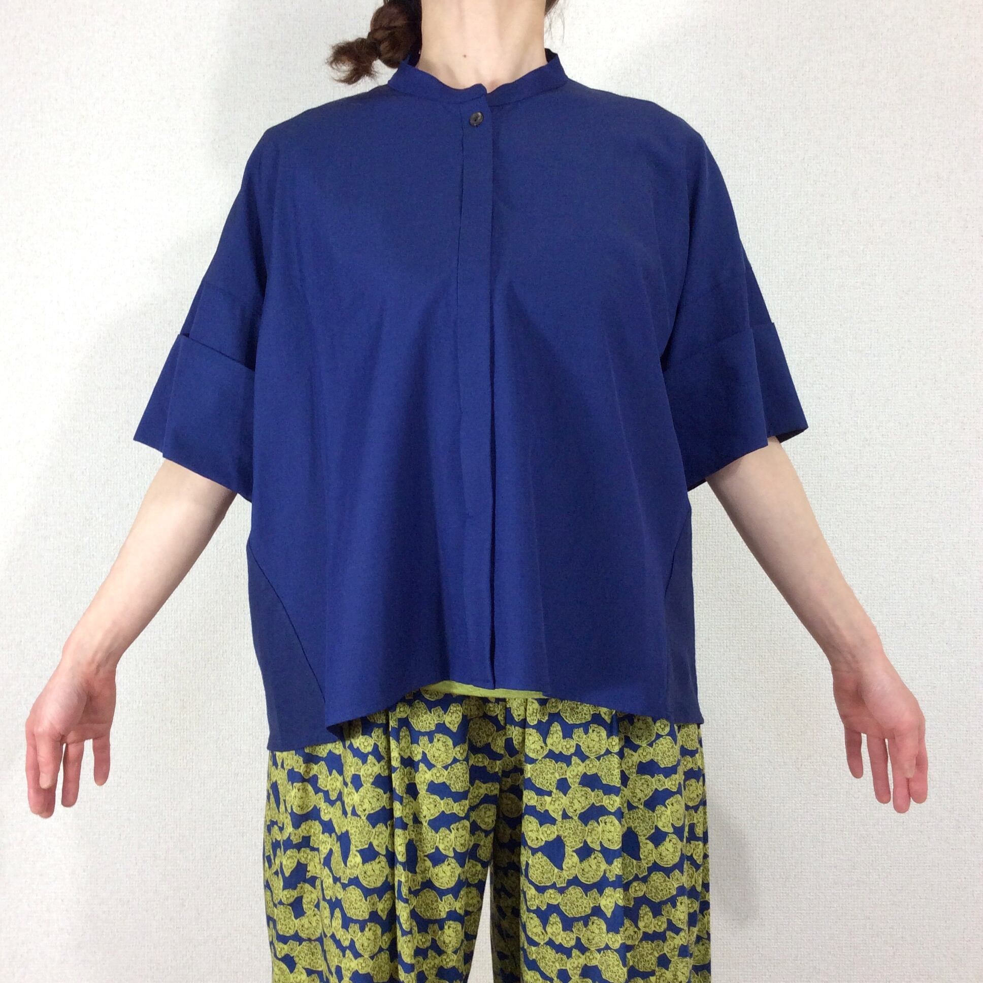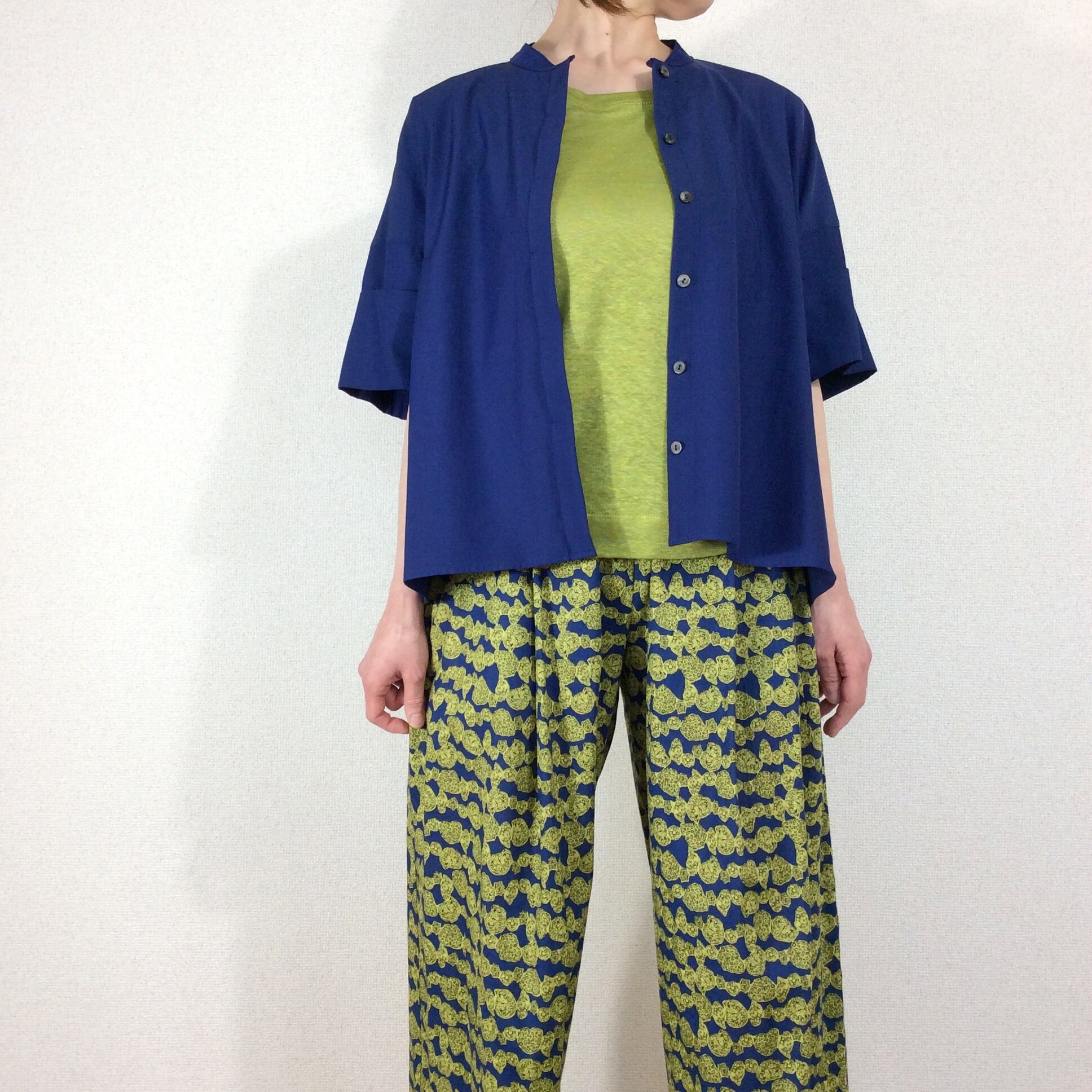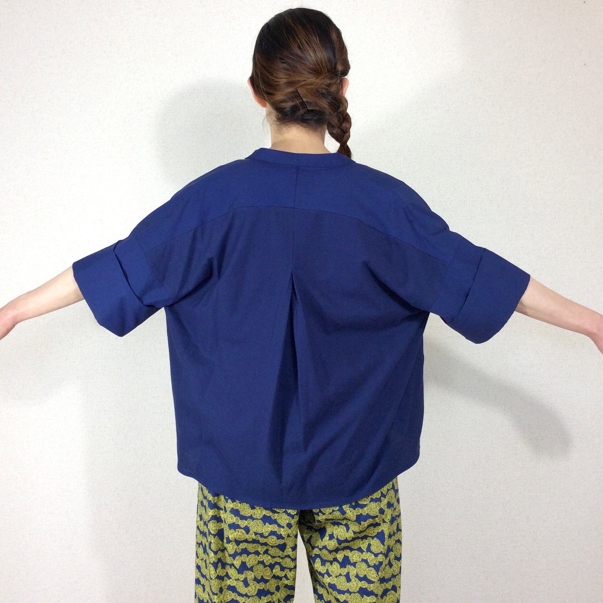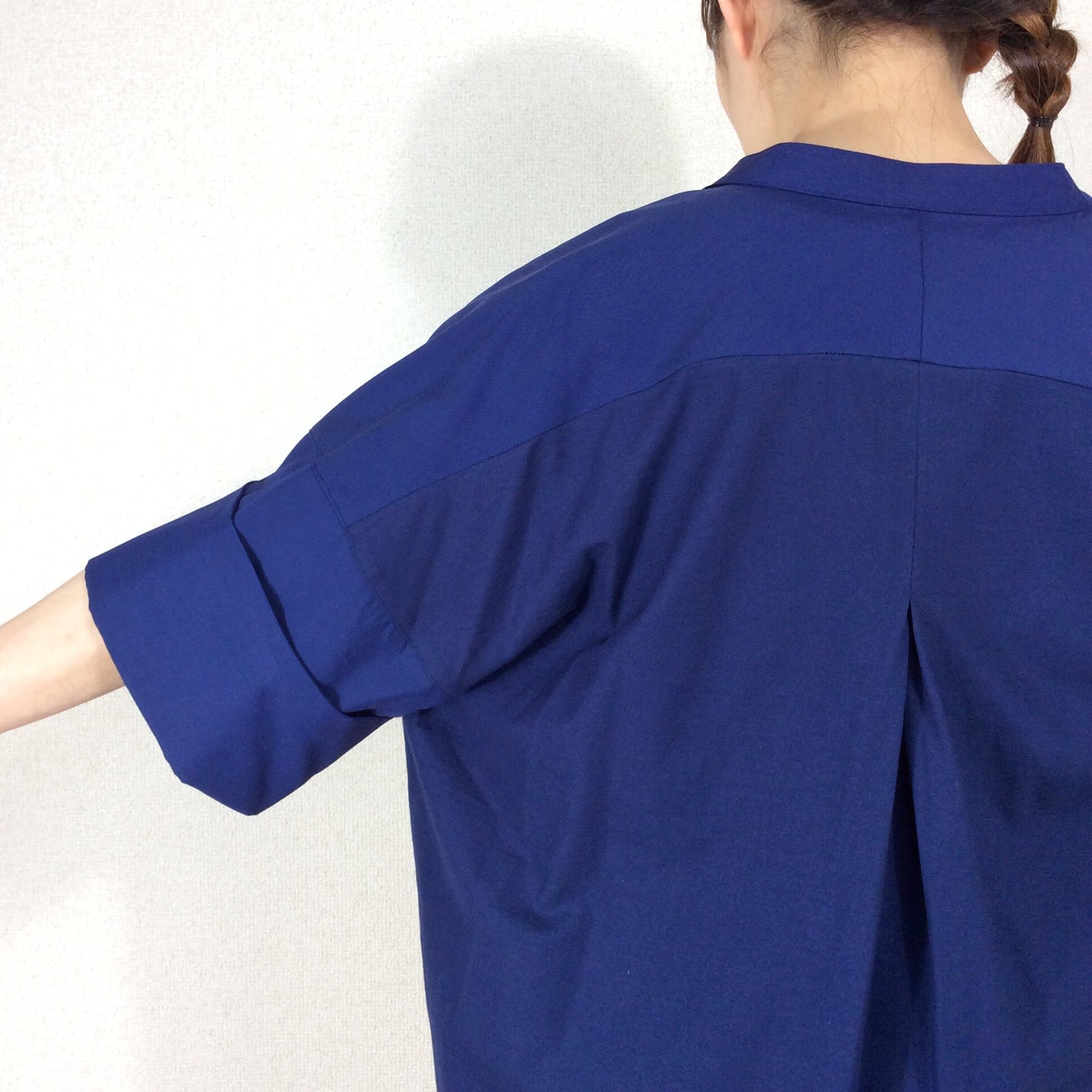 <Design Detail> 前身ごろはストレッチの効いたブラウス素材。後ろは、Tシャツ素材のドッキングTop。 ボタンは比翼になっています。真夏前までと、晩夏~10月中くらいまで活躍しそう。前身頃の生地には適度な重みもあるので、開けっぱなしで羽織としてお使いの時に、カーディガンのようにパカパカしずらく収まりが良いです。