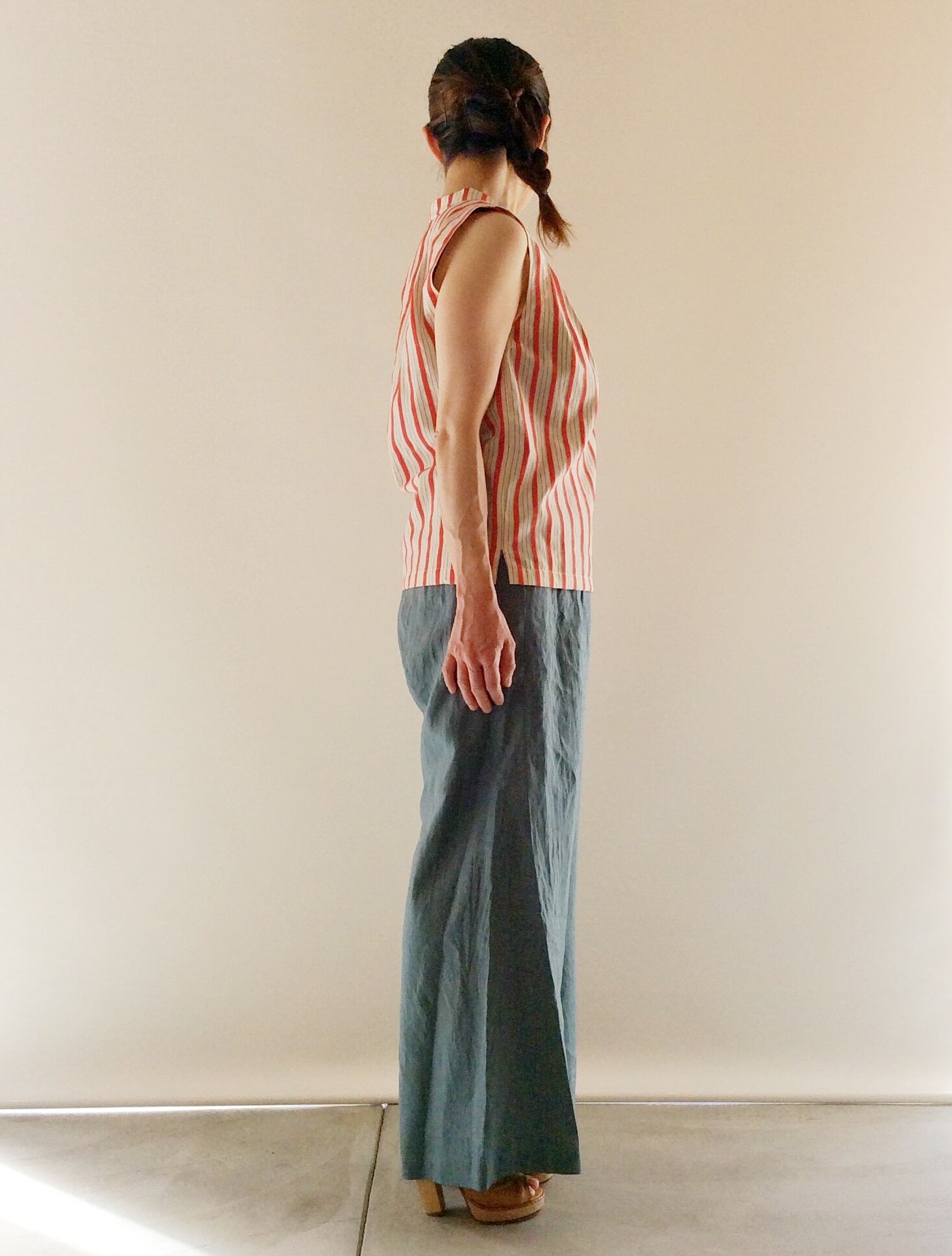 <Design Detail> 両サイドにポケットのあるシンプルなワイドストレートパンツ。ツータックで前にはジッパーなどはなくスッキリ。 ウエスト後ろ部分はゴム。インサイドの裾に15㎝のスリット。
