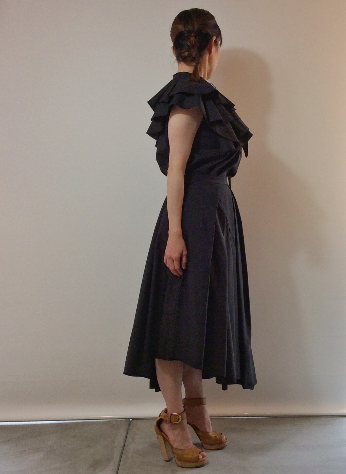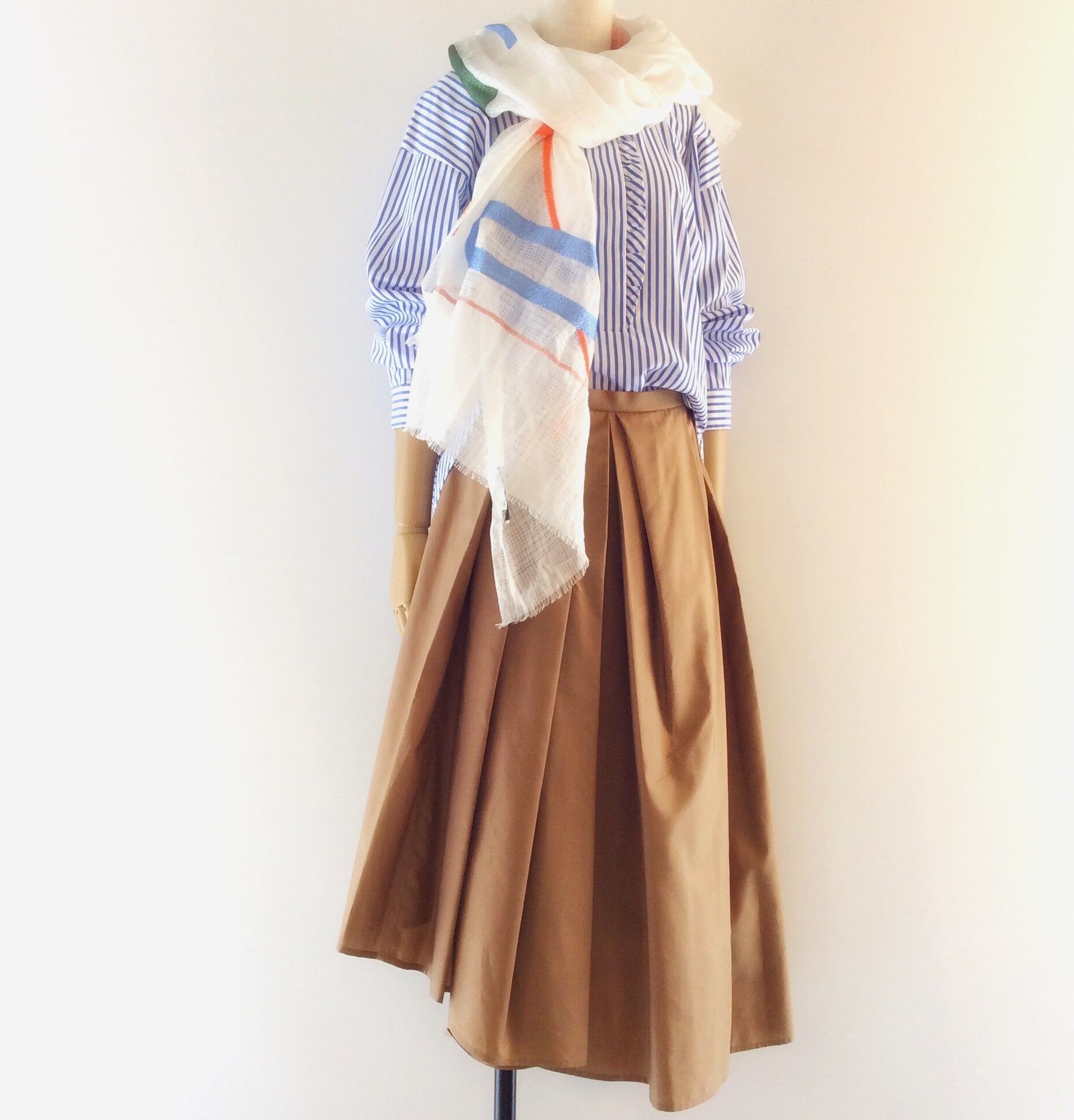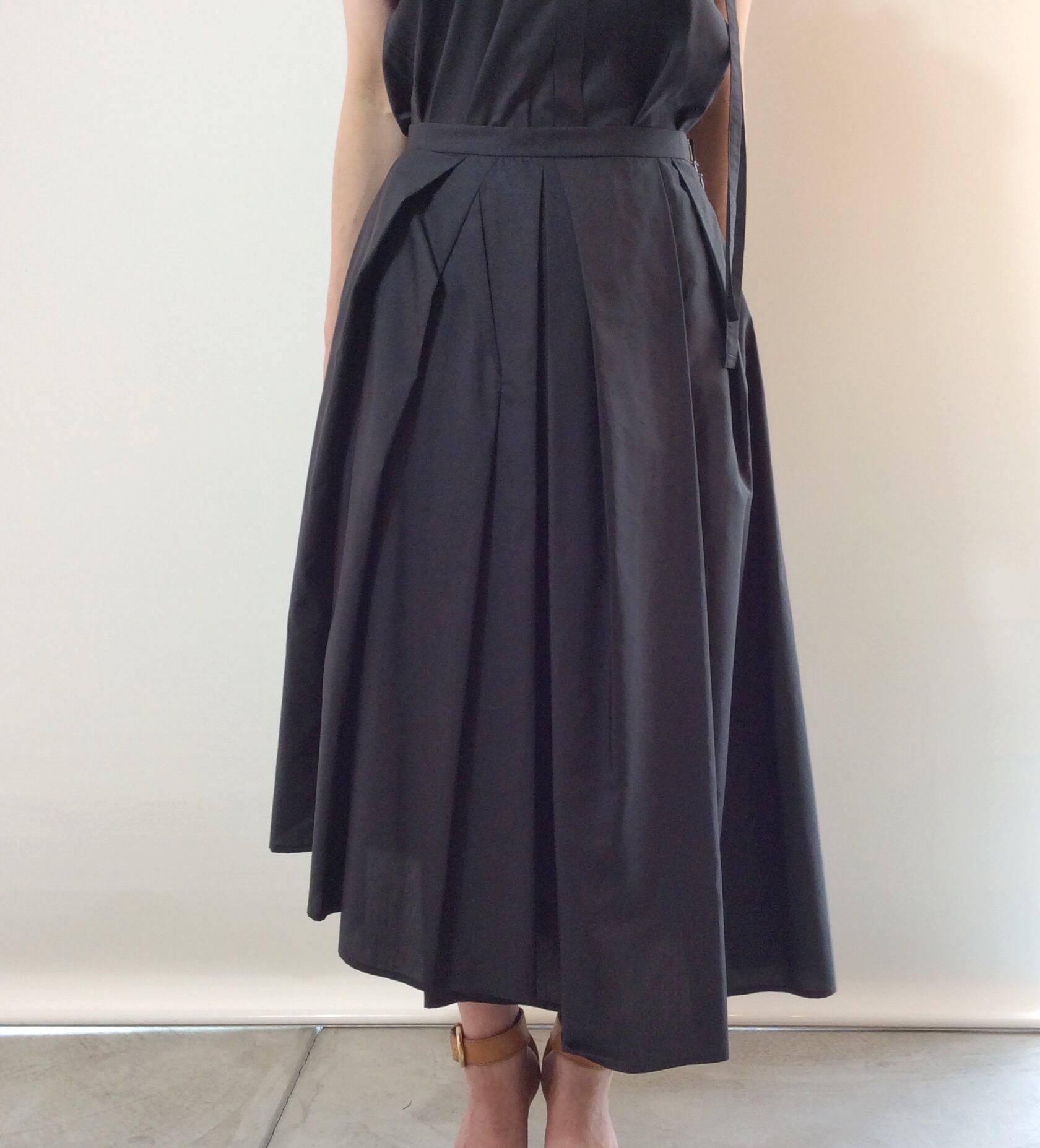 <Design Detail> 360度どこから見ても美しいスカート! 生地はシルク混で程よい光沢があるタイプライター生地(ちょっと張りのある生地)。ランダムな太さに入ったタックやアシンメトリーな形で、動いた時の陰影もより華やかに。