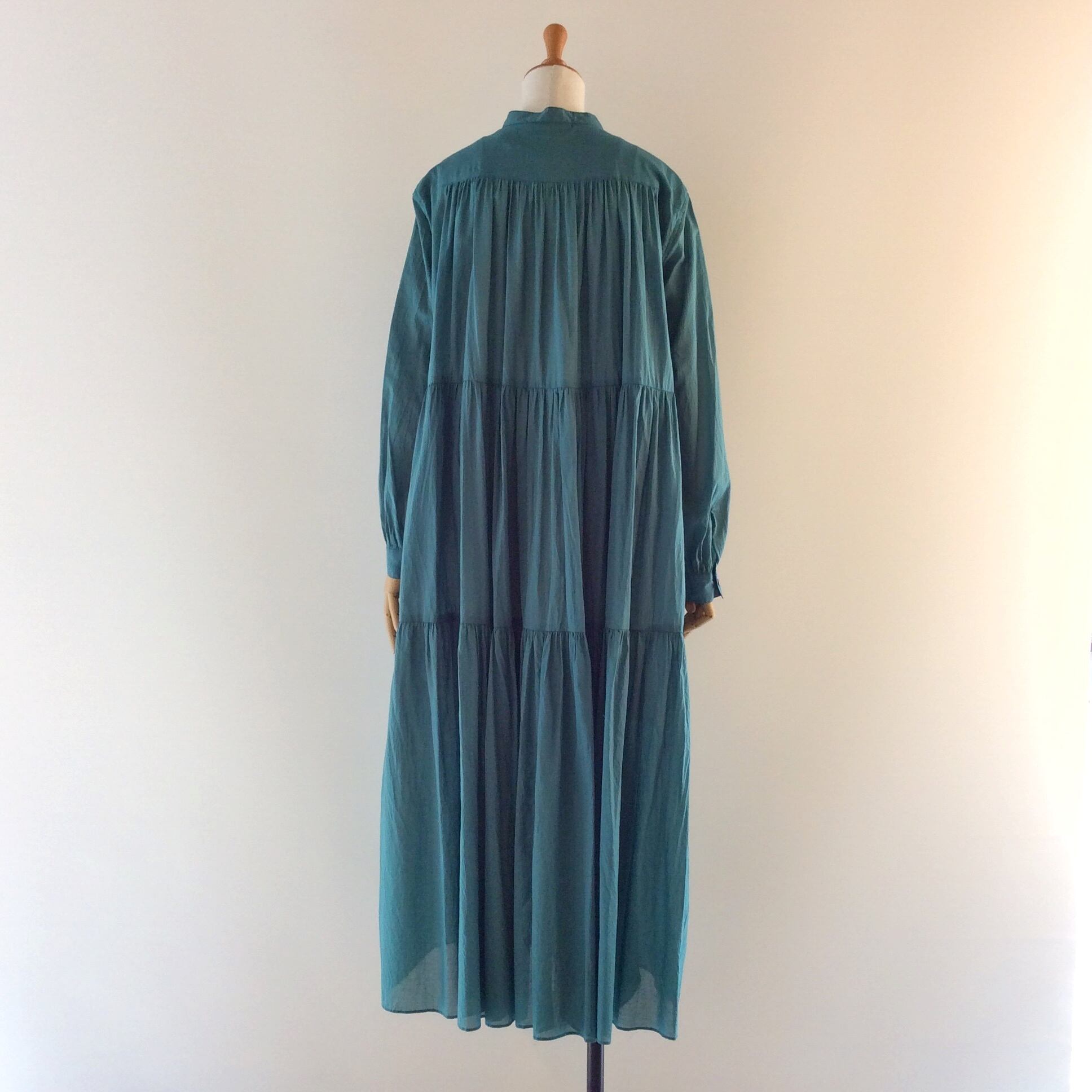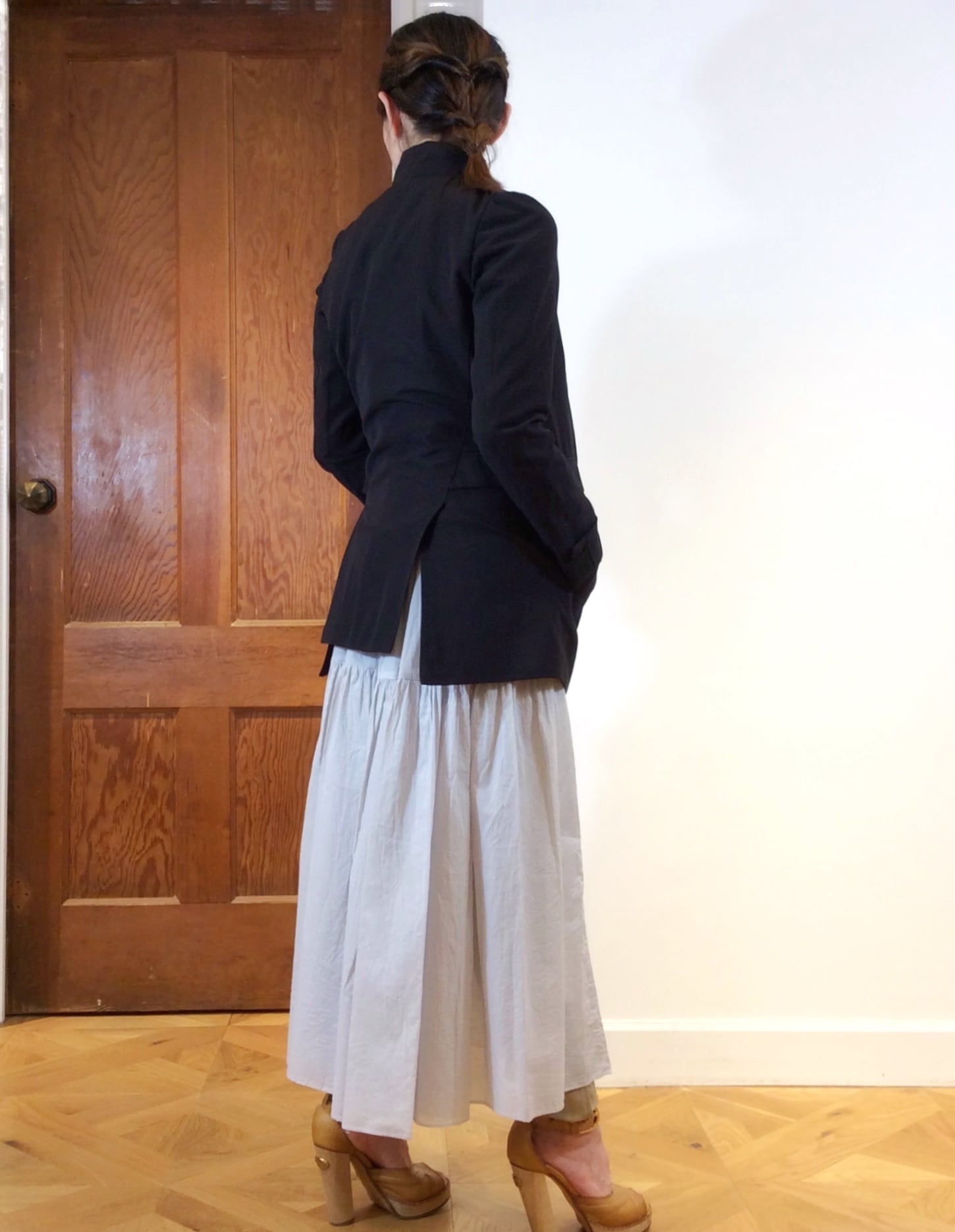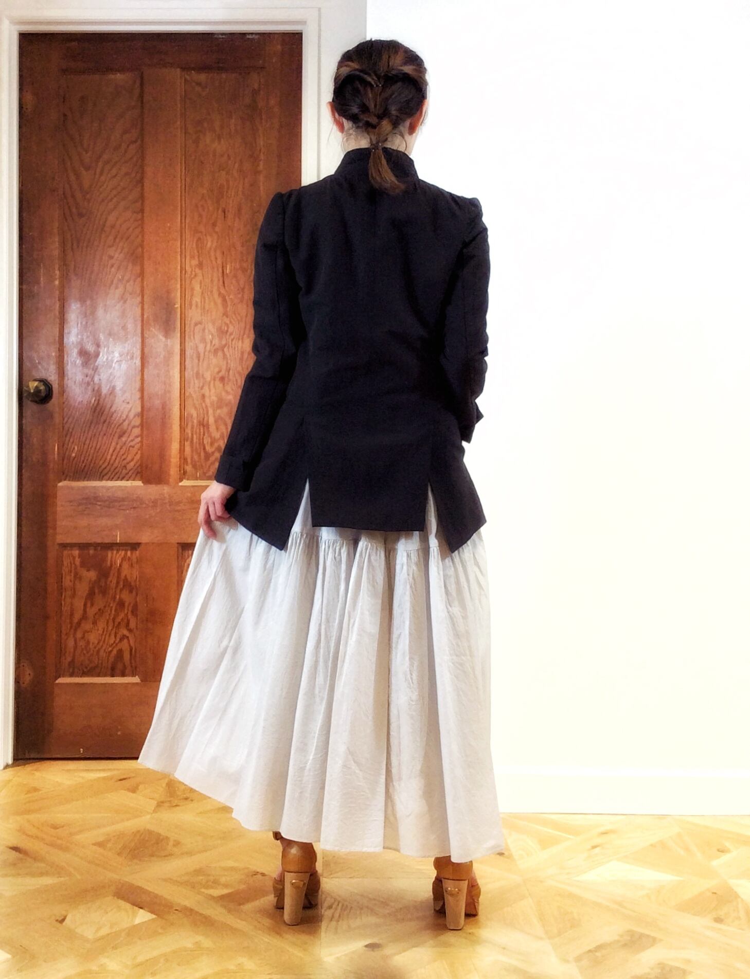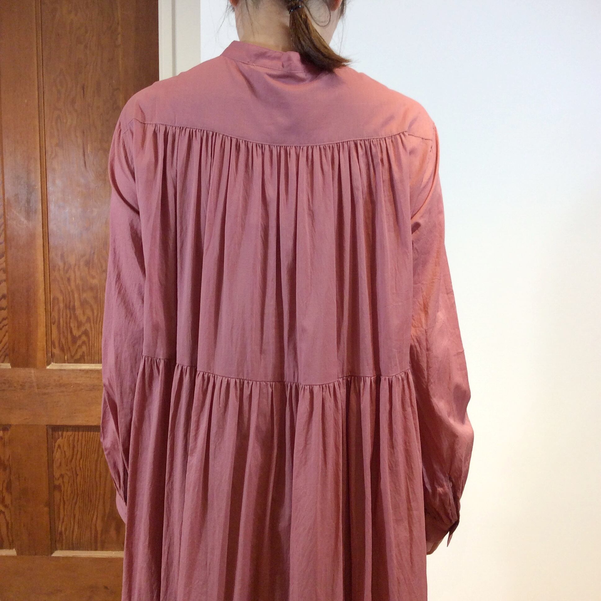 <Design Detail> 前はシンプルな詰まった丸首、後ろは贅沢にギャザーを寄せたティアードタイプでボリューミー。ボディーはとてもゆったりとしていますが、肩幅はドロップしていないのと、脇の縫い目が前に入っているので、大きく見え過ぎない配慮が。