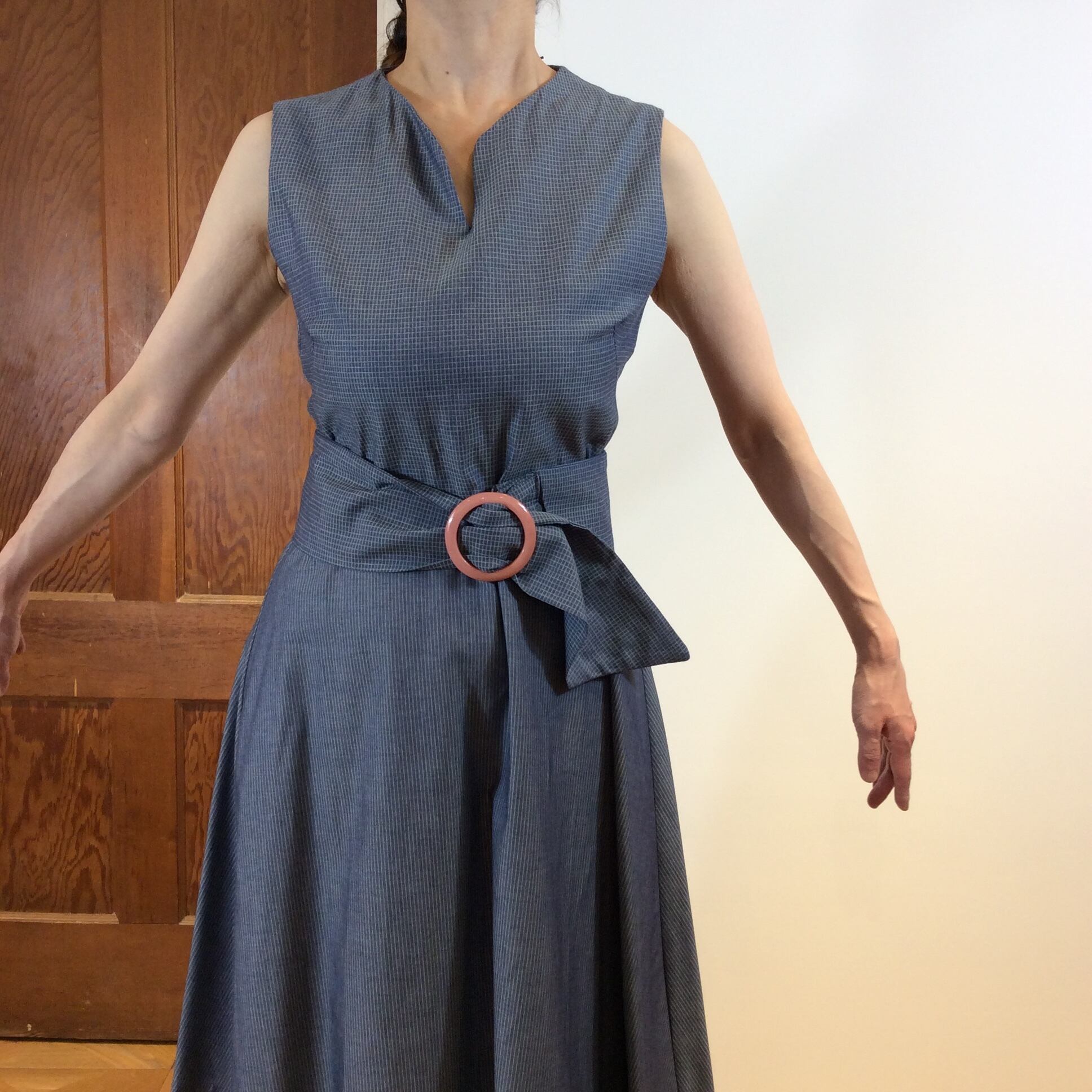 トップスとベルトの生地は細かなチェック、スカート部分は細かなピンストライプ。