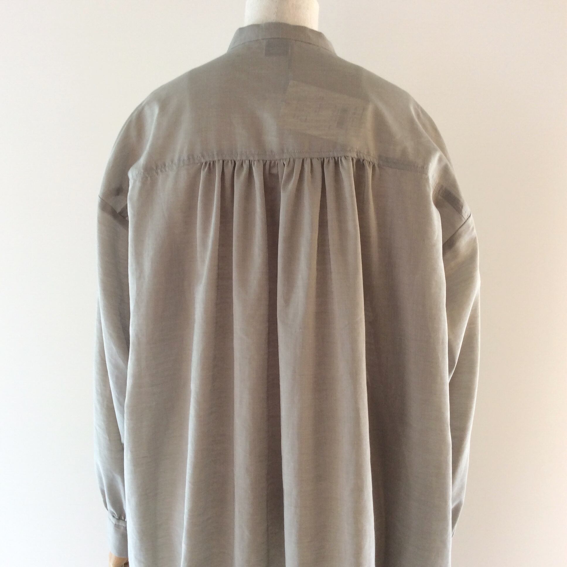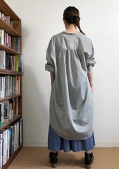 背中のギャザーで膨らませて、ウエスト下で切り替のの縫い目を入れることで、たまご型ですっきり見せるコクーンシルエットに。