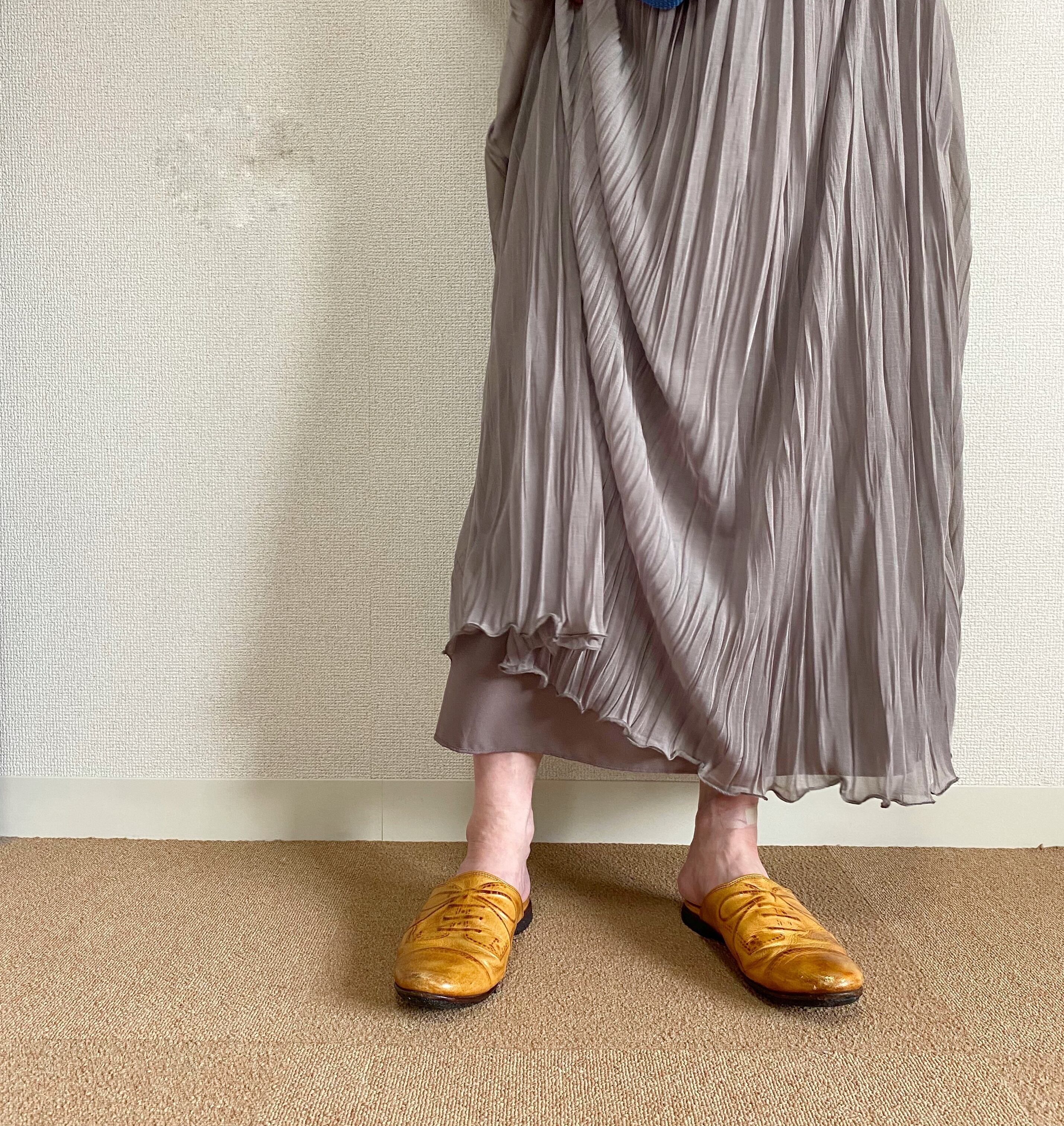 <Design Detail> 光沢が上品なギャザースカート。向きや幅がランダムなギャザーに更にシワ加工が施されています。