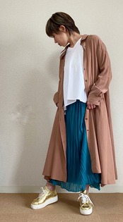 <Coordinate tips> 綺麗めに着るよりも、ルーズなニットやスニーカーなどでカジュアルに着崩すのがお勧め。ワンピの下から少し見せるのも今年らしい。
