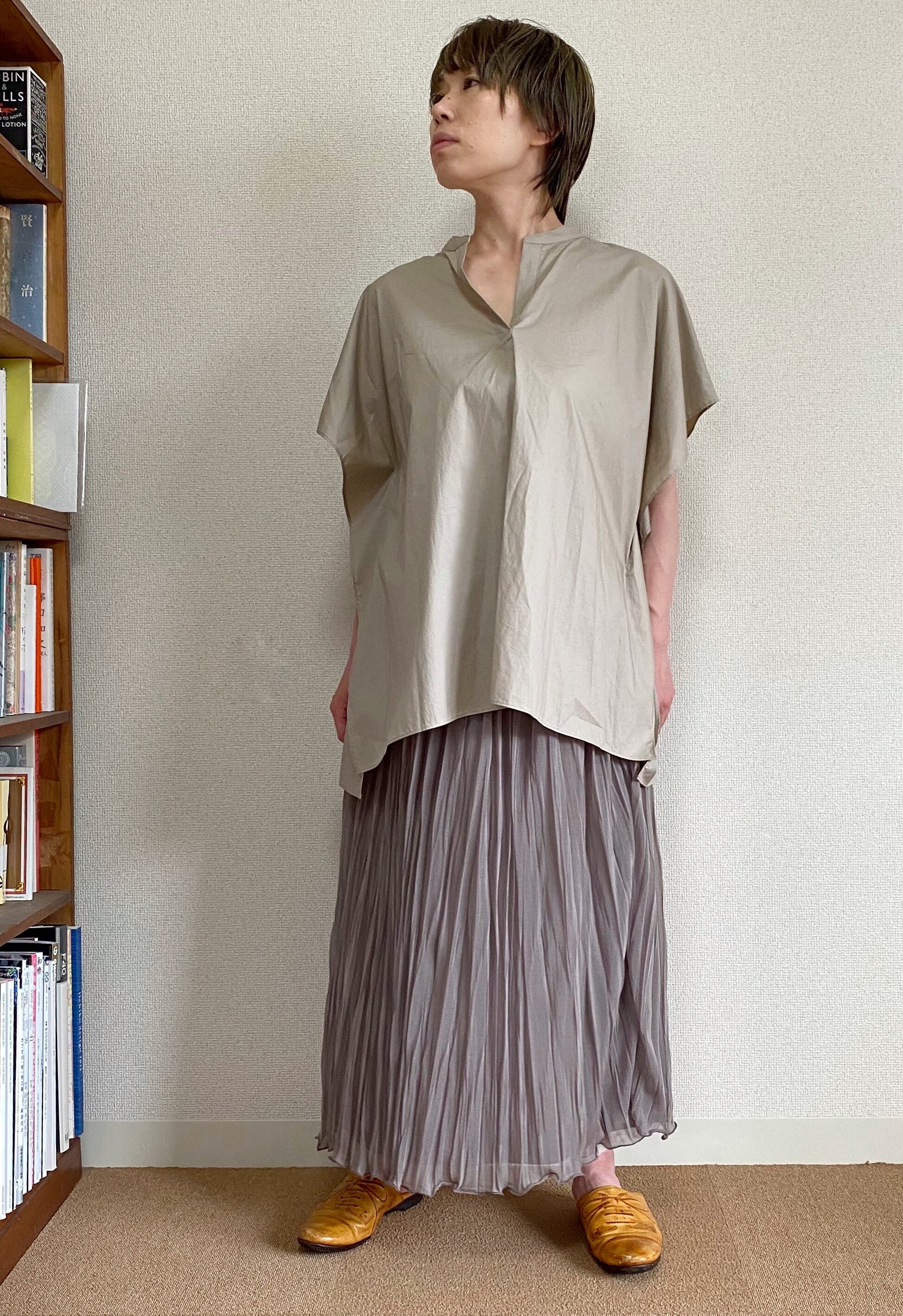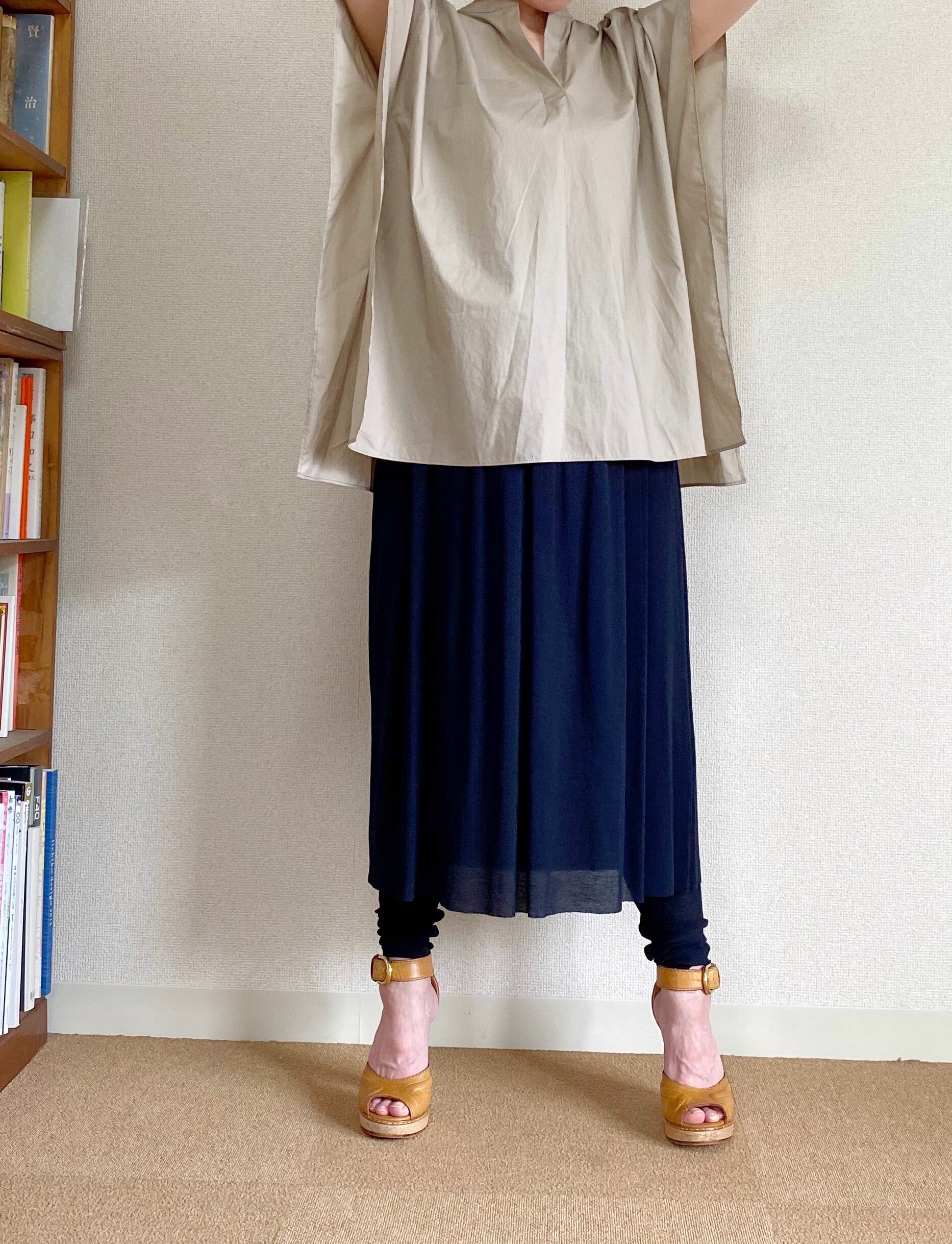 <Coordinate tips>細身のテーパードパンツは王道ですが、脇にスリットがあるので落ち感のあるロングスカートとも相性良し。ただ、ブラウスの素材に張り感があるので、スカートはとろんと落ち感のあるものがベター。くるぶし上の丈なら、キュロットとも合わせられますよ。
