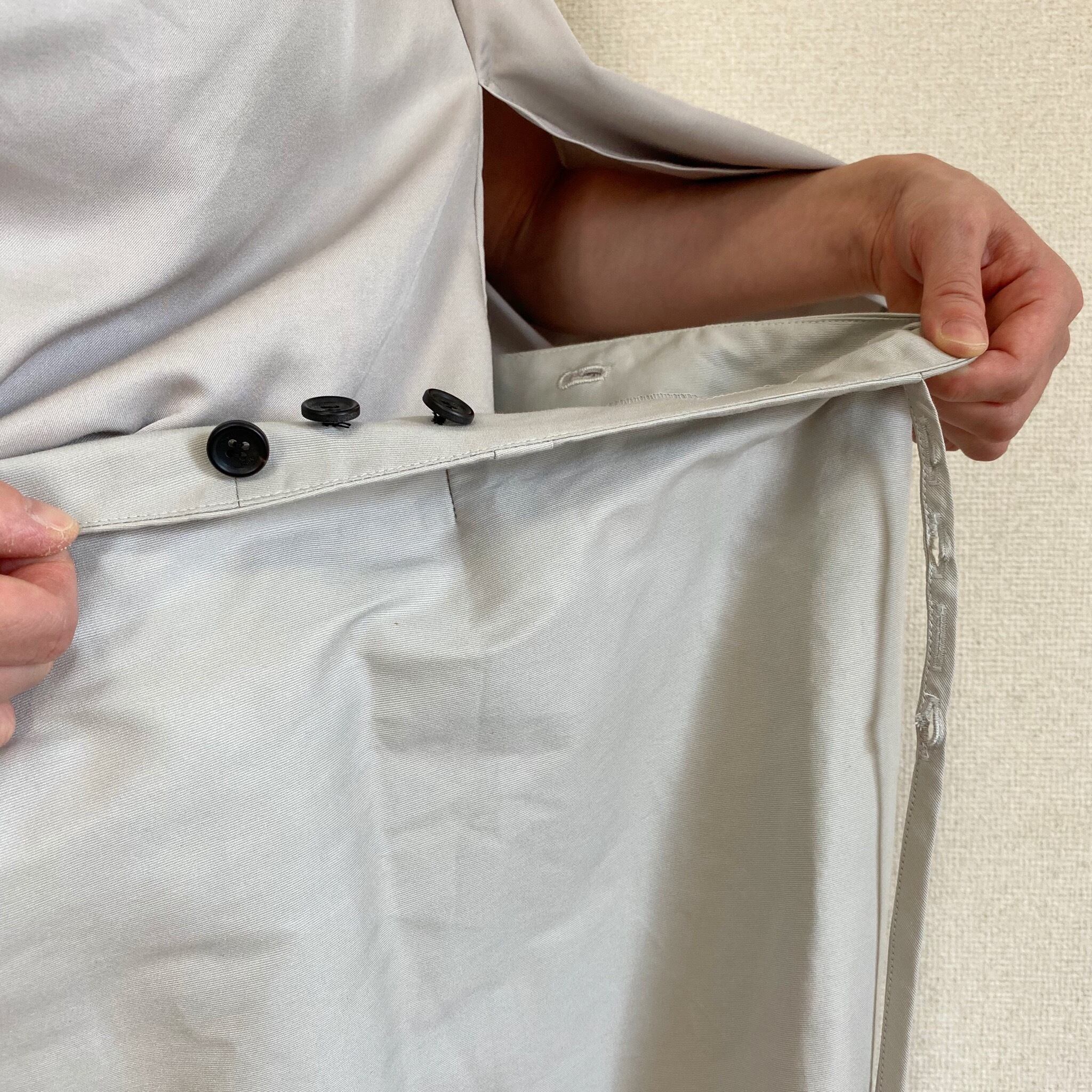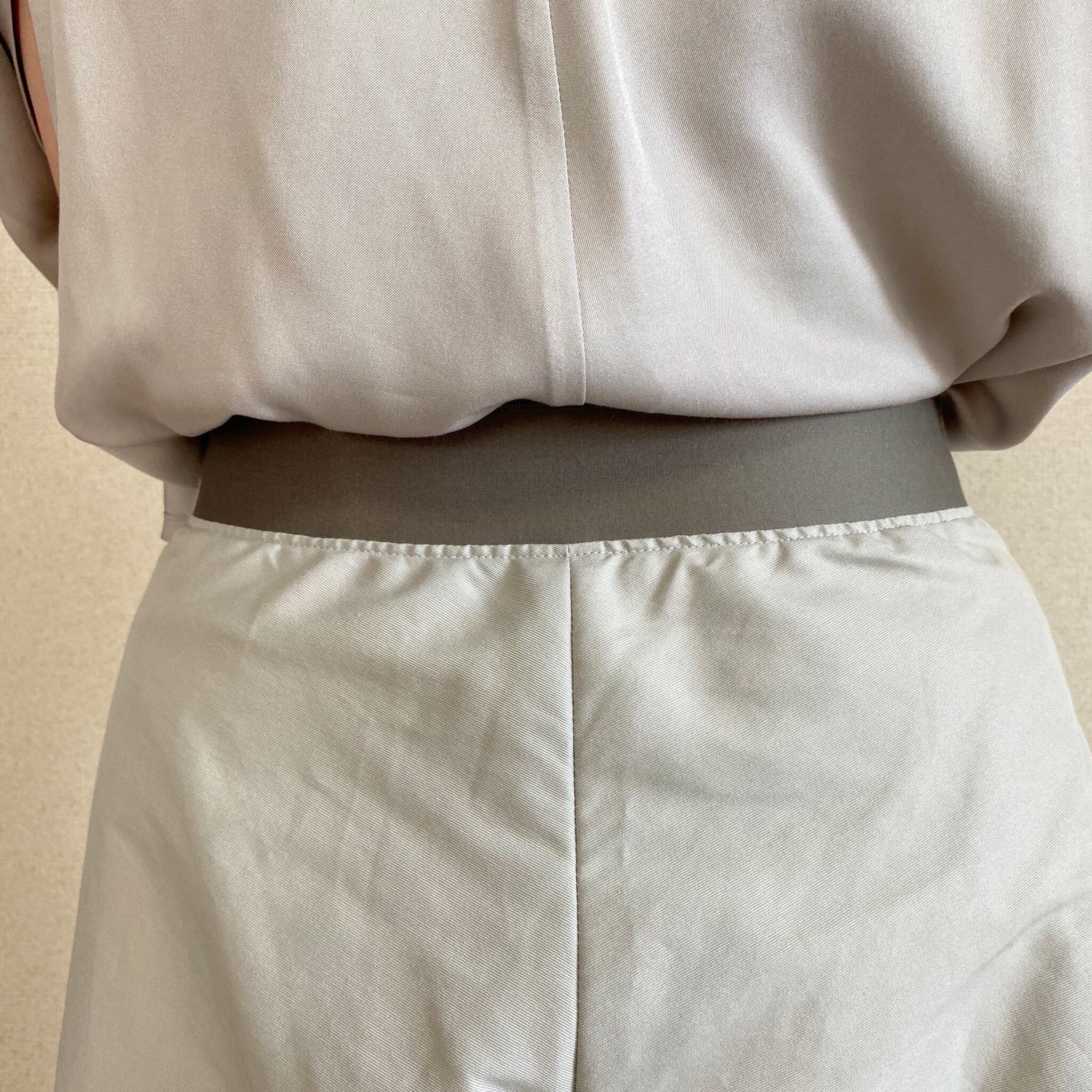ウエスト裏のボタンと、反対側にひっかけてシルエットを作る紐でサイズの微調整も可能。ウエストの後ろ部分はゴムなので、様々なサイズの方に対応。