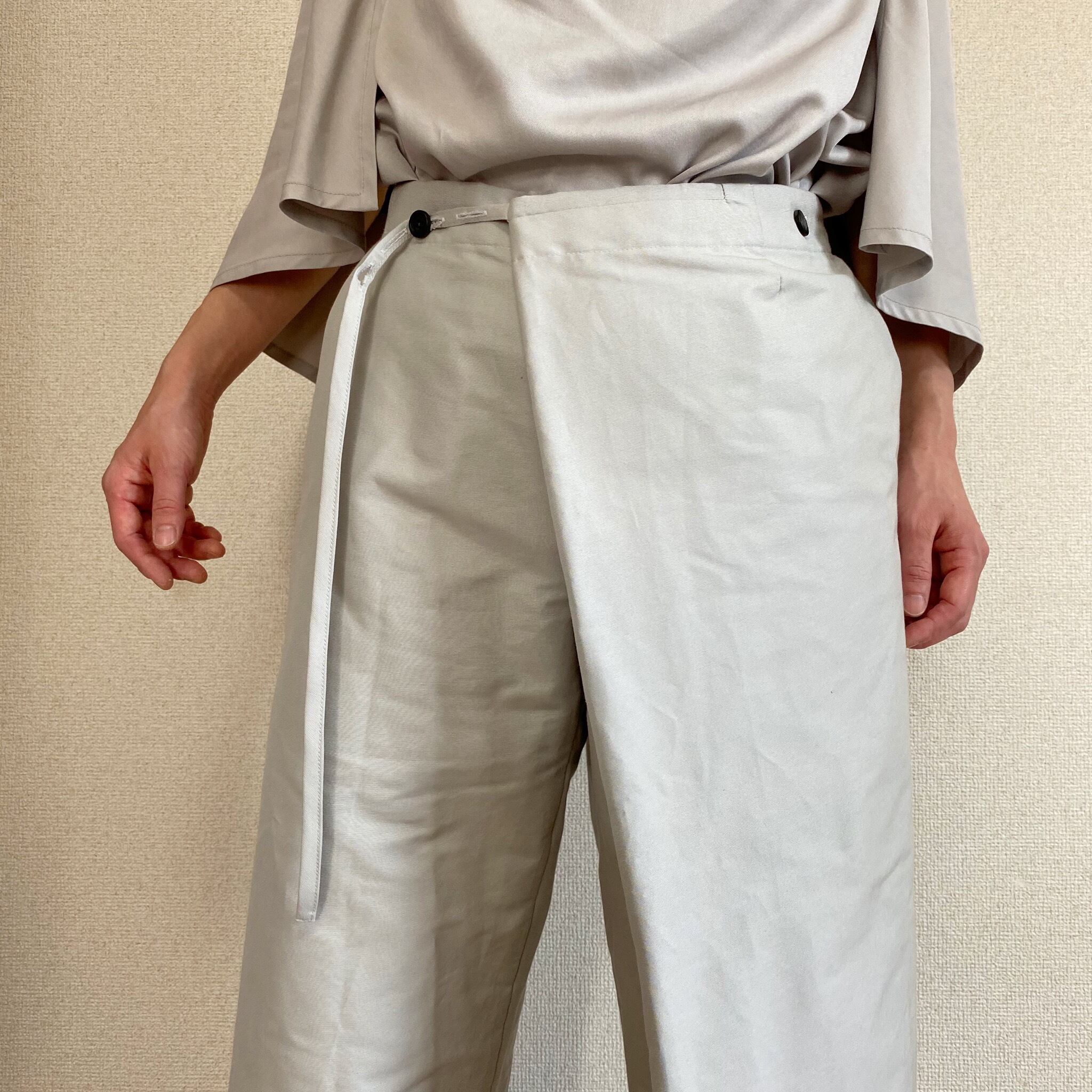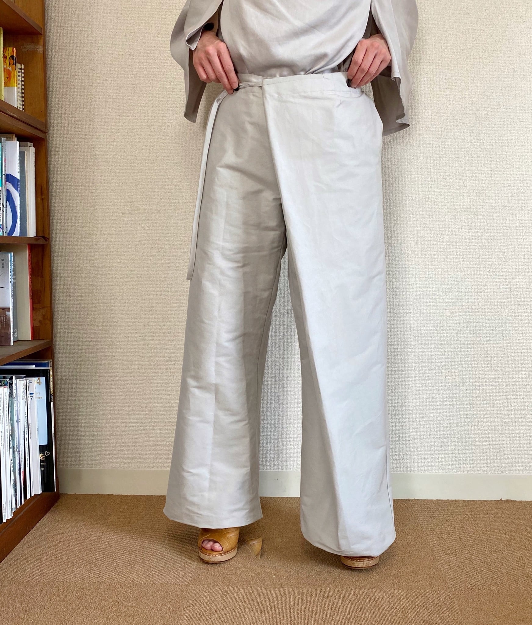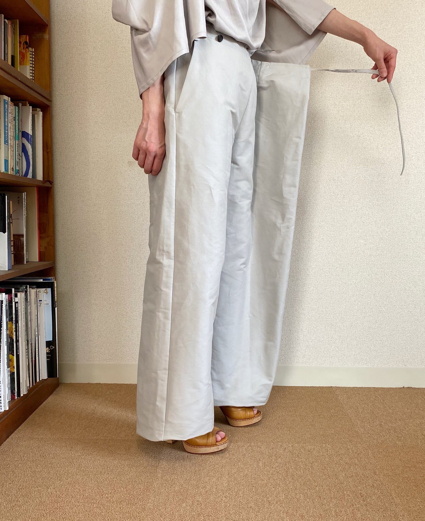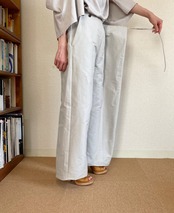<Design Detail> 袴のようなシルエットの太目ストレートパンツ。細かく高密度で打ち込んだ、パリッと清潔感のある生地感。シルクが入っているので、少し光沢感もあります。