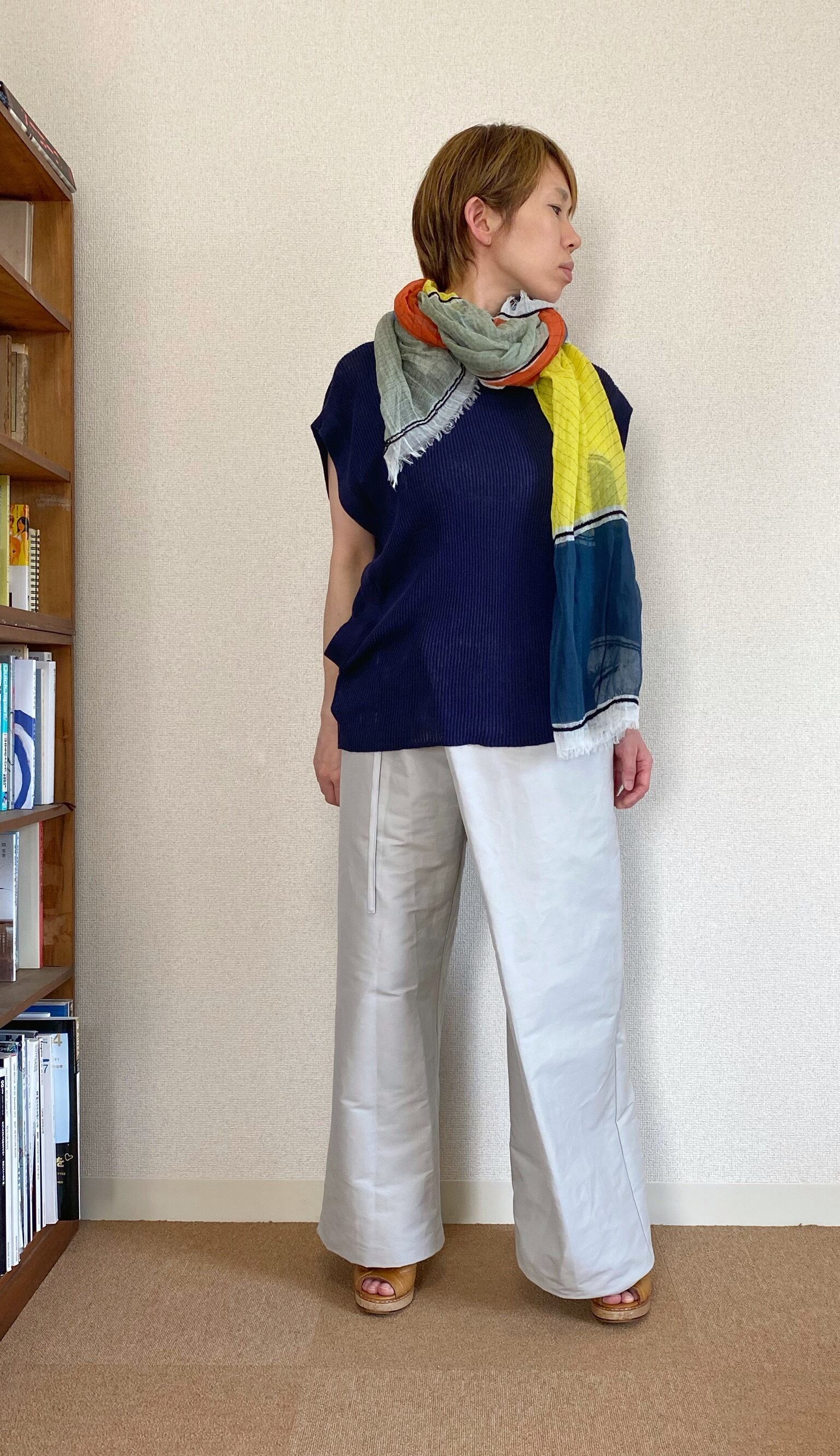 太目シルエットなので、トップスは少し短めなモノを選ぶと足長でよりスタイルよく見えますよ。パリッとした綿ブラウスでも、サテンやとろみのある素材のトップスとも相性良し。ただ全体に敵に端正でカッコ良い雰囲気のパンツなので、フリルやヒラヒラな甘めなトップスよりも、カチッとした雰囲気着るのがお勧め。