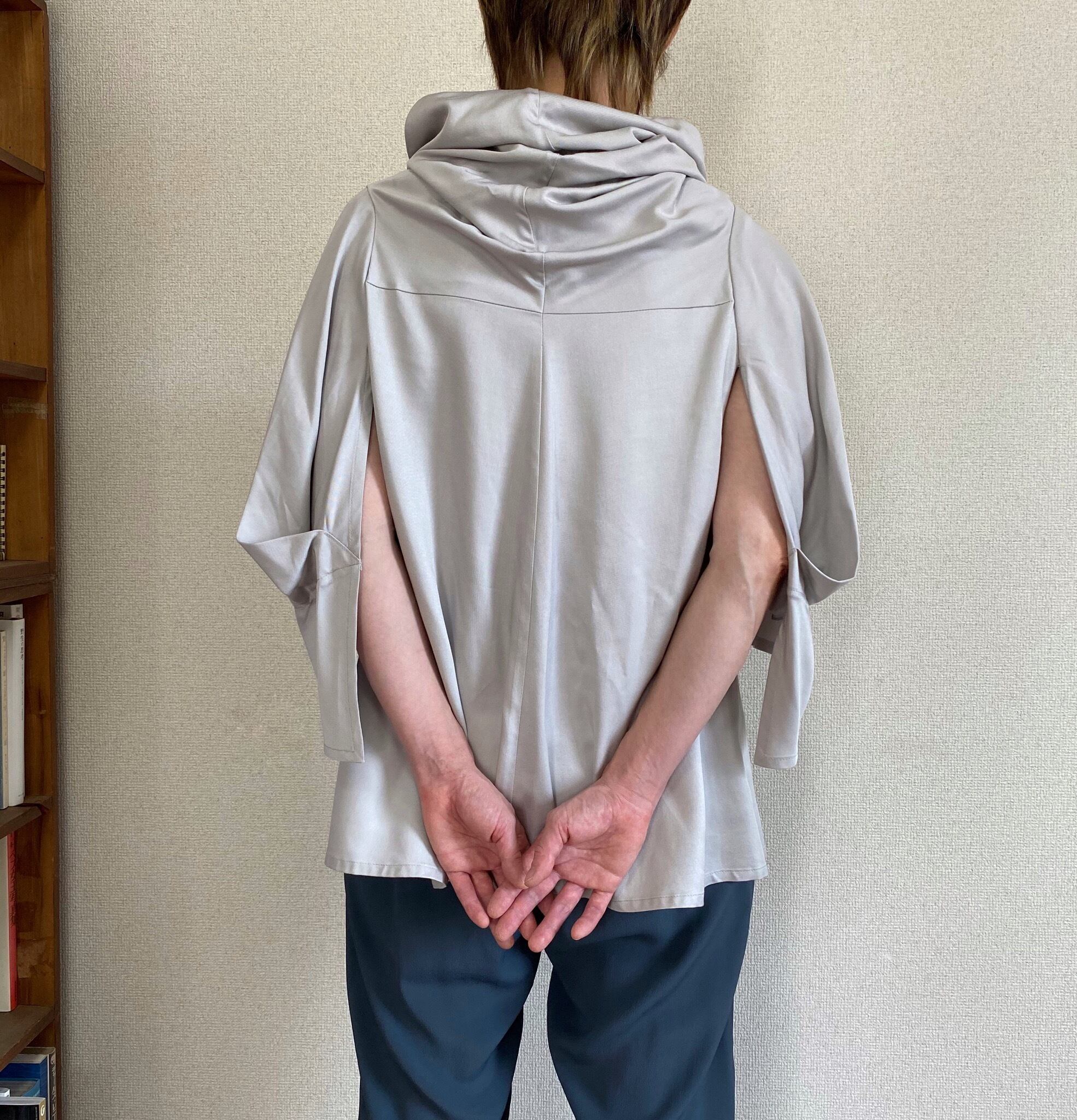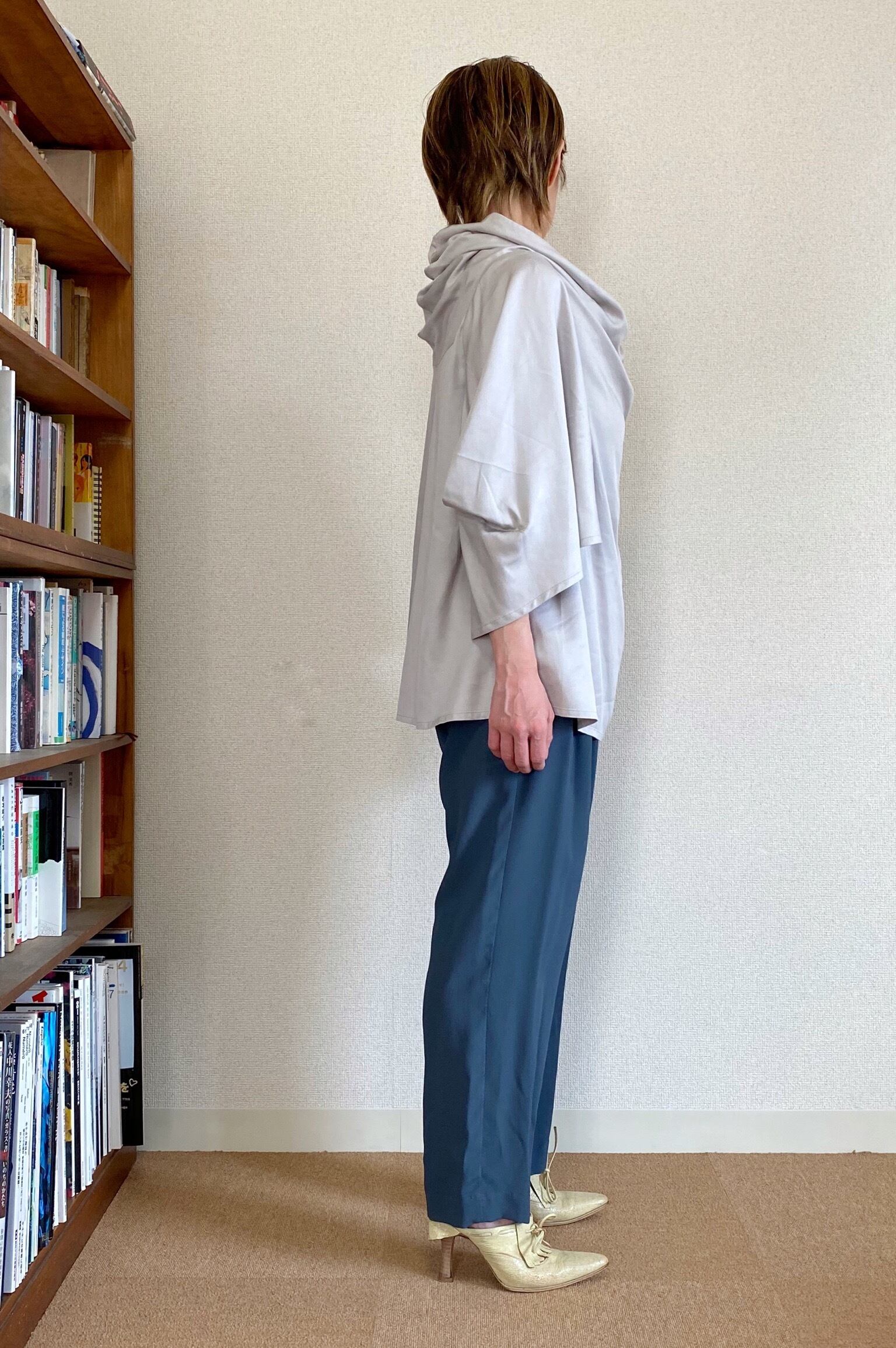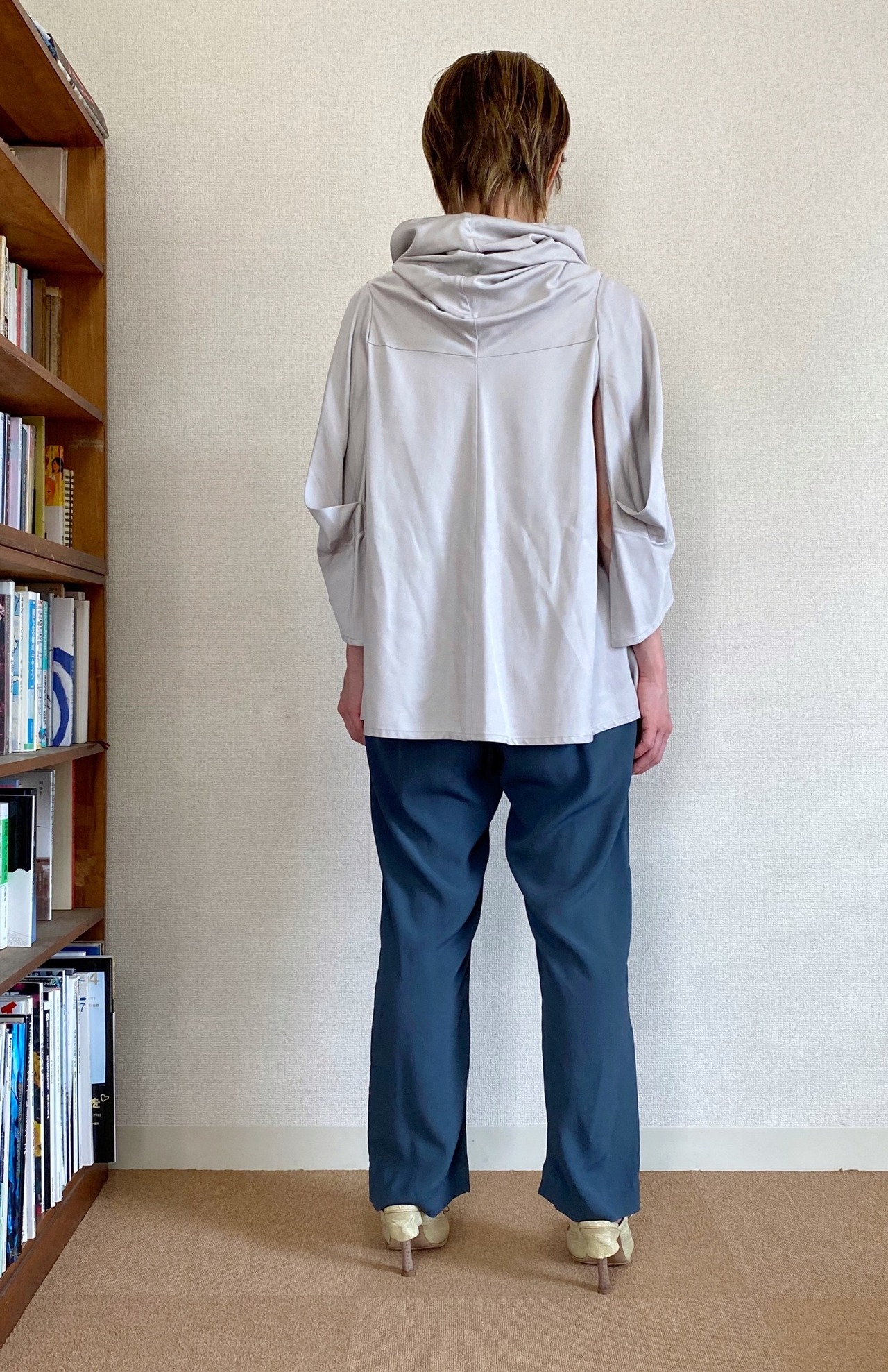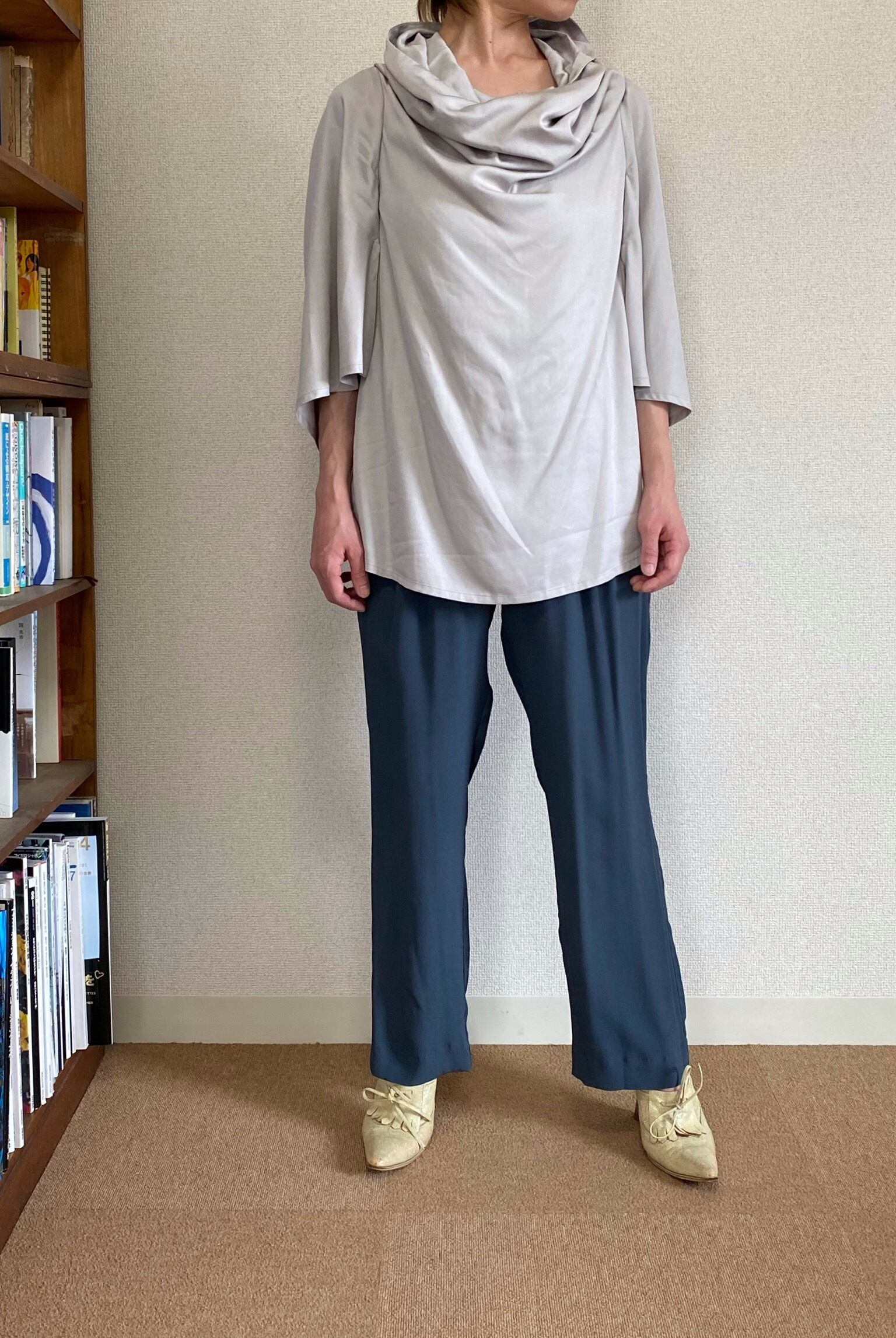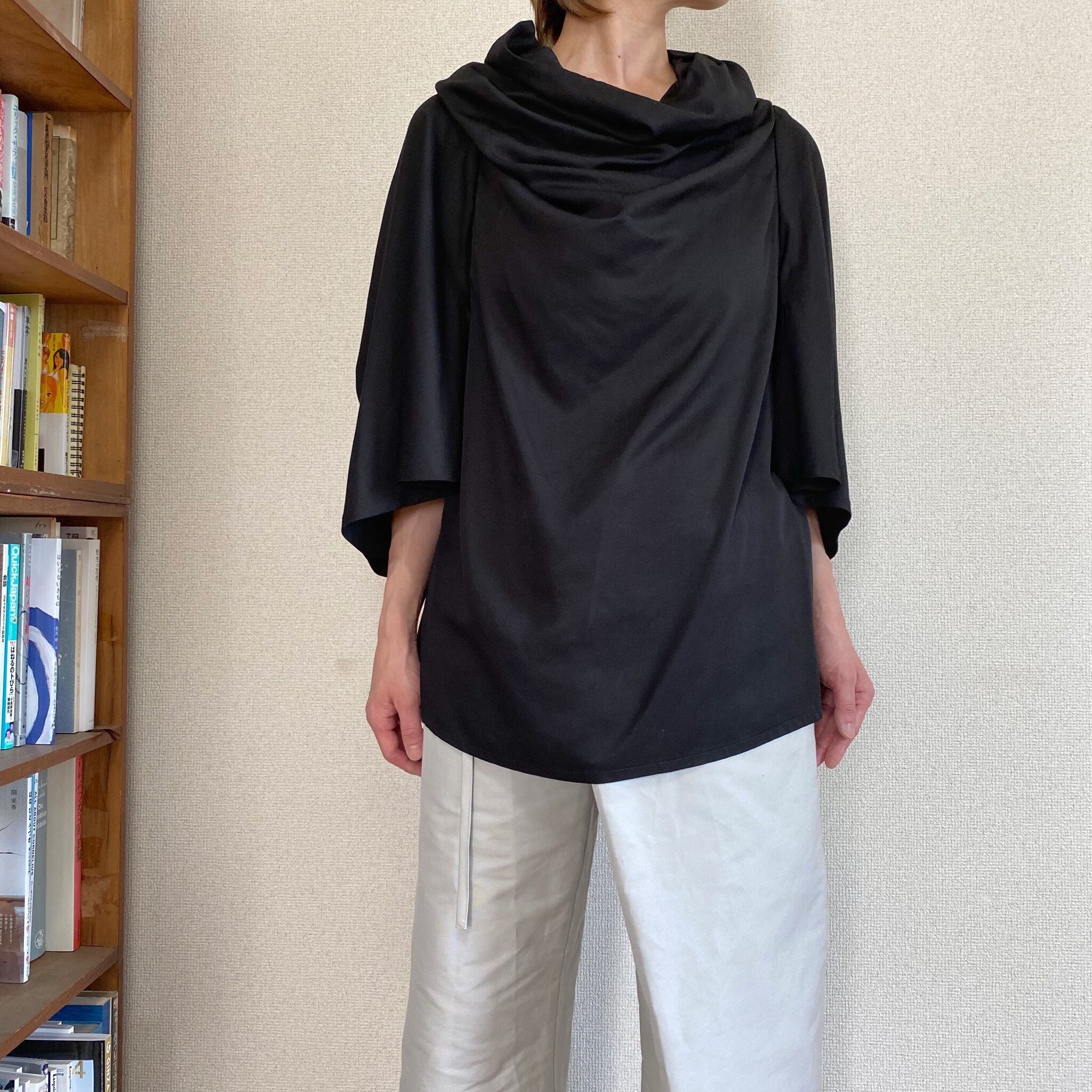 <Design Detail> たっぷりドレープが効いた首元がとても女性らしいオフタートルトップ。とんがった様な、着物にも似た脇下が開いた袖付け(生地が被っているので脇がまる見えな感じにはなりません)。落ち感はあるけれど、程よい厚みと少し光沢感がある生地は、高級感を感じさせます。