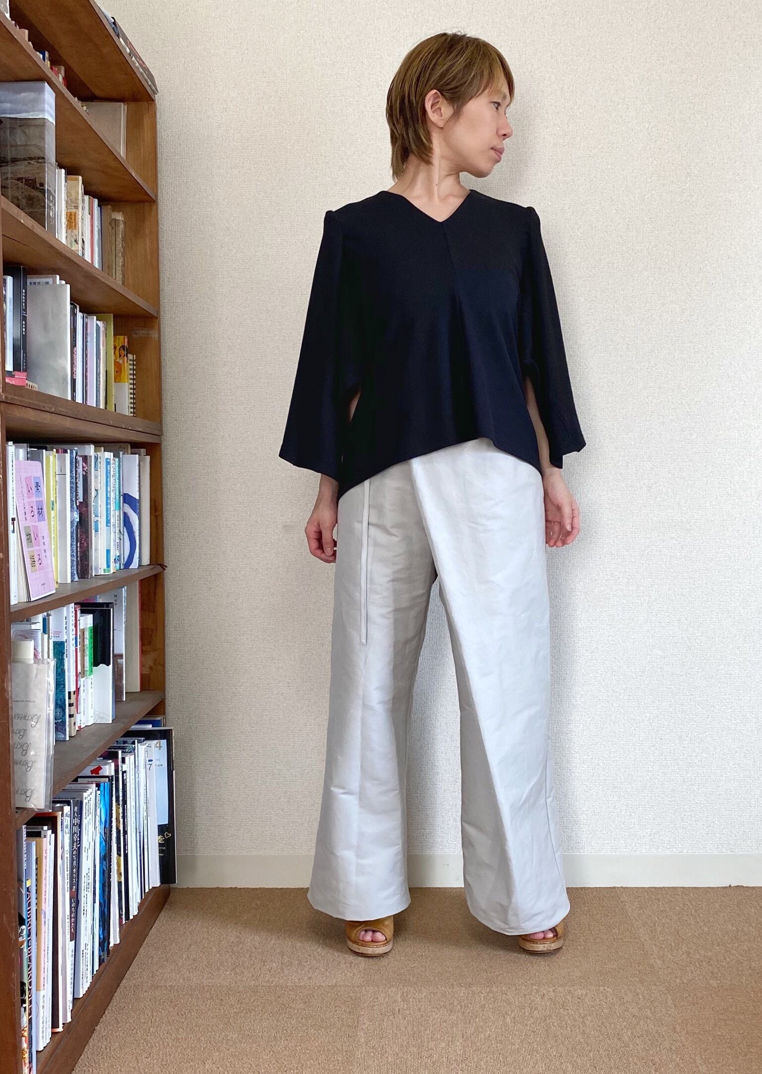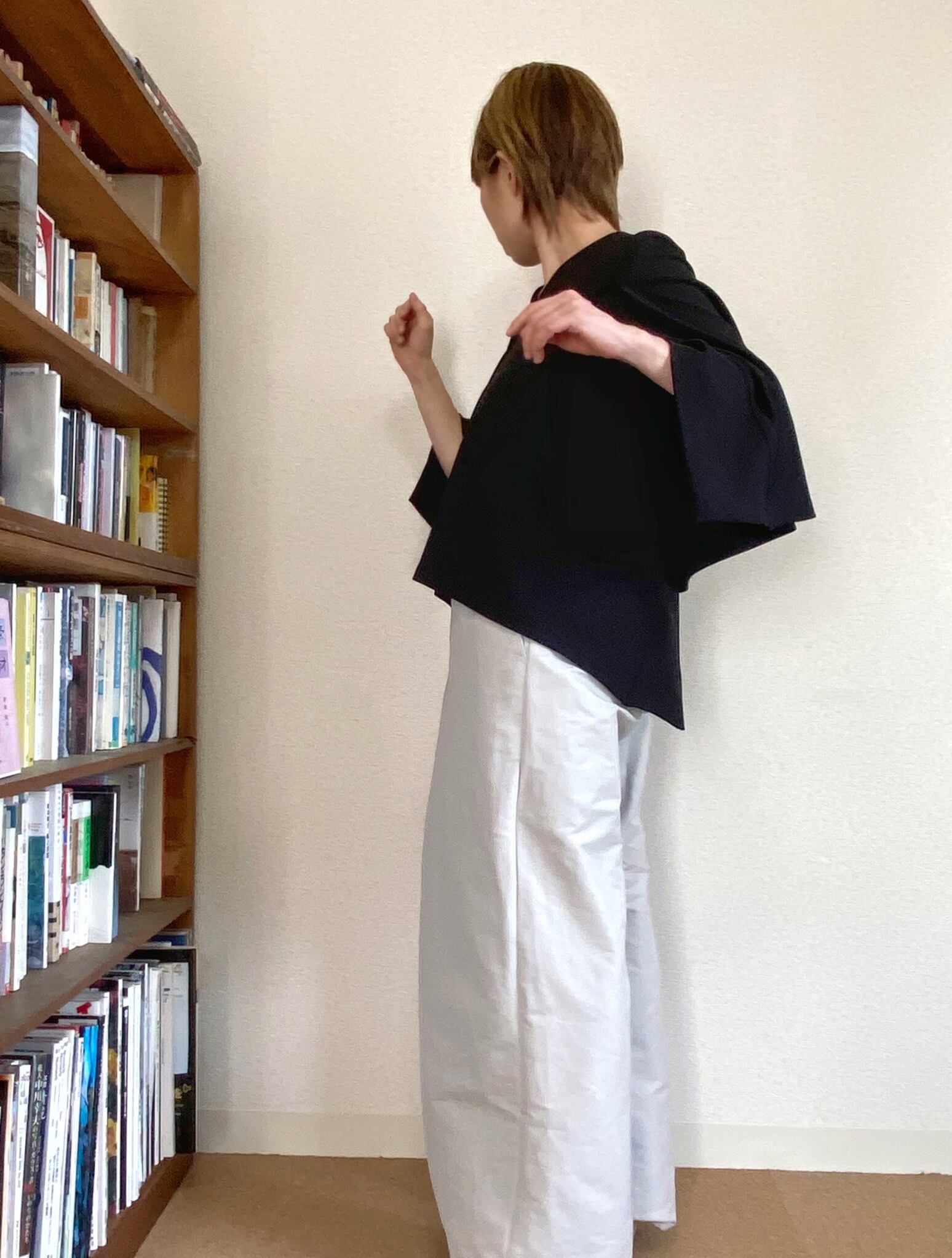 <Design Detail> ノースリーブトップと着物のようなお袖を付けたケープがドッキングした、ゆるっとサイズのプルオーバー。後ろ下がりのデザイン。