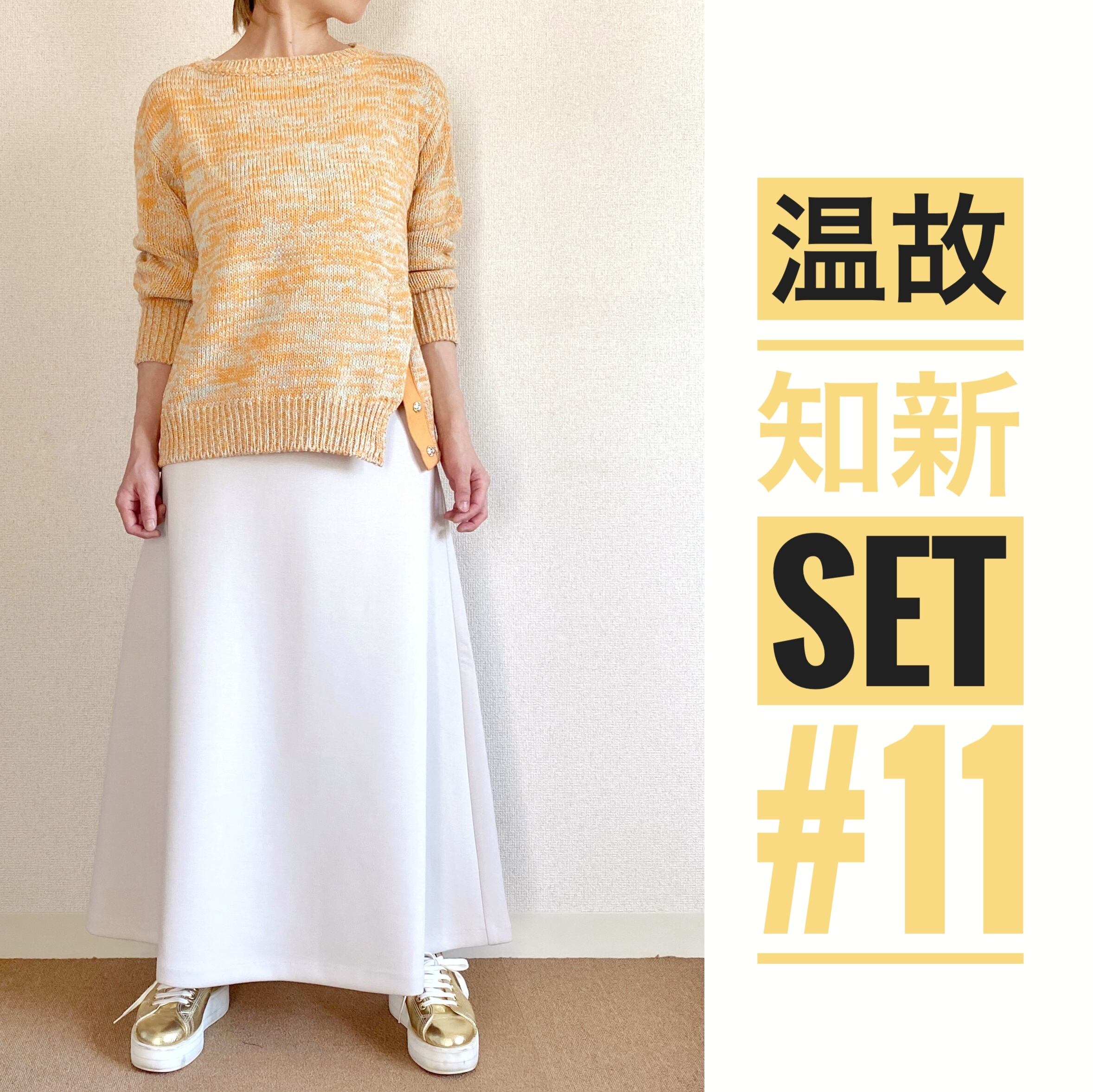 Munich(ミューニック)のローゲージのメランジニットと、同じく Munichの美シルエットAラインスカートのセット。大体7~11号サイズの方におすすめなセットです。