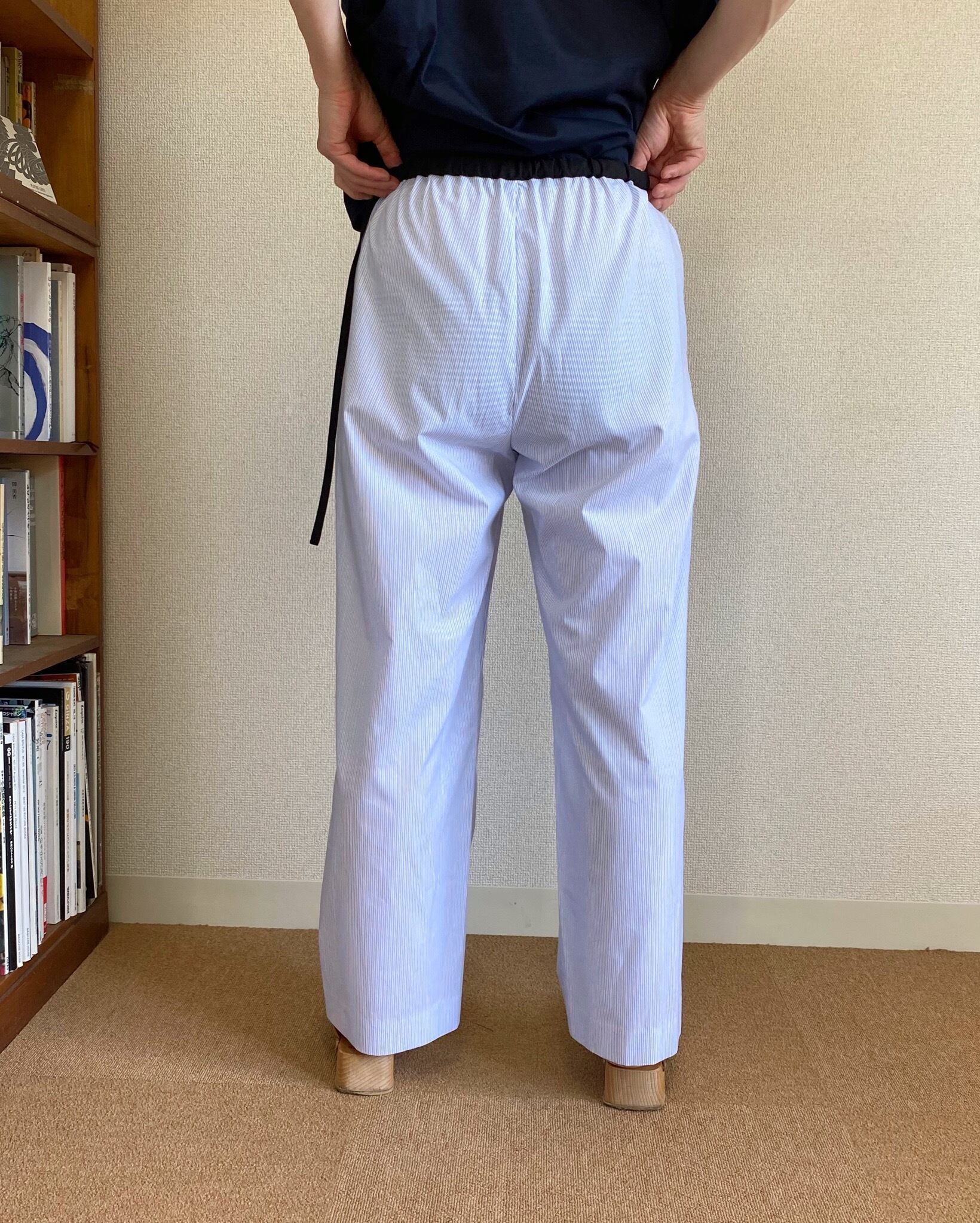 <Design Detail> 涼し気な水色ベースのマルチストライプのワイドパンツ。ブラックの生地の切り替えと長めの紐があることで全体の雰囲気が引き締まります。