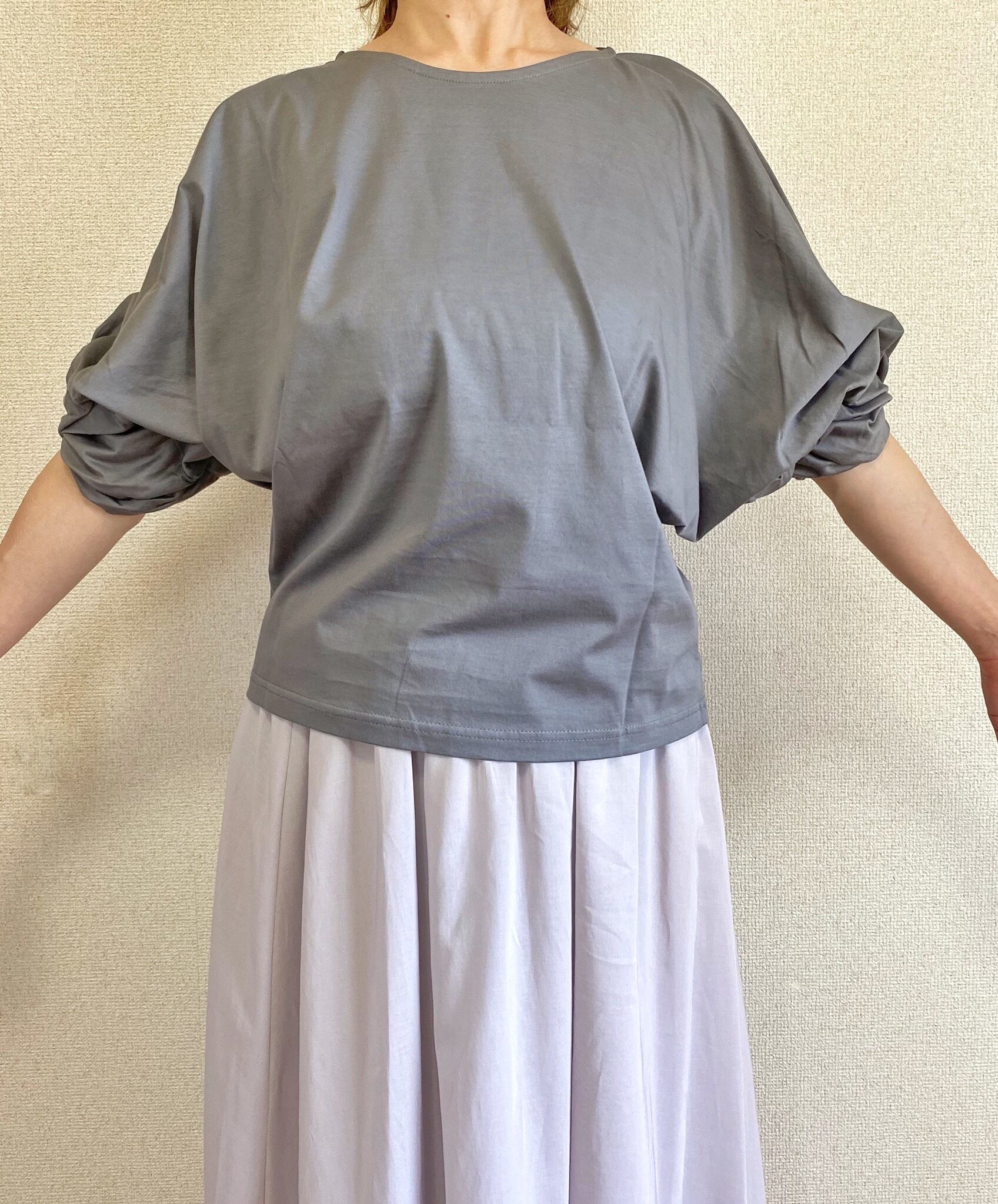<Coordinate tips> 腕回りにボリュームがあるので、ボトムは落ち感のあるスカートや、太目ストレートのパンツなどが◎。お盆過ぎから10月半ば過ぎのニットの季節までは、1枚で過ごすことが多いので、1枚でキマりしかも楽ちんなカットソートップは価値ありますよ!