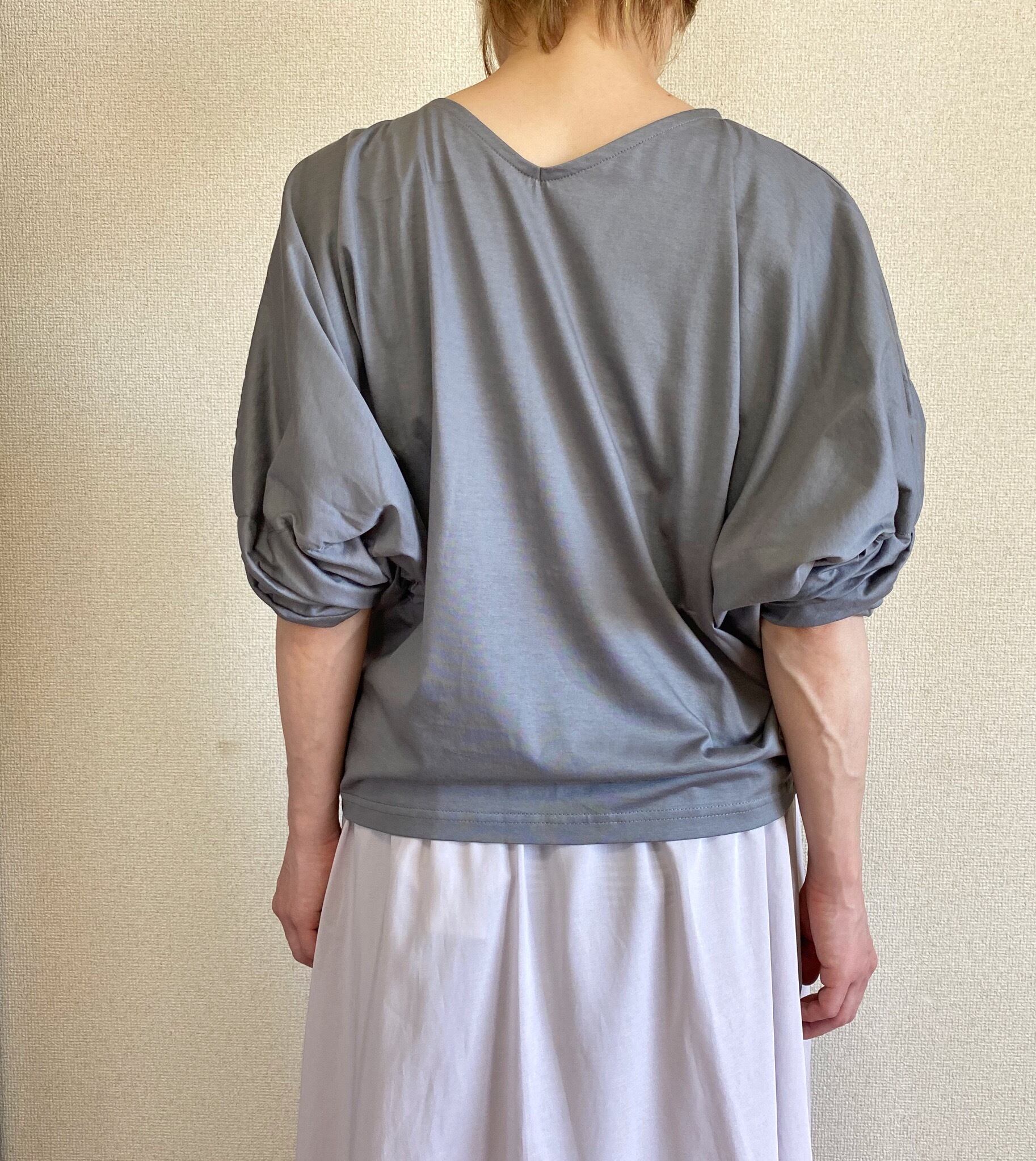 <Design Detail> カットソー: 腕回りをツイストしていてカットソー。前後ろ両方着れて、Vネックか丸首の首元。どちらも開きは大きくなく、胸元は気になりません。