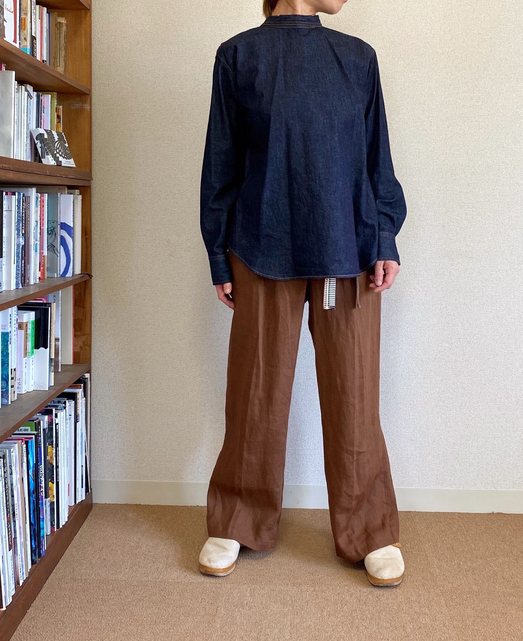 日本ブランドMunich(ミューニック)のバックボウタイシャツと、イタリアブランドniuのブラウンのカラーリングやっぱり日本の色と違う、リネン太目ストレートパンツのSale Set。