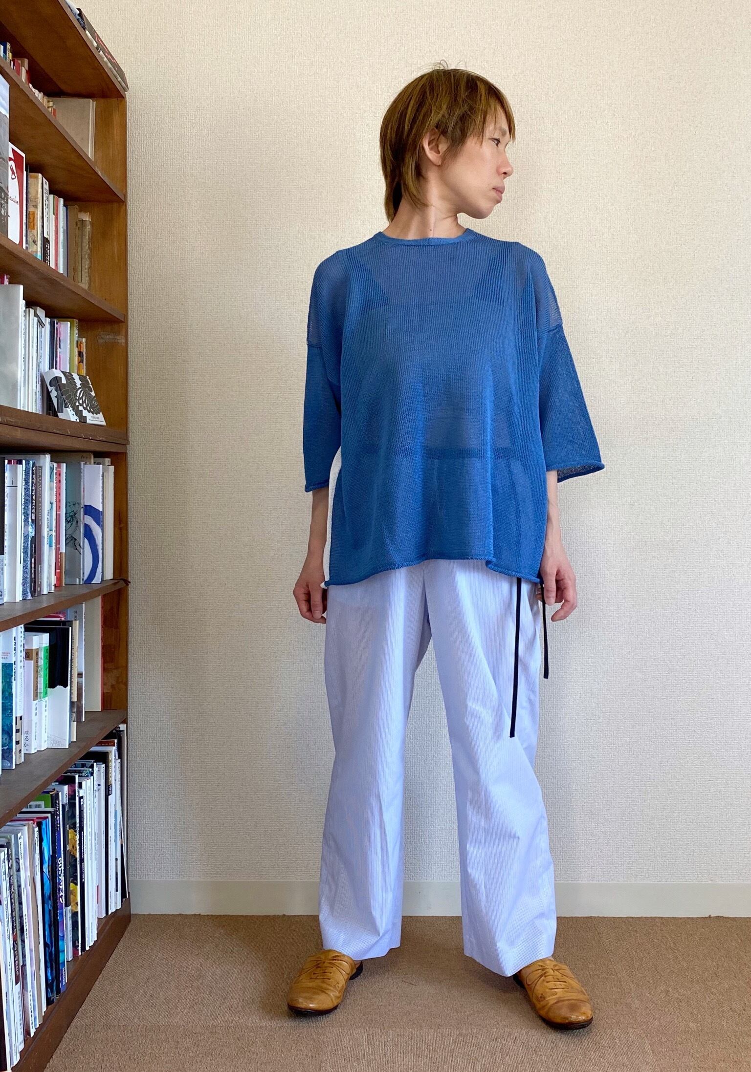 <Design Detail>ニット:前がブルー、後ろが白の2トーンニット。 首元は詰まった丸首の5分丈綿ニット。ローゲージでシャリシャリした肌当たりで、キャミソールを合わせて真夏までお召し頂けます。