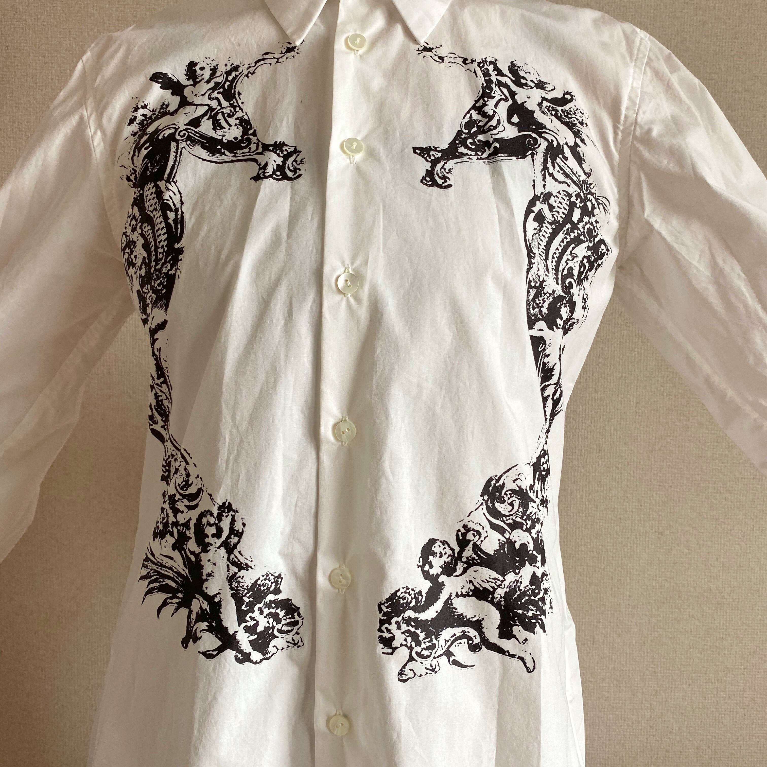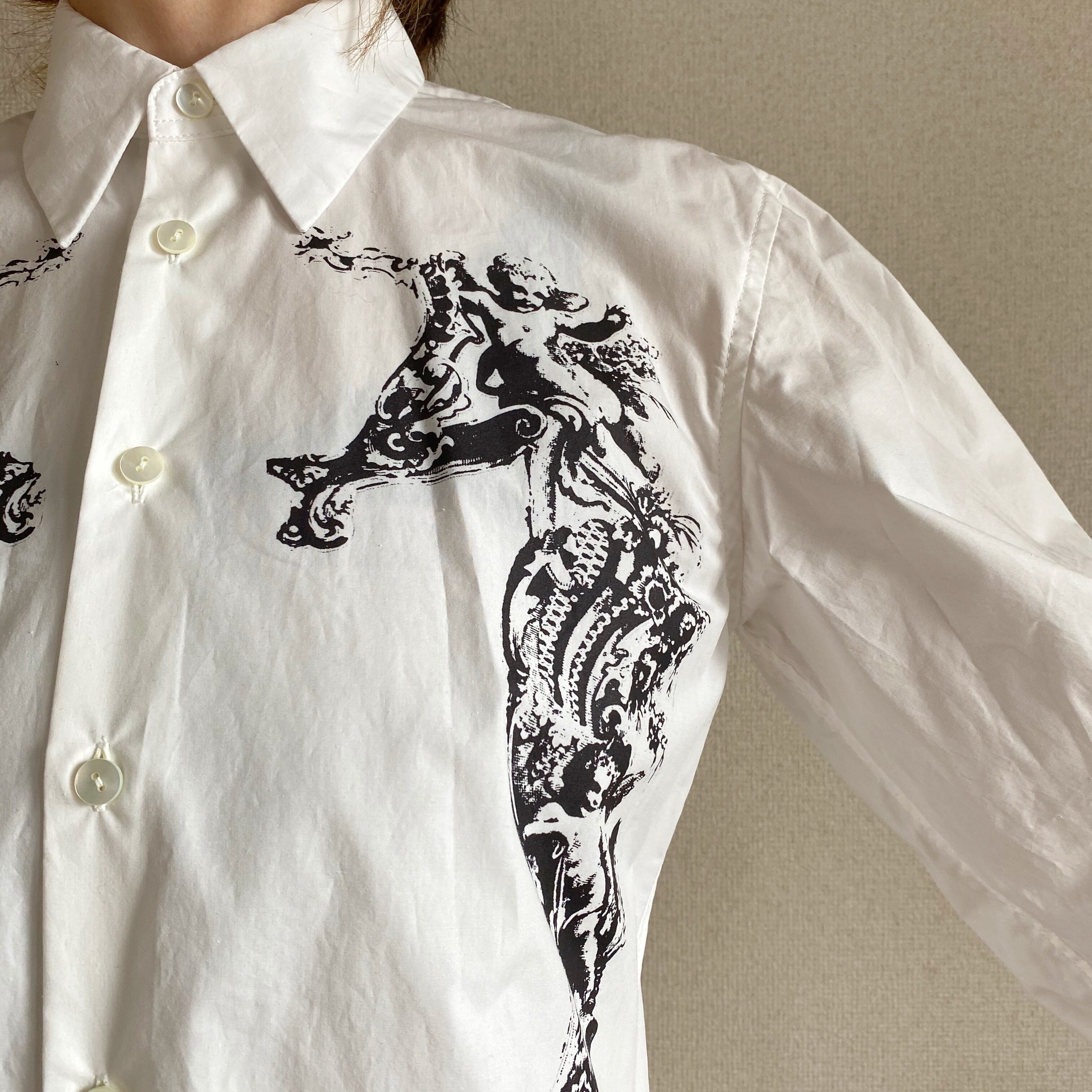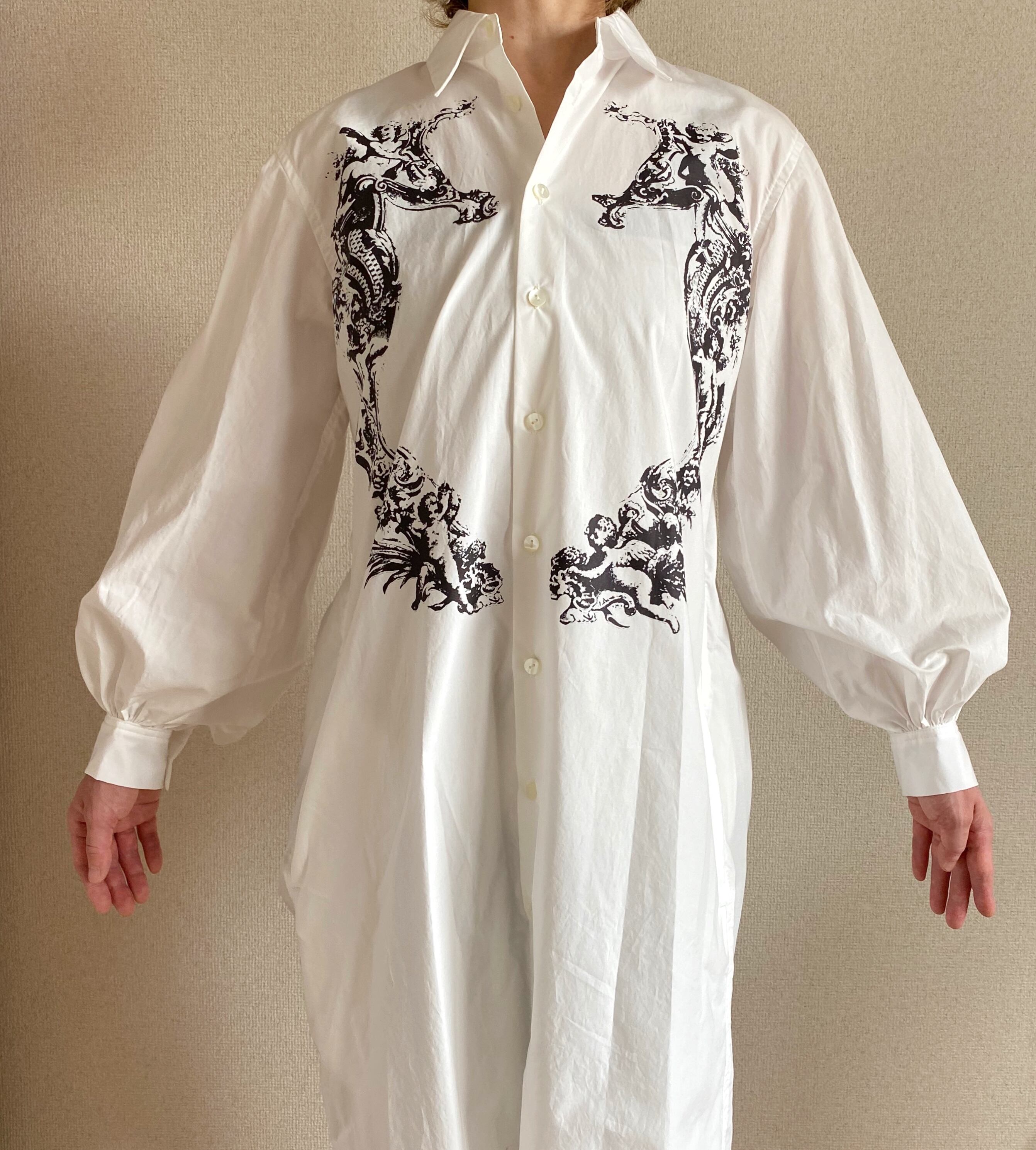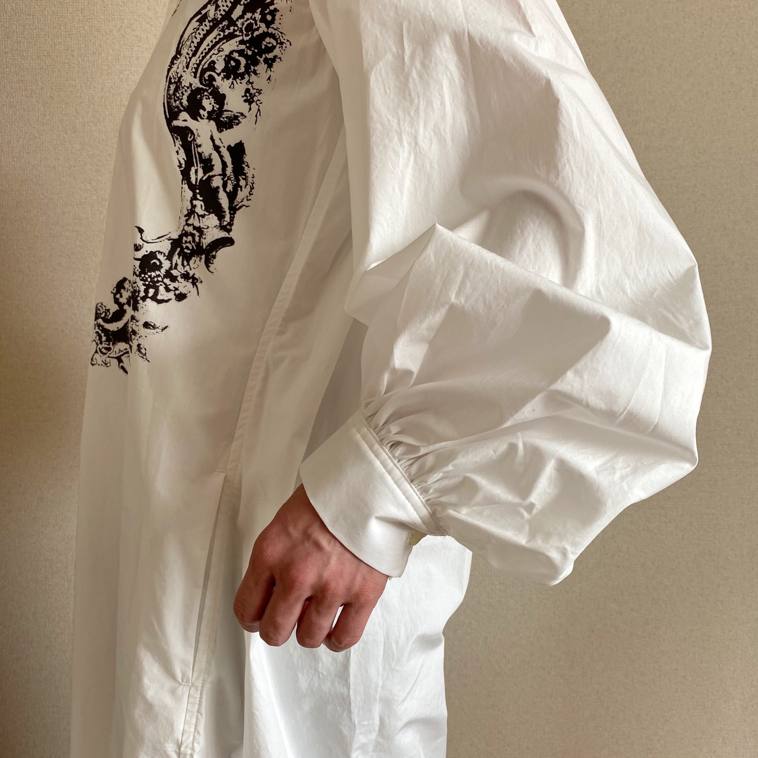 胸元に額縁のようなプリント。ちょっと大げさなくらいのパフスリーブ。少し高めな高めな襟は、留めても開けて着ても素敵です。両サイドにポケット。