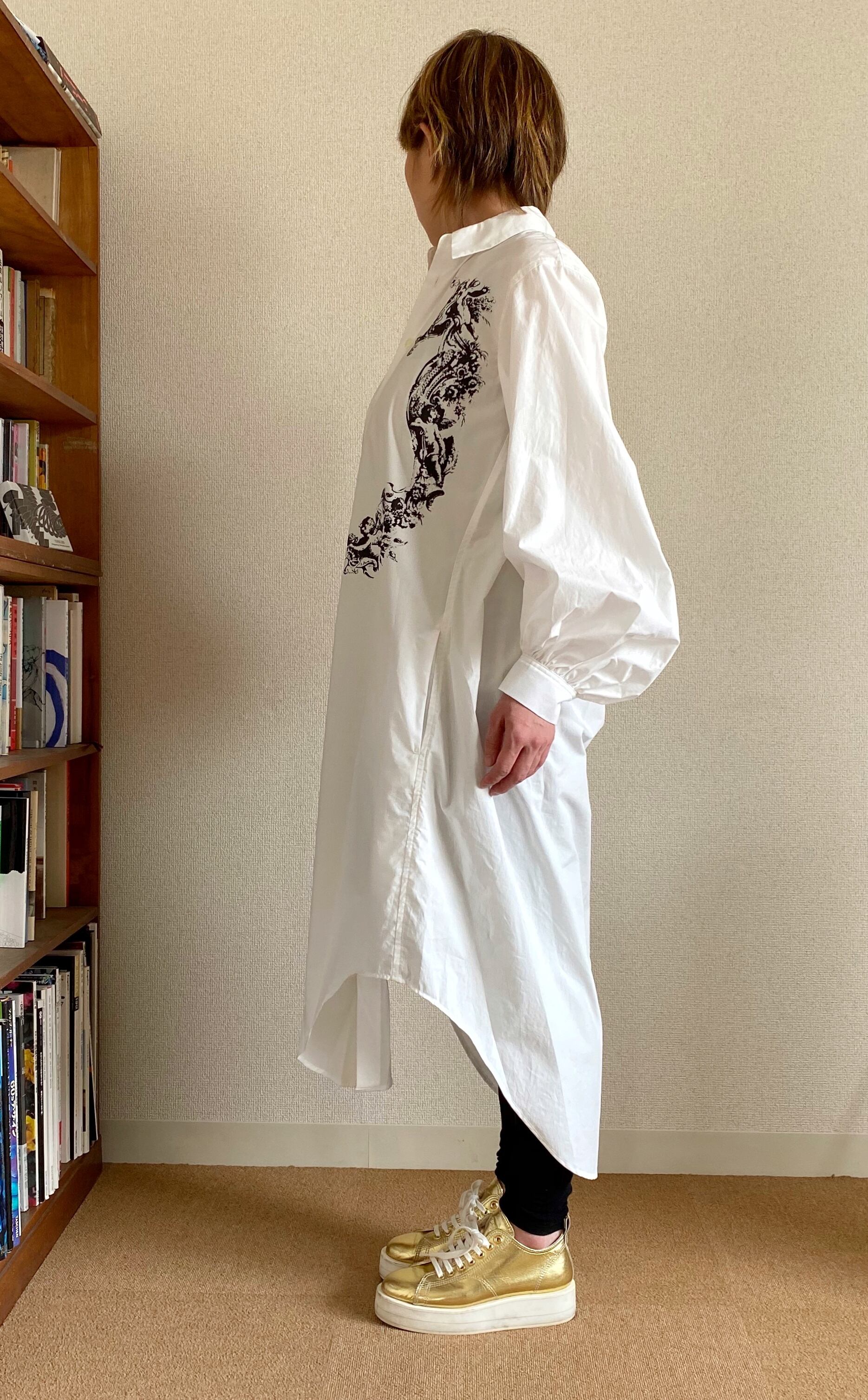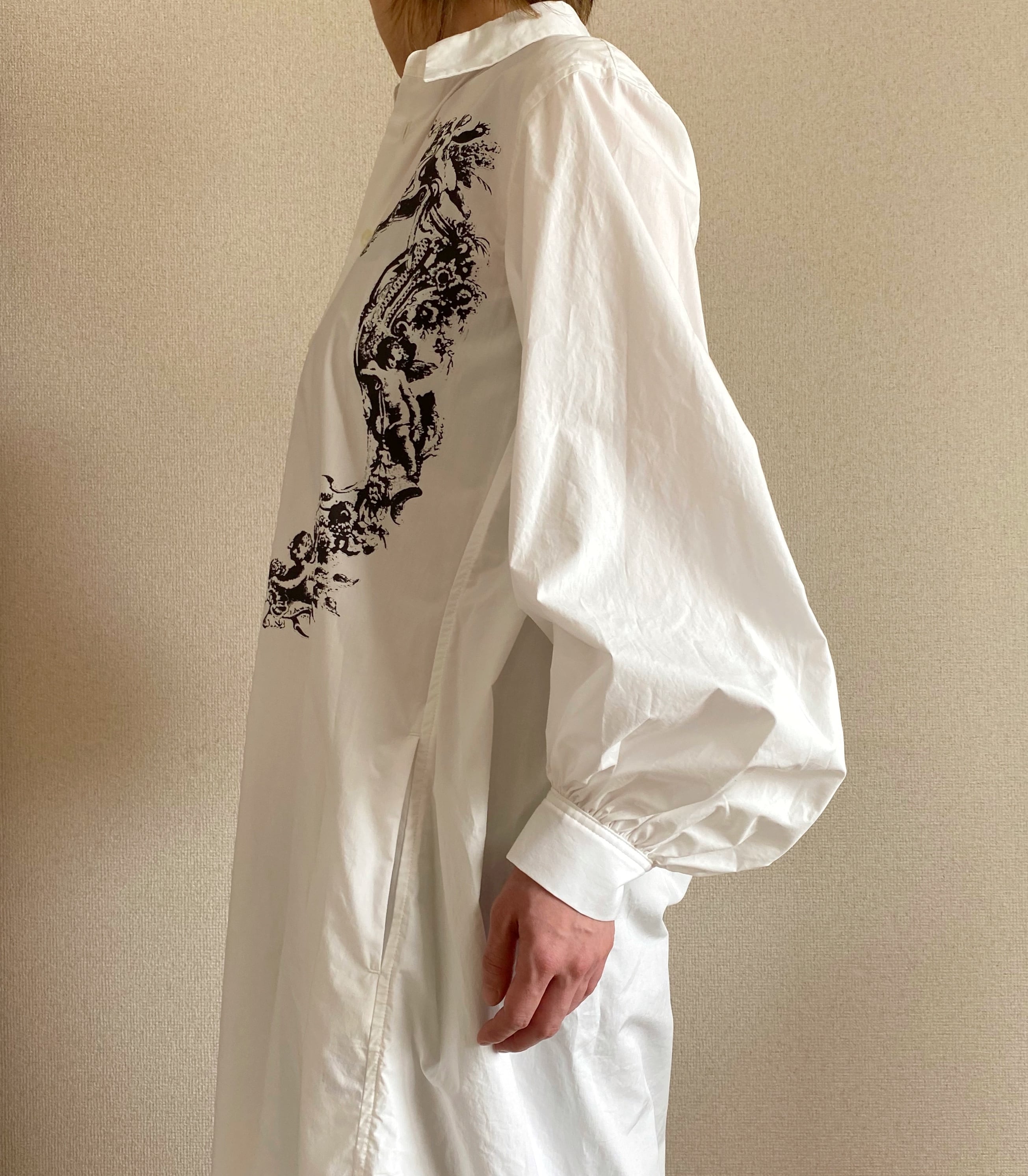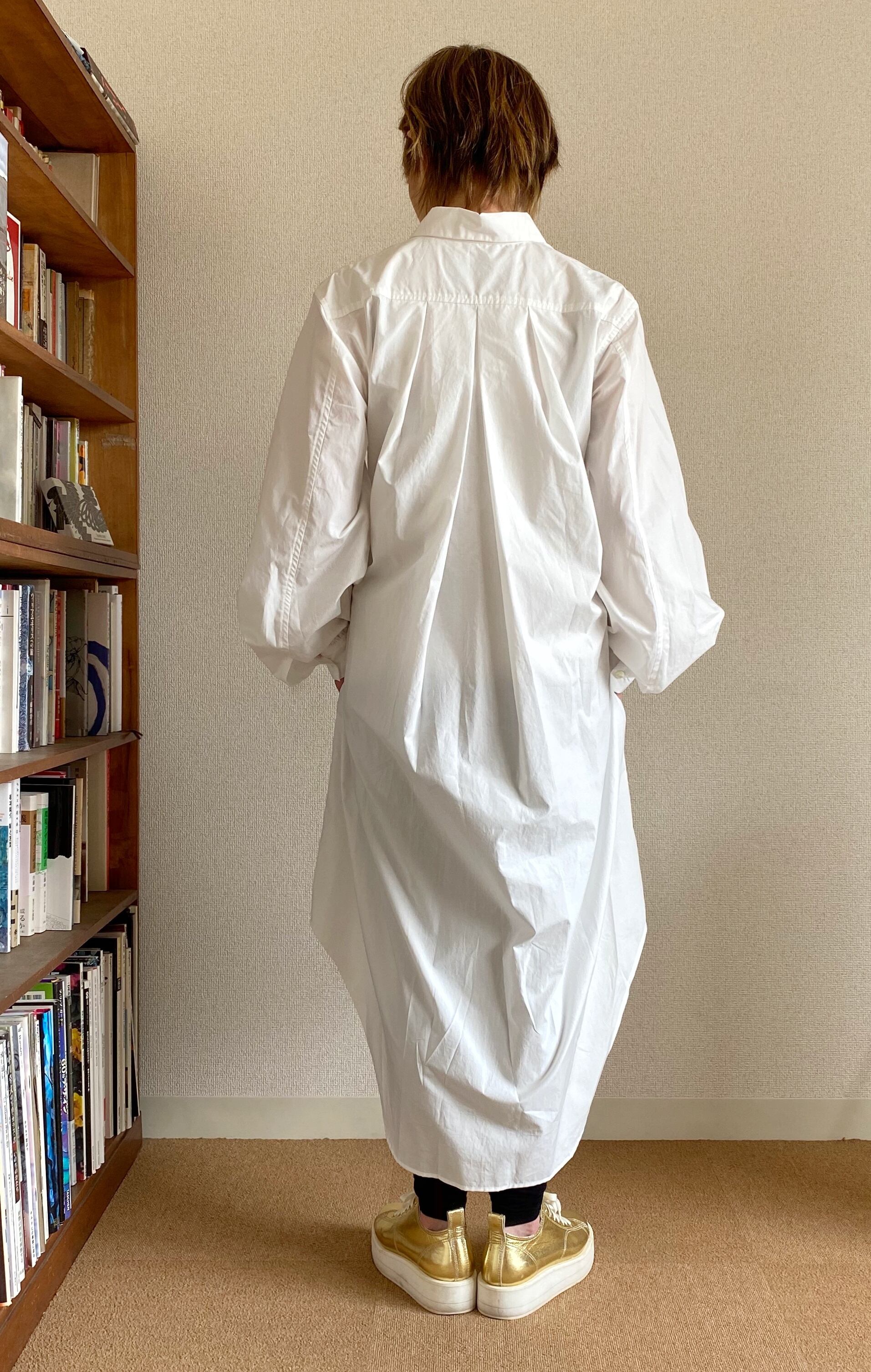 <Design Detail> サイドがクッと上がったコクーンシルエットのシャツワンピース。