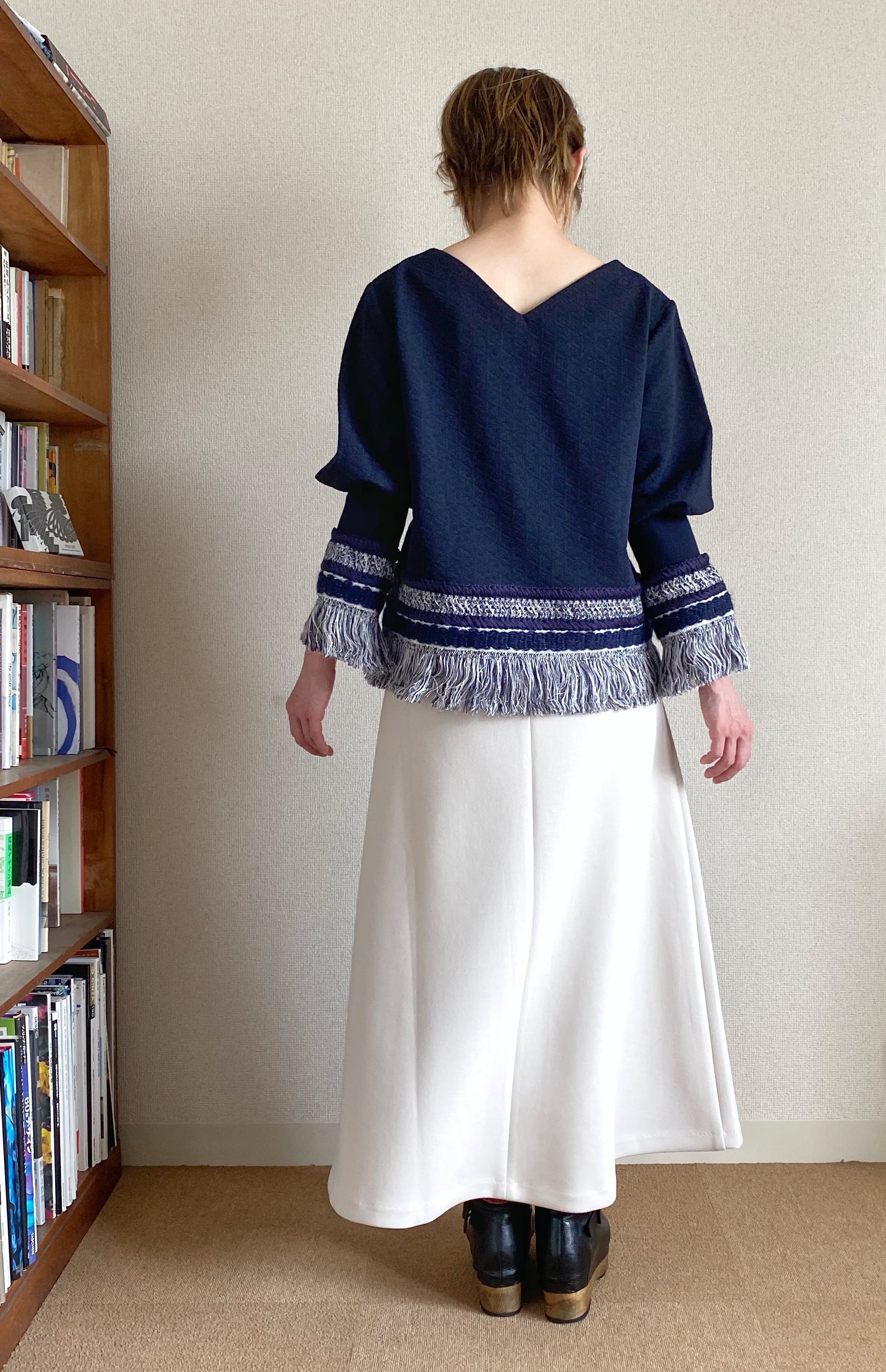 <Design Detail> 伸縮のあるジャカード生地。オリジナルのフリンジは贅沢感あり。