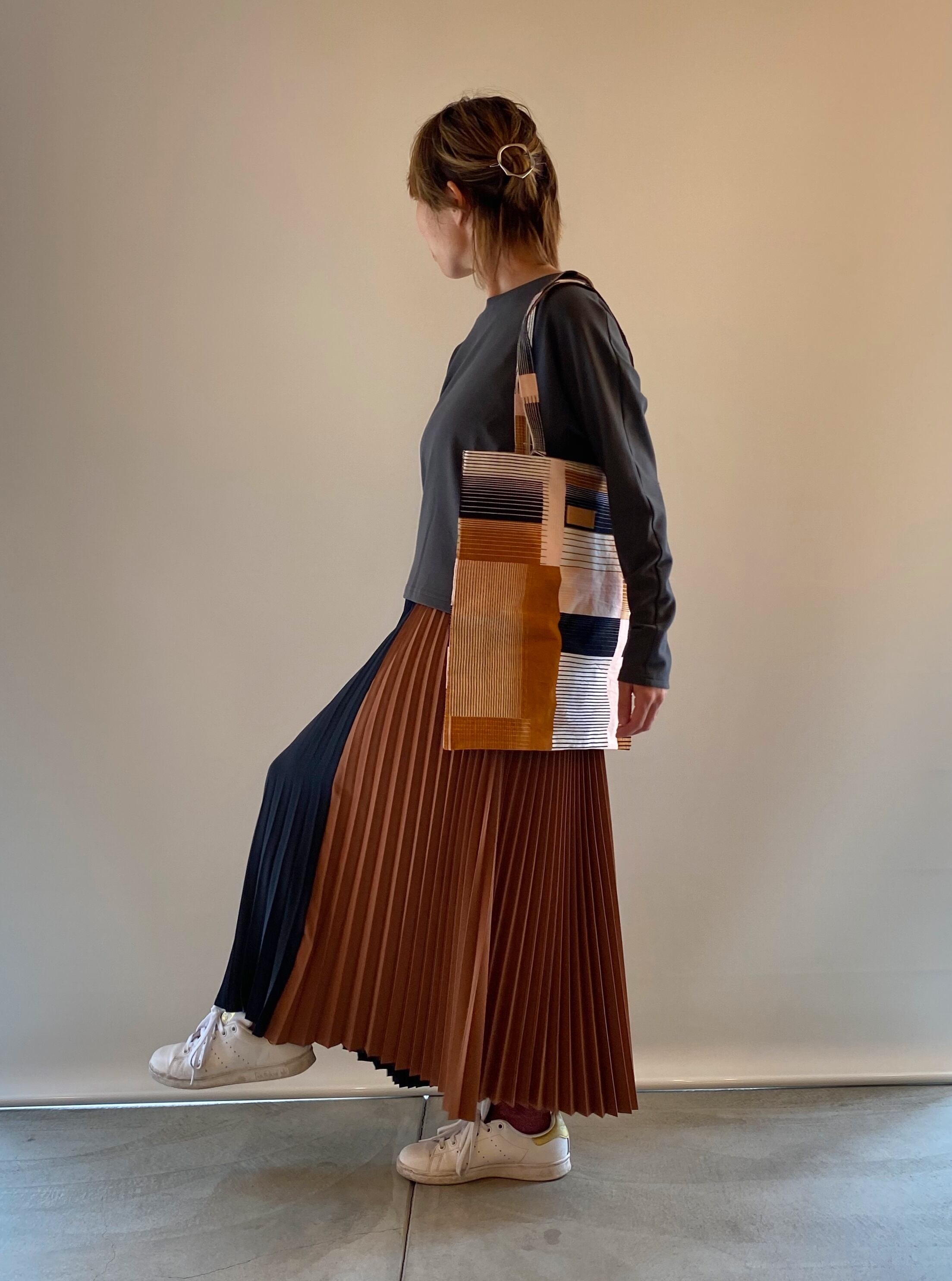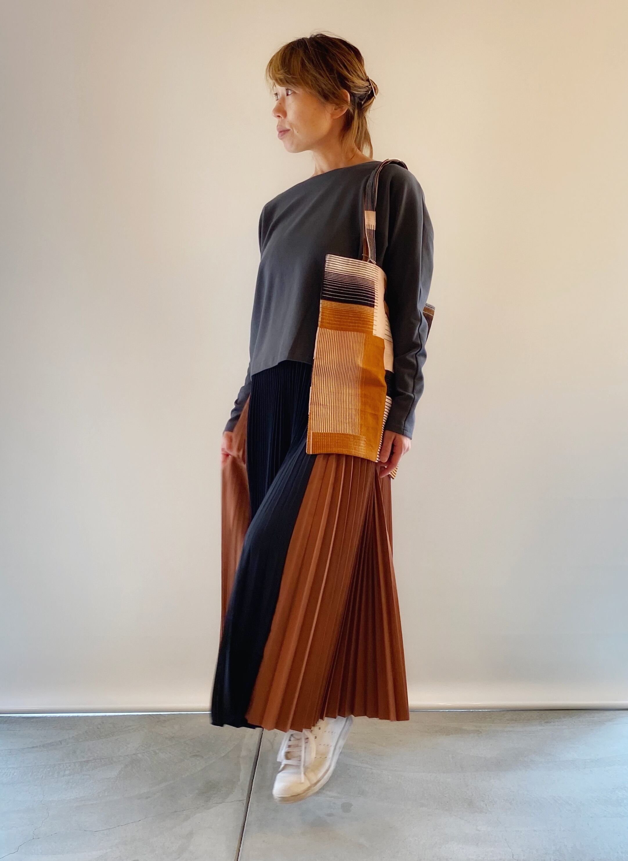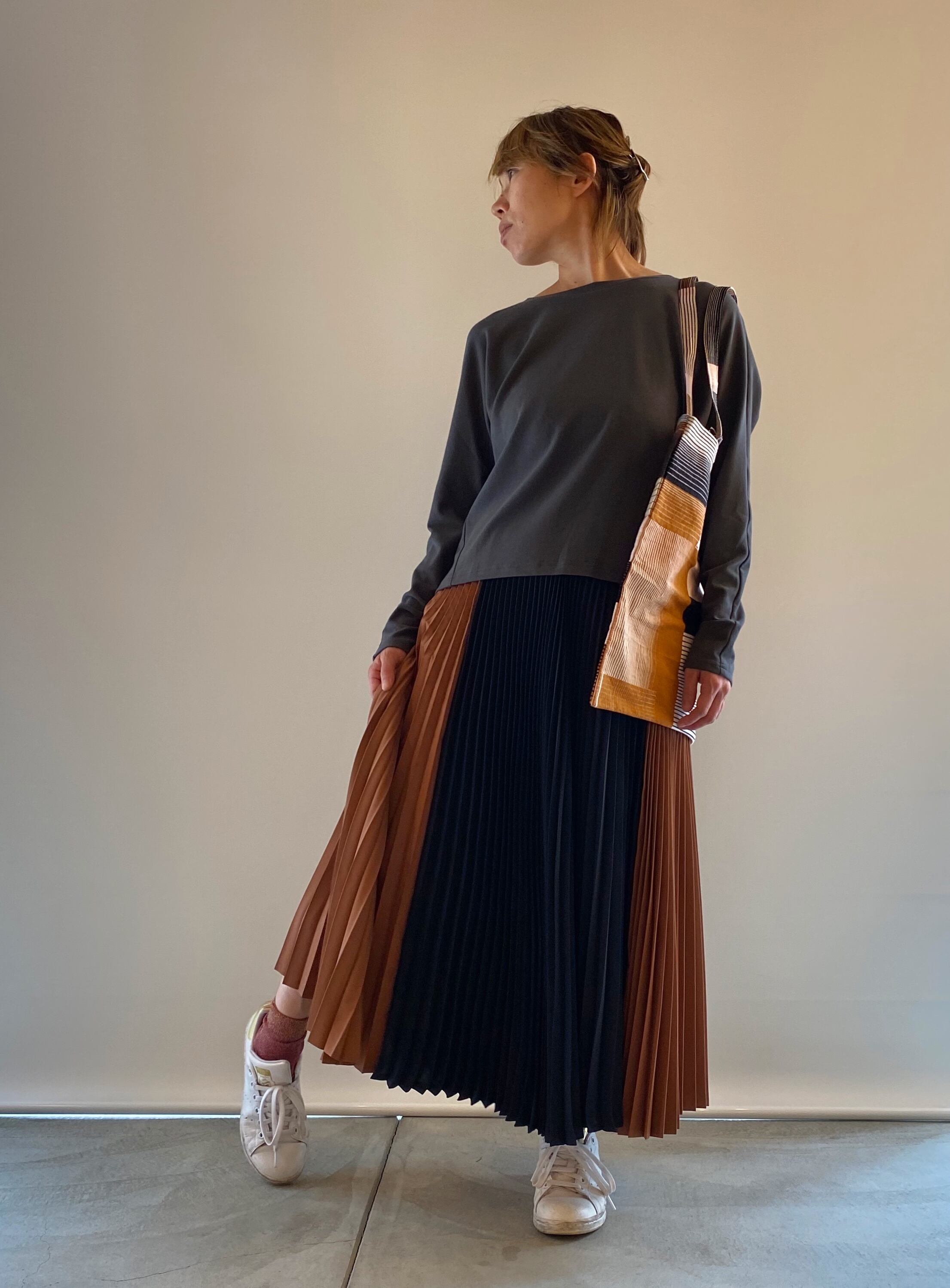 <Coordinate Tips>サブのお色を正面に持ってくると、少し主張があって難しく感じるかもしれませんが、横にずらしたり一方のお色を10%分だけ正面に見せたりすると、コンサバ定番アイテムのプリーツスカートがとてもこなれたアイテムに! どちらのお色もとっても雰囲気のあるお色なので、晩夏は白のシンプルなTシャツを合わせるだけでお洒落に見えますし、秋冬は、サブのお色のトップスやニットとコーデすれば間違えないですよ。
