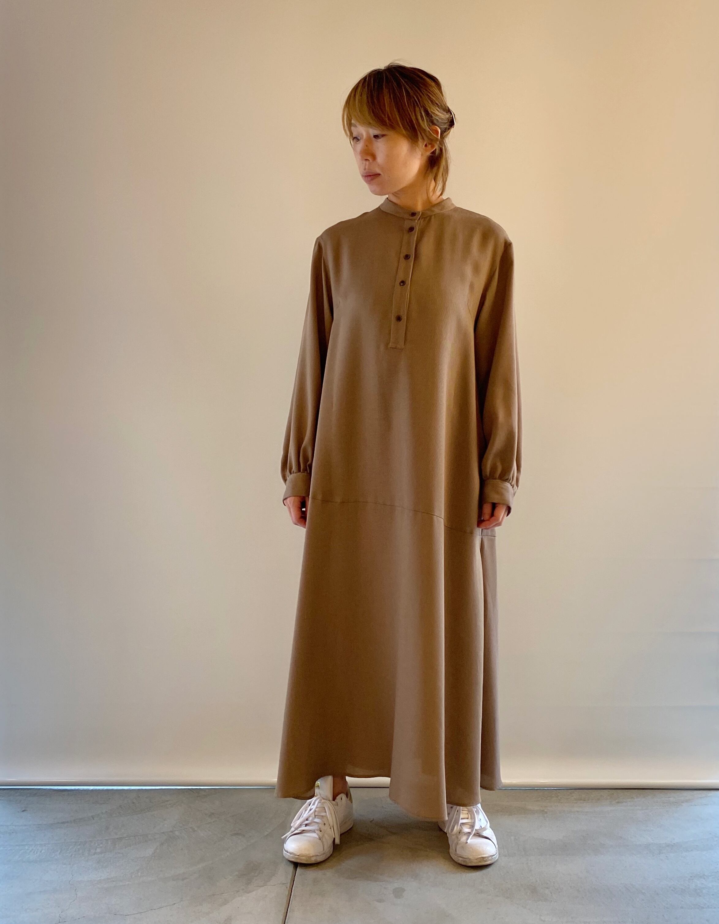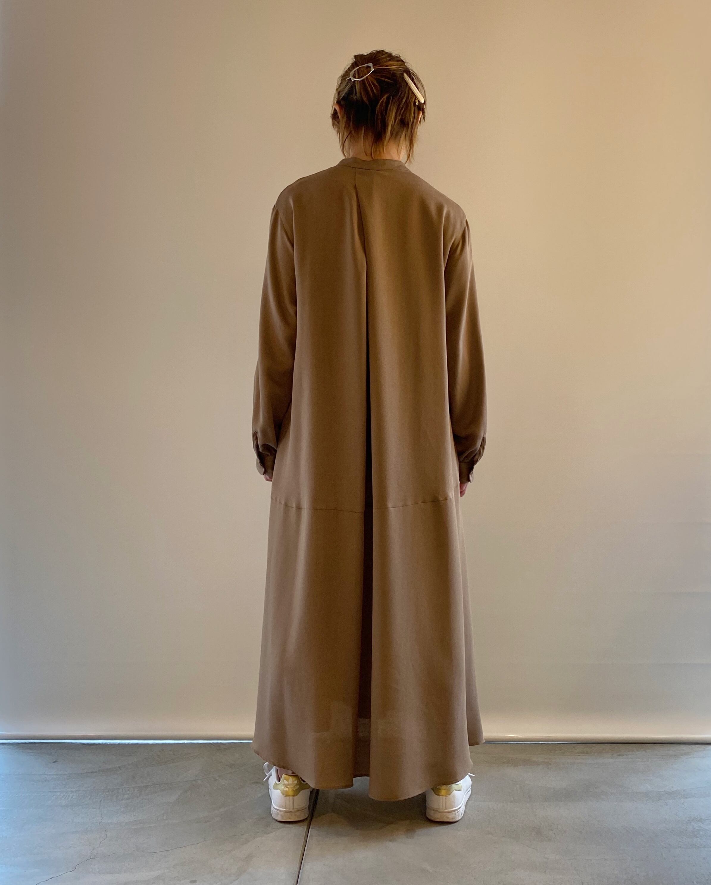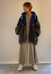 ワンピースのシルエットがゆったりなので、上にレイヤードする羽織りもあまりタイトなモノでない方がベター。