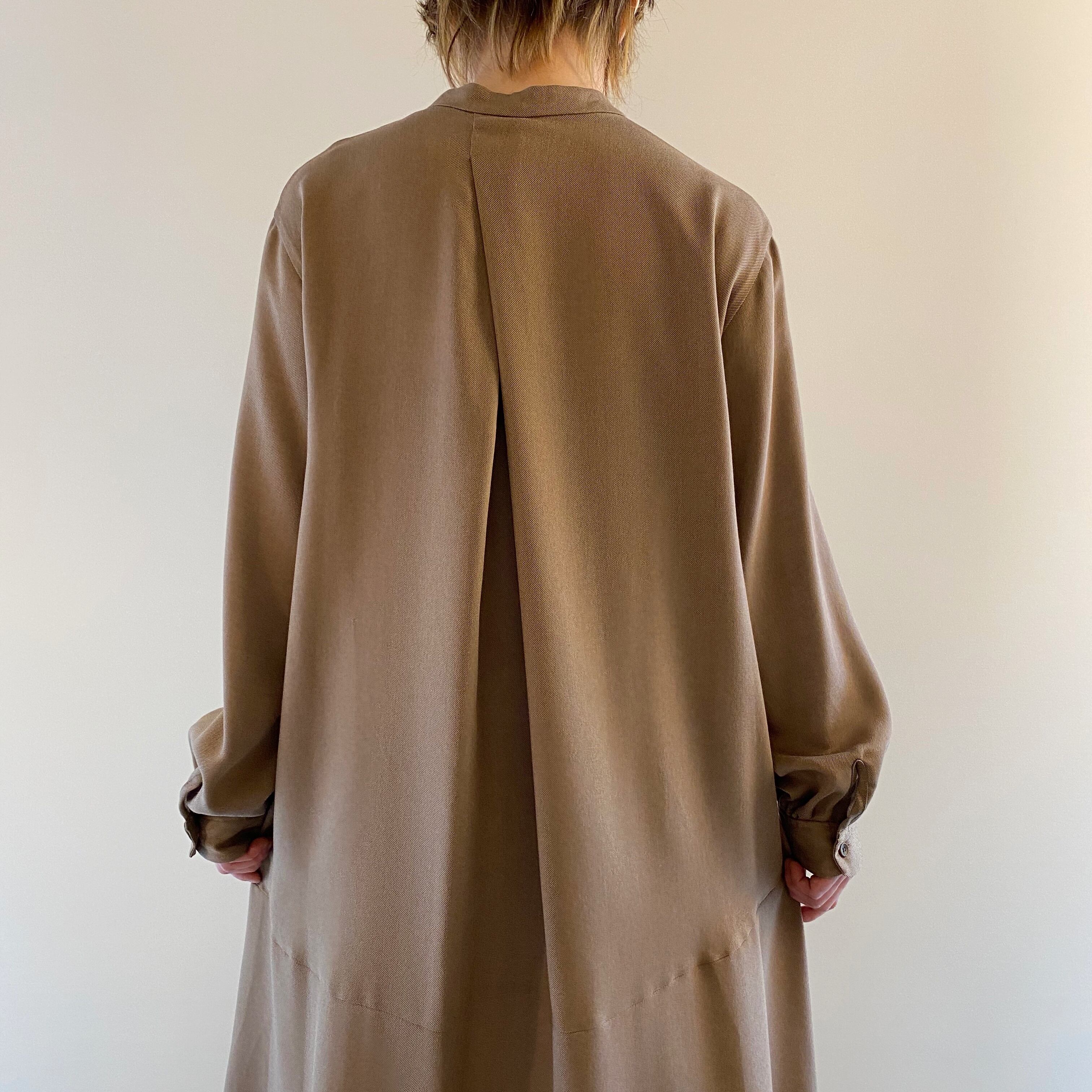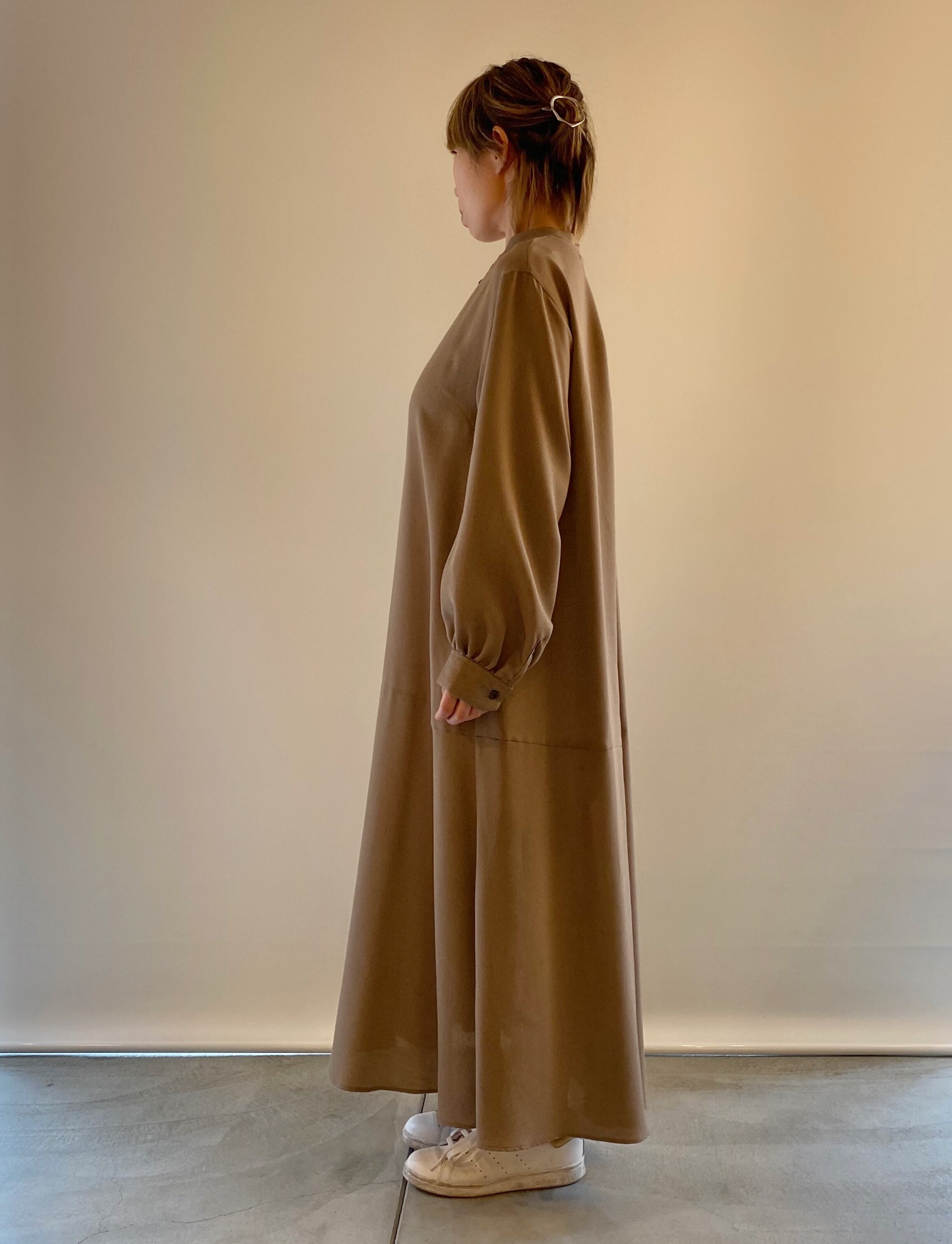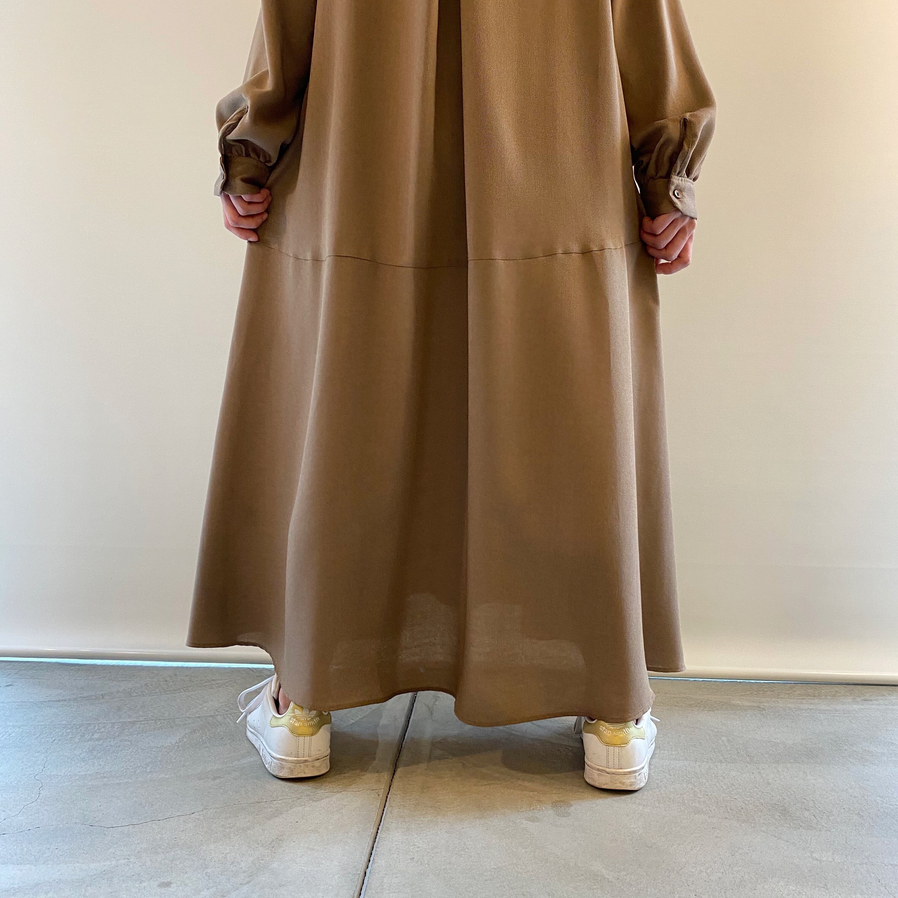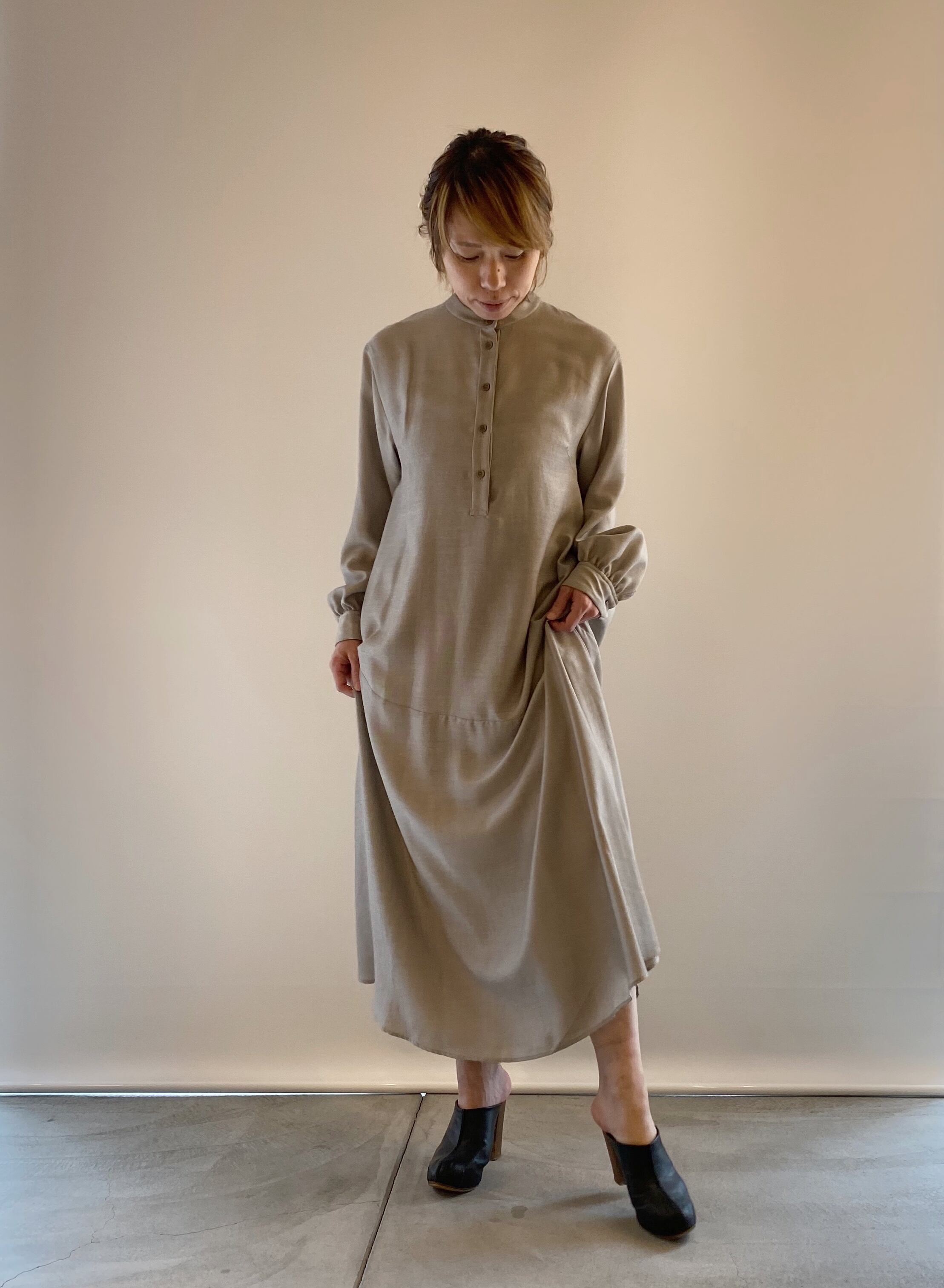 <Design Detail>基本的なデザインのベースは、si:m定番の異素材切り替えワンピ。(https://lhappiness.base.shop/items/28294423)。背中の中心から少しずらしたところにタックを入れて背中に奥行きのあるAラインシルエットを作り、更にそれをヒップの下で切り替えることで、広がり過ぎず円く立体的な形に。