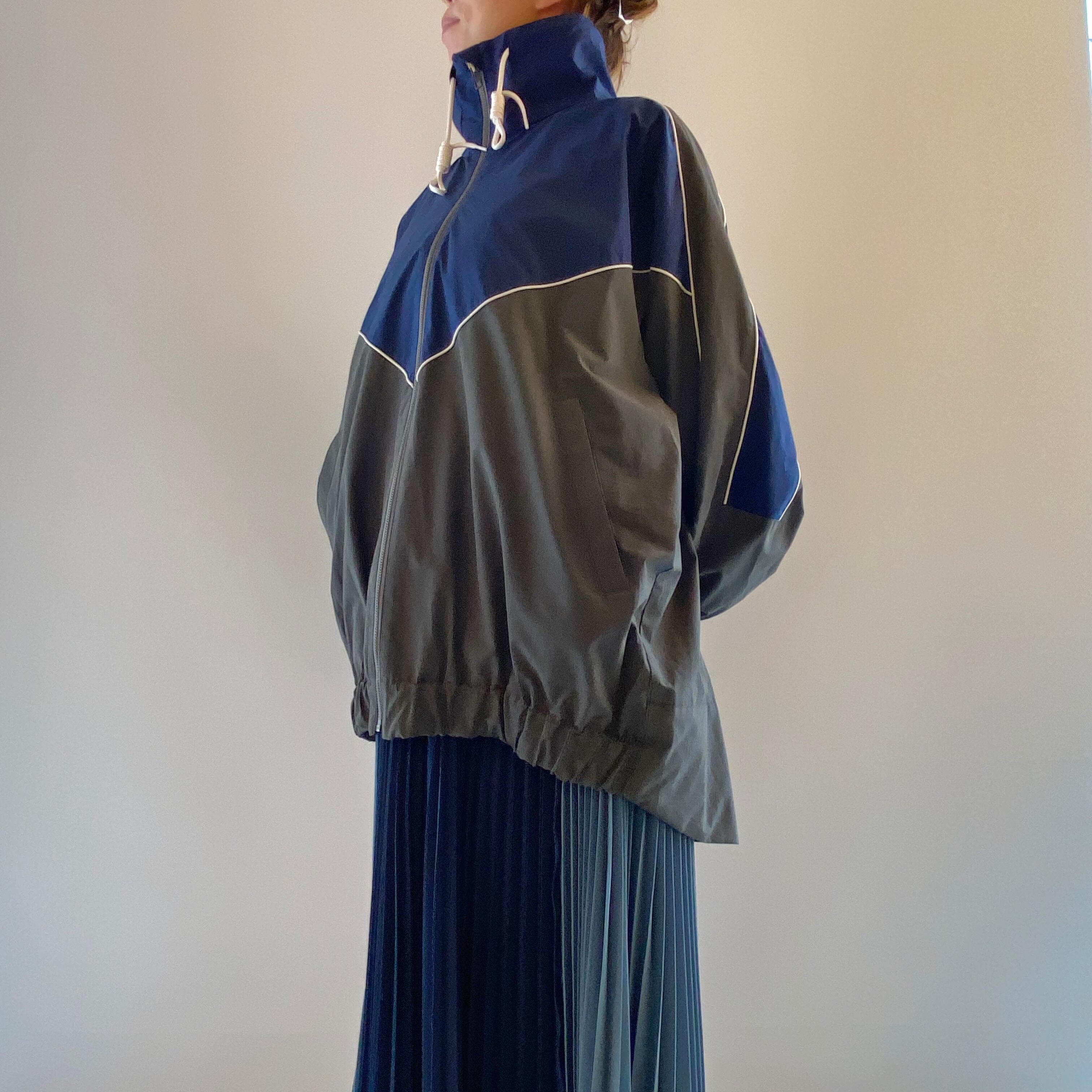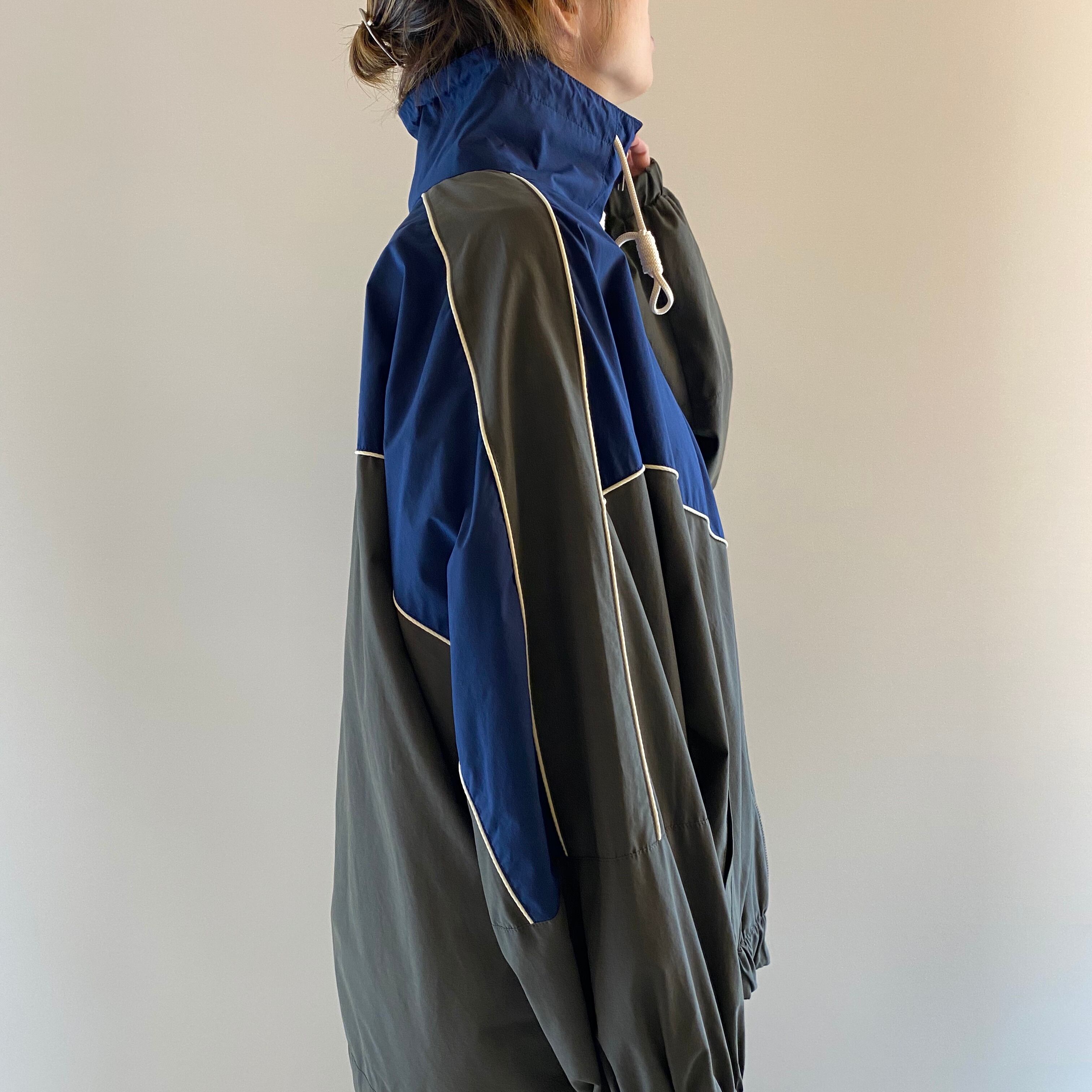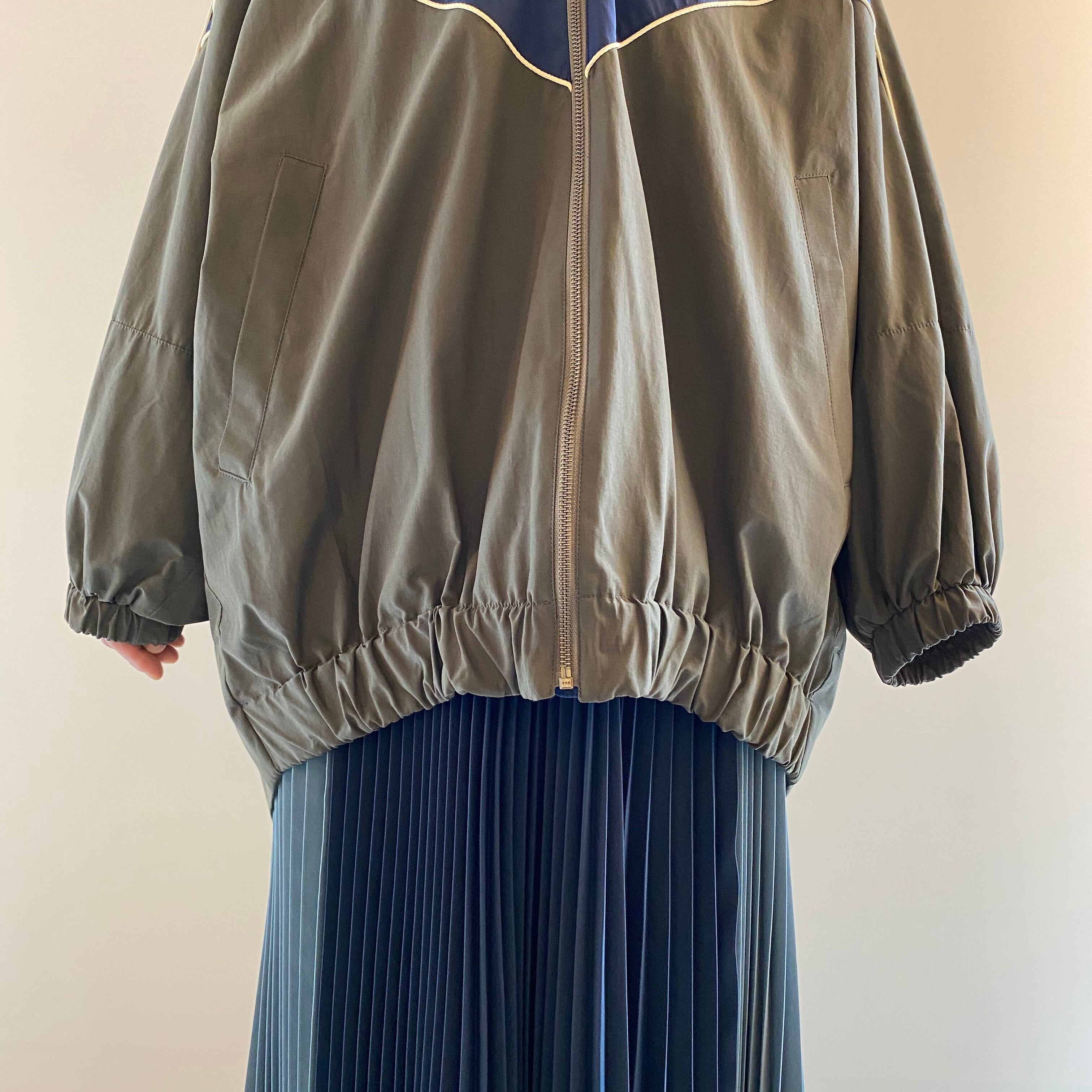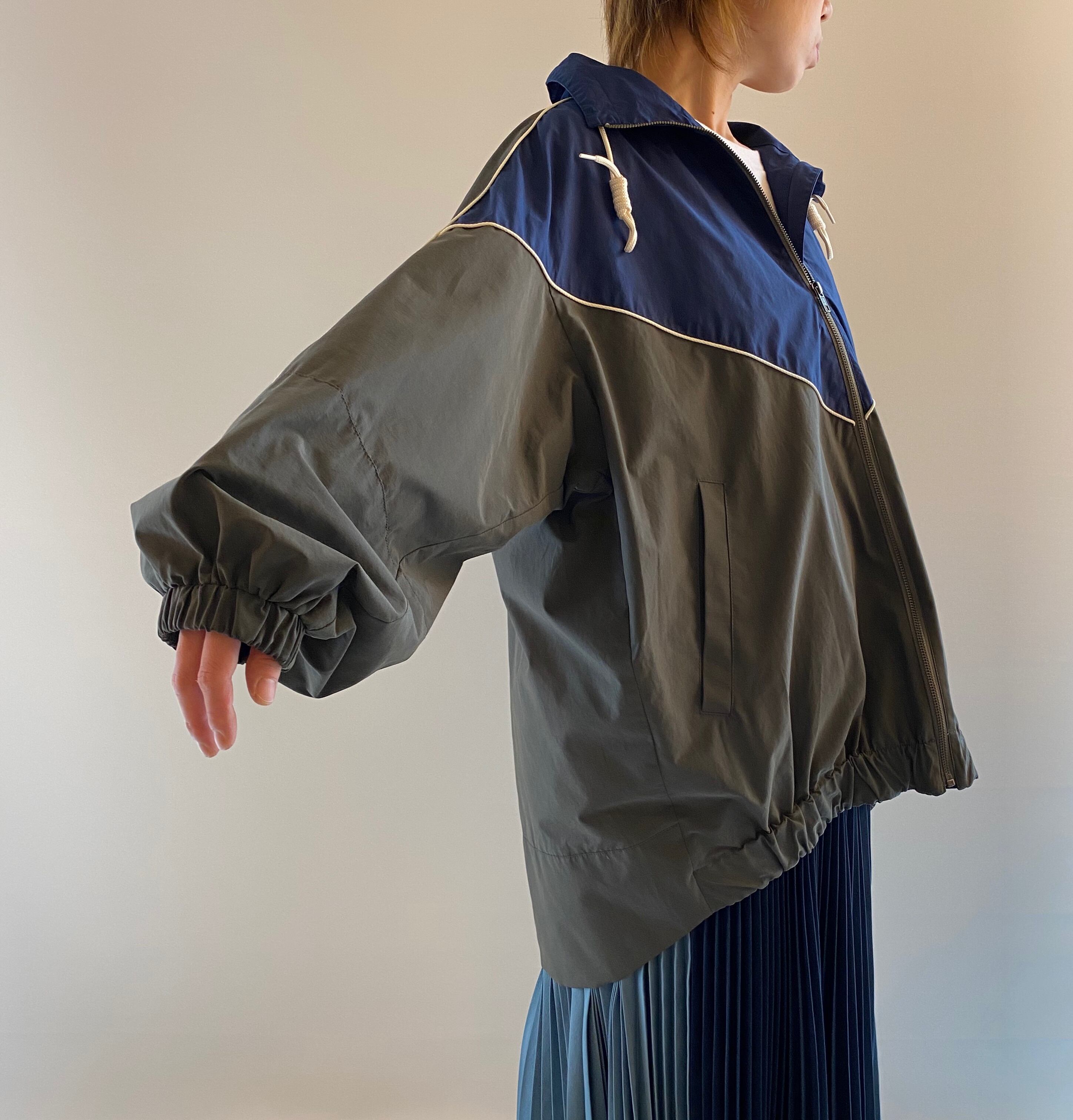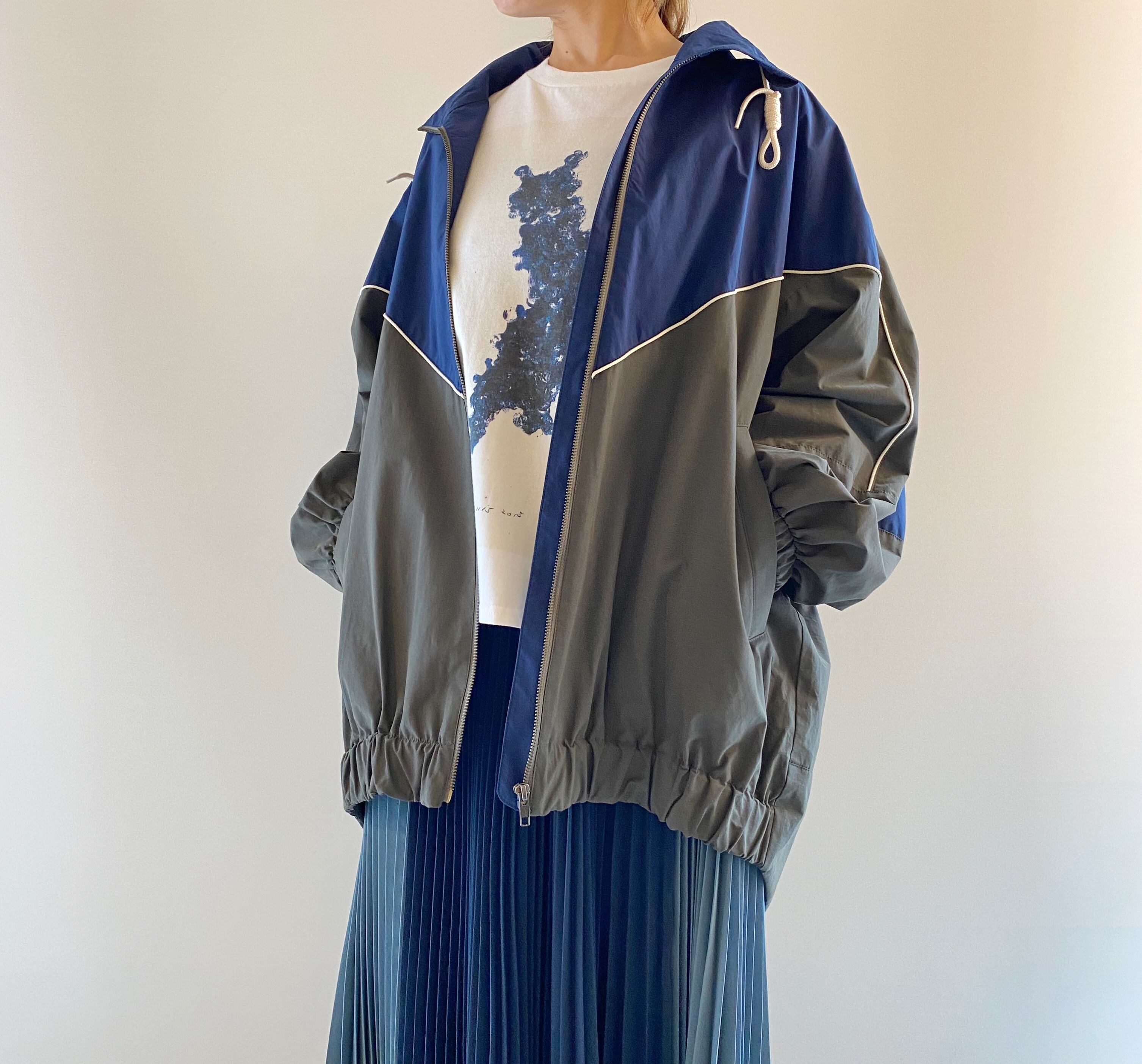 <Design Detail> オーバーサイズで後ろ下がりのスタジャン風なシルエット。撥水加工が施され、裏地も付いているので長い時期着れる風よけとして使えます。
