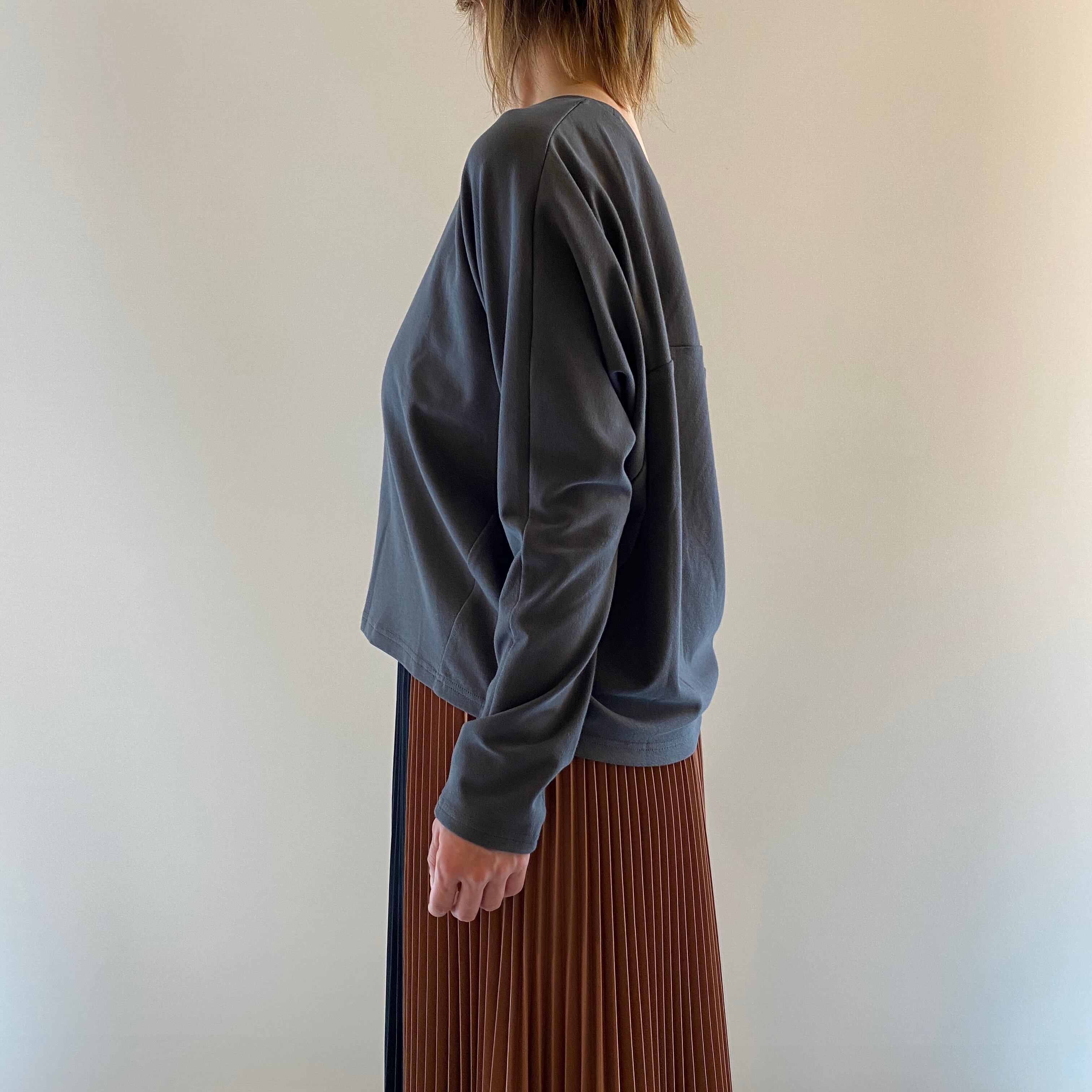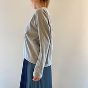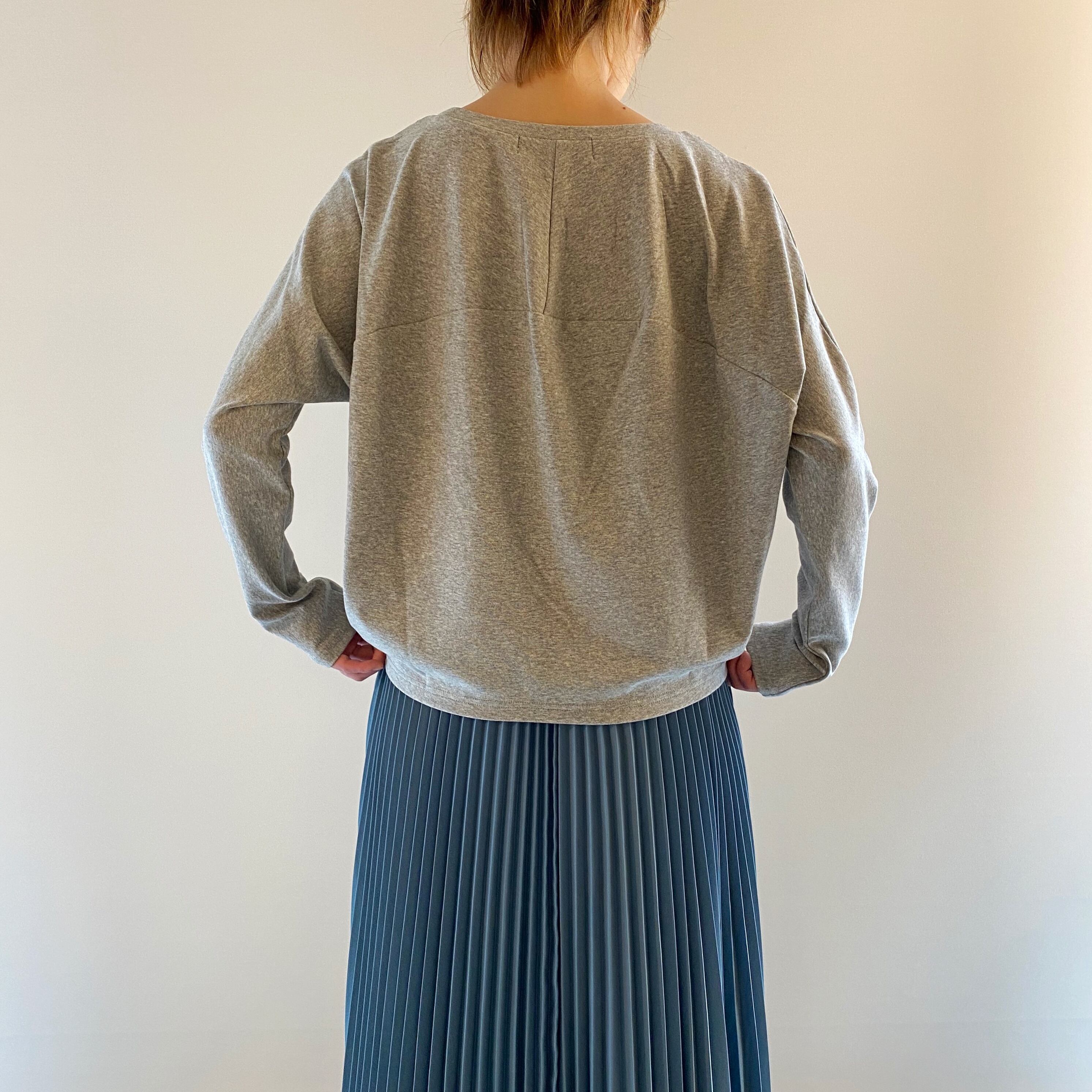 <Design Detail>後ろドレープのカットソー。裏面はメッシュ状になっており、柔らかく程良い肉感で肌離れも抜群のため、長い期間着用して頂けます。胸回りはゆったり+裾にかけて細くしているルエット+腕回りは細身でスッキリ、のメリハリを付けたデザインで細見え効果もあり。