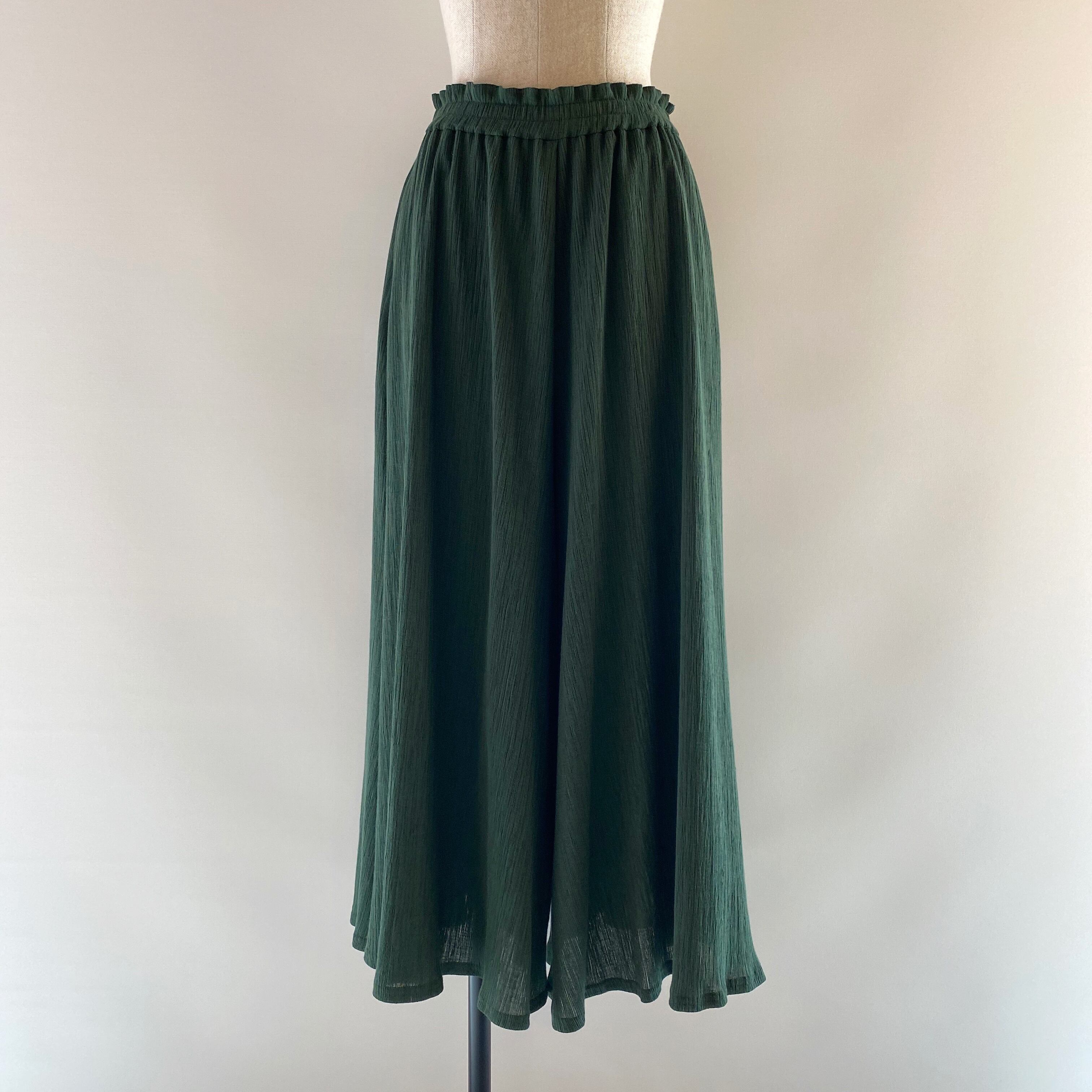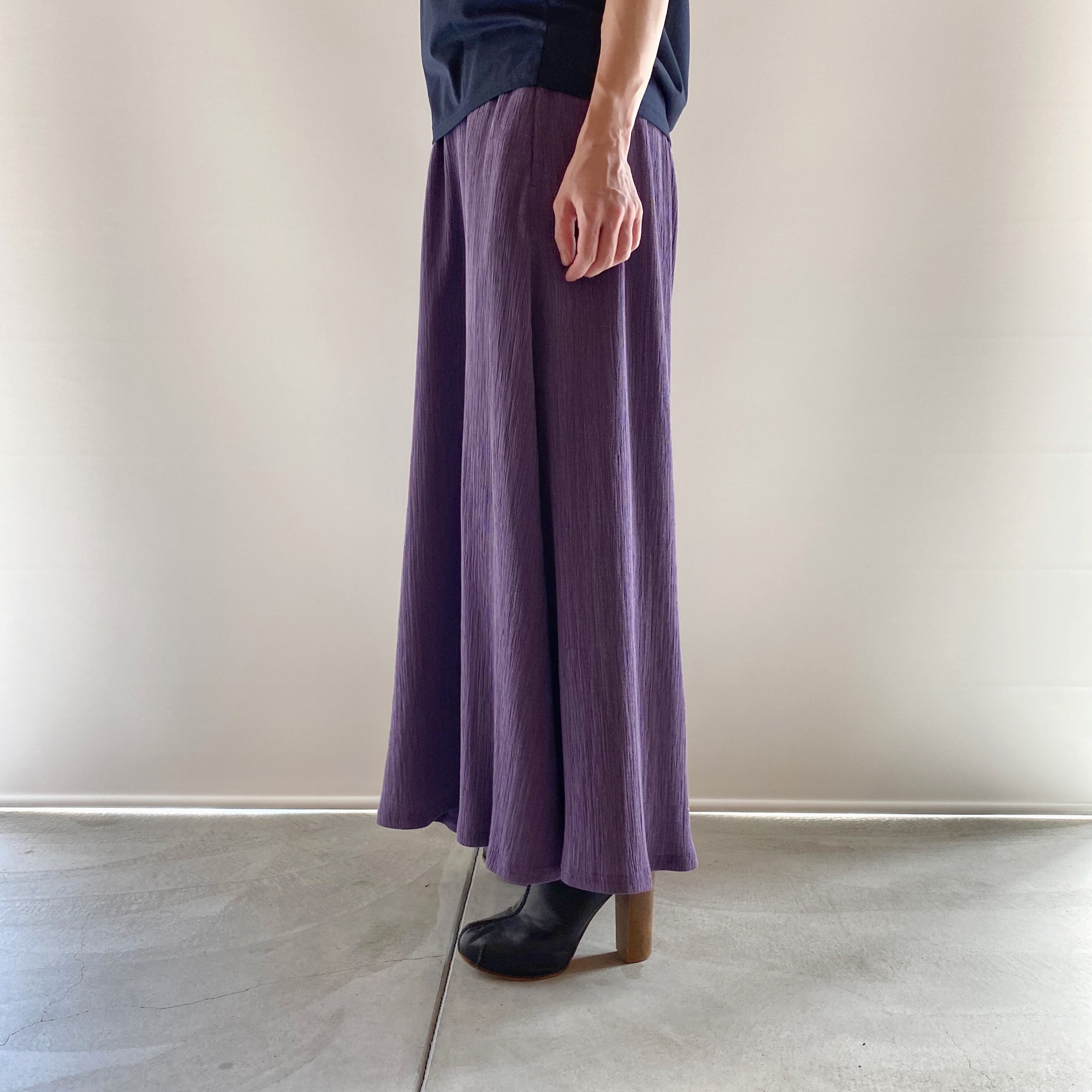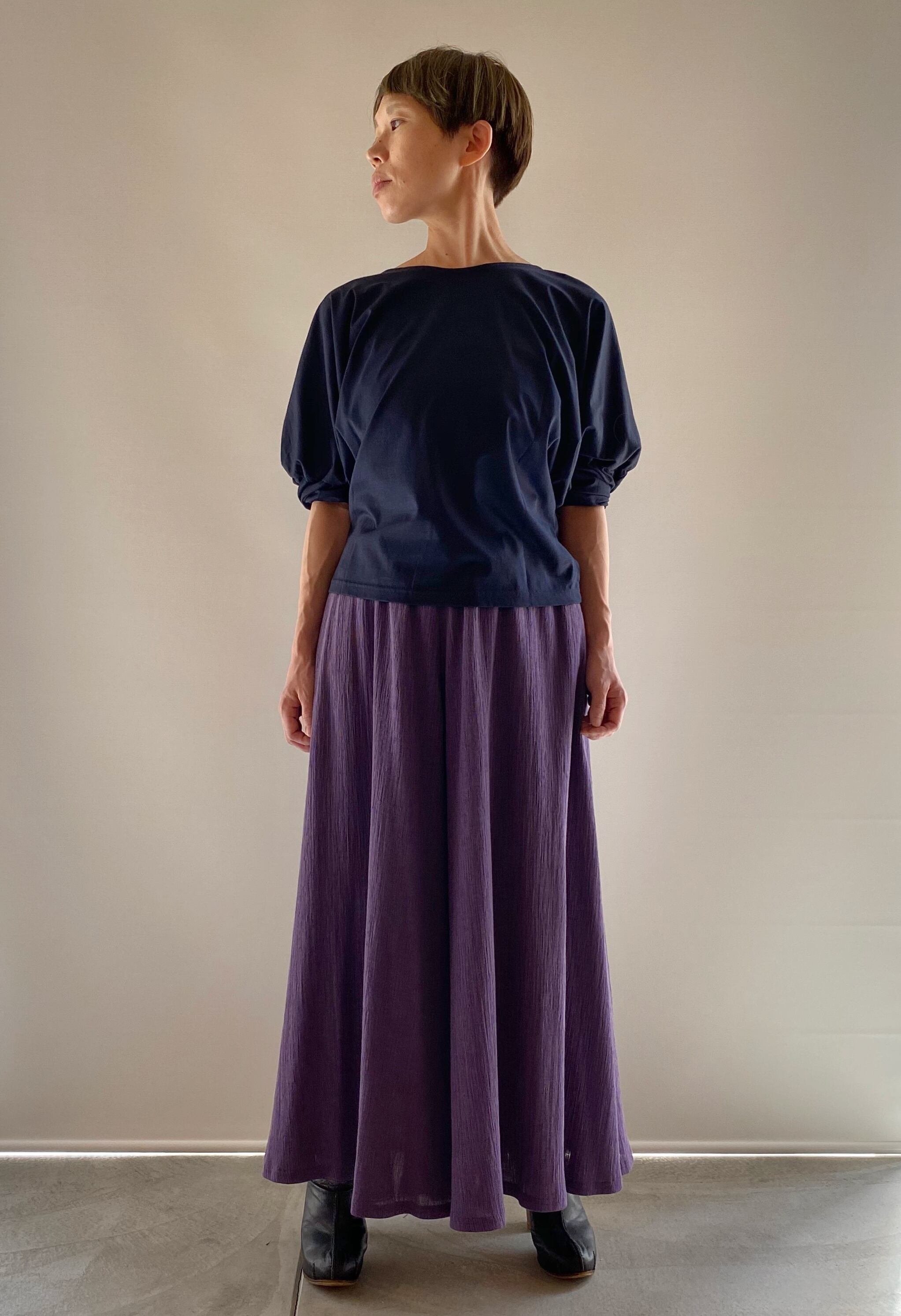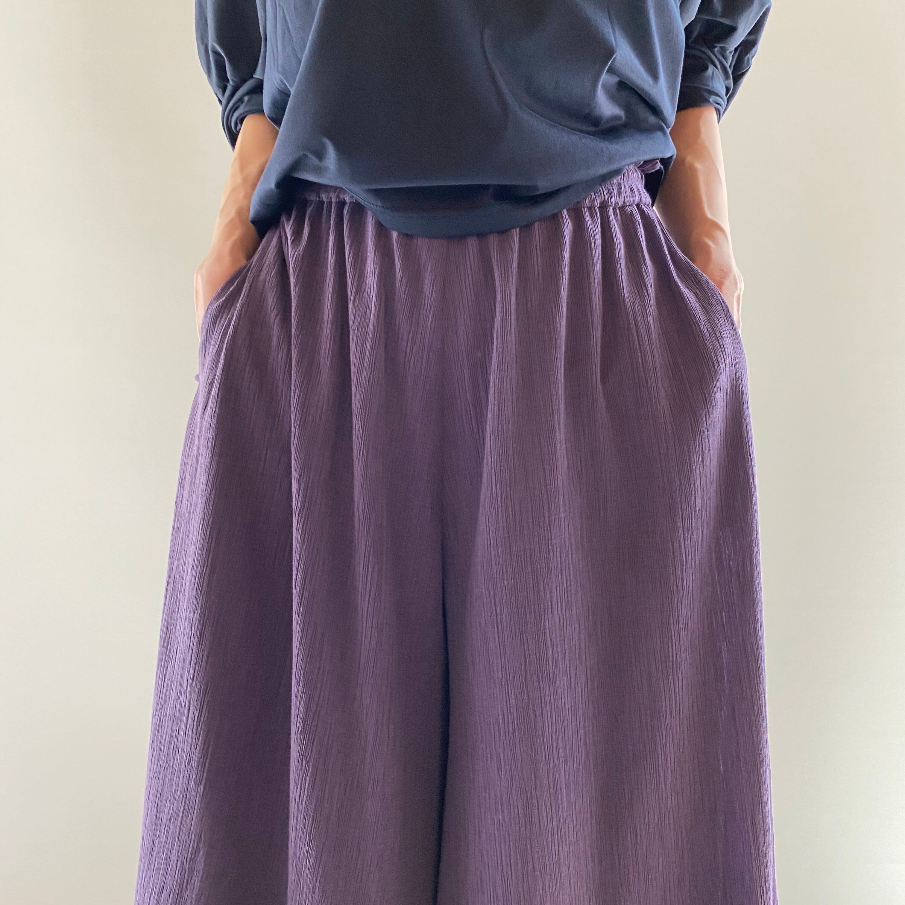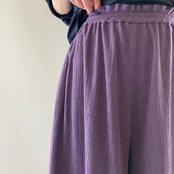 裾周り約140㎝ある極太のパンツですが、ウエストがギャザーでスカート見えするパンツです。パープルとグリーンのお色は、少しダスティーなトーンなので、ボトムに持ってきてもうるさくありません。
