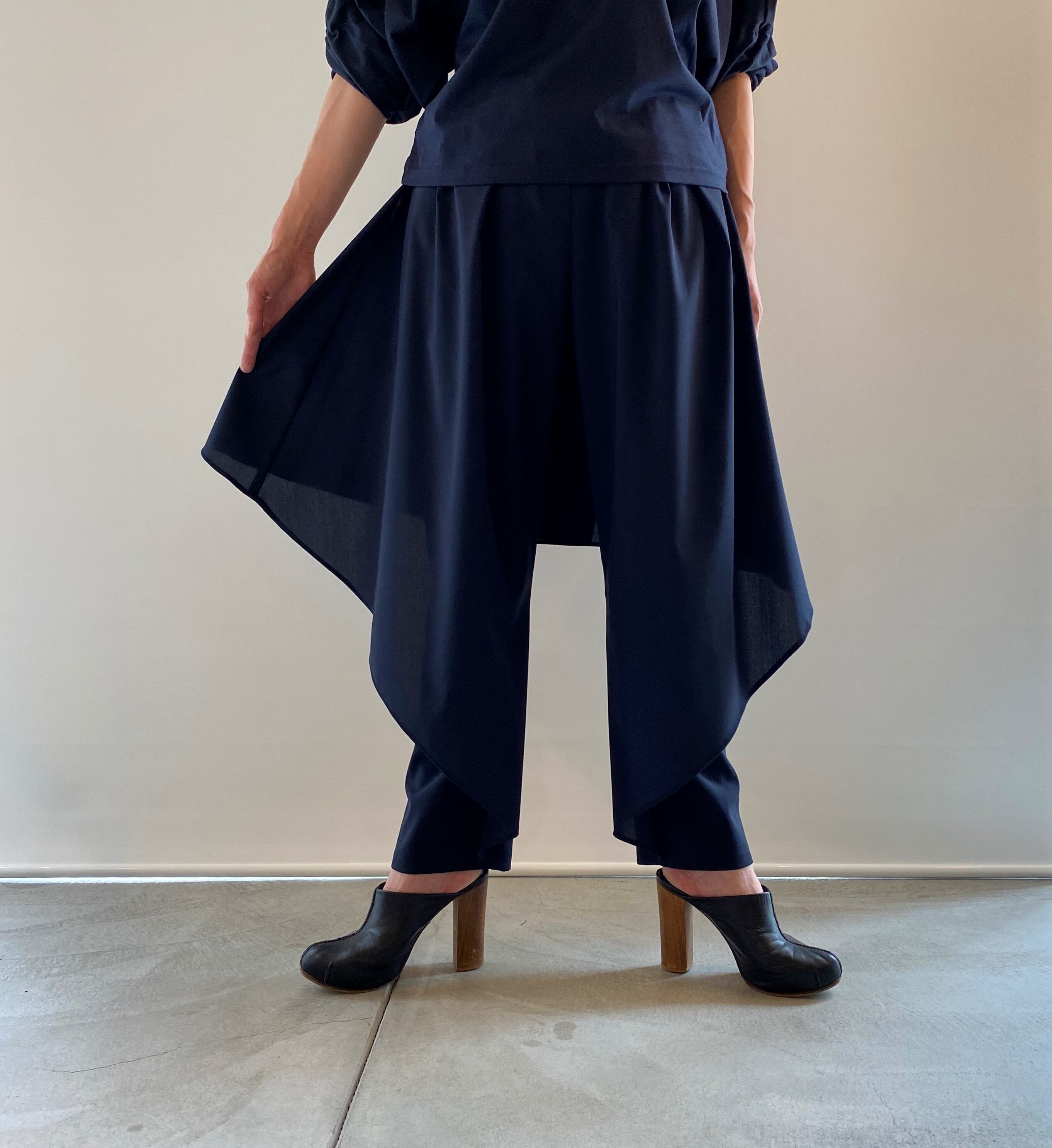 <Design Detail> パンツにスカートが巻き付いたシルエットのアラビアン風パンツ。ウエストのタックの入り方も絶妙です。