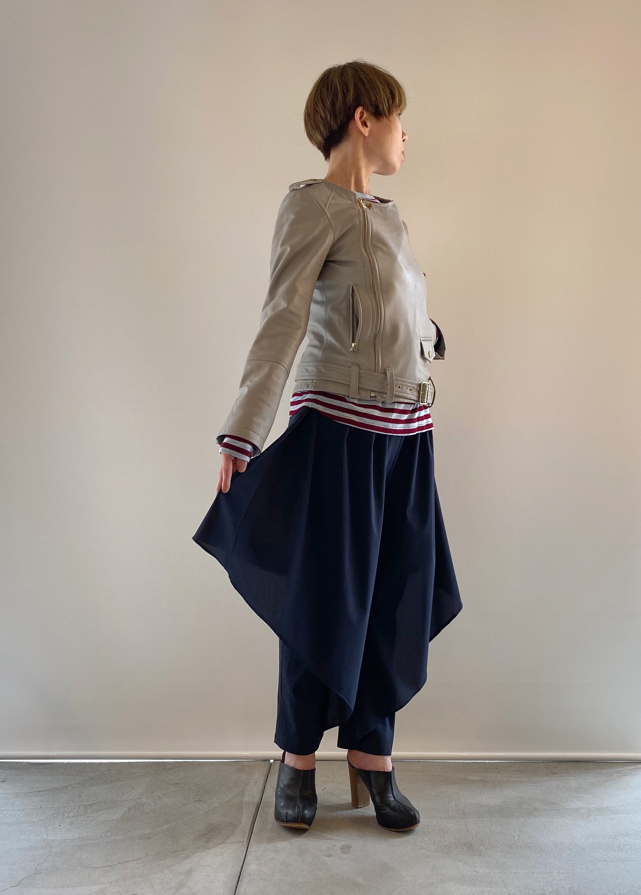 <Coordinate tips> スカートが付いて一見難しそうですが落ち感のある生地で、スカートにそんなにボリュームは出ないので、わりと色々なシーンでお使いいただけると思います。写真のように、レザージャケットでトップを短めでキュッとすると、スカートパンツのボリュームが活きますし、ちょっと眺めでゆるっとしたトップスを合わせると逆にスカートのボリュームが抑えられてなじみます。