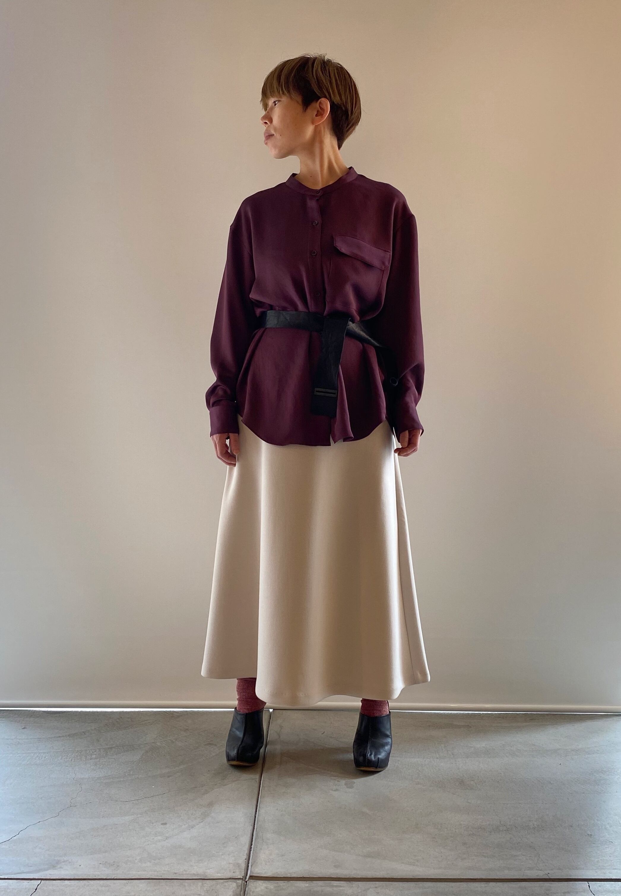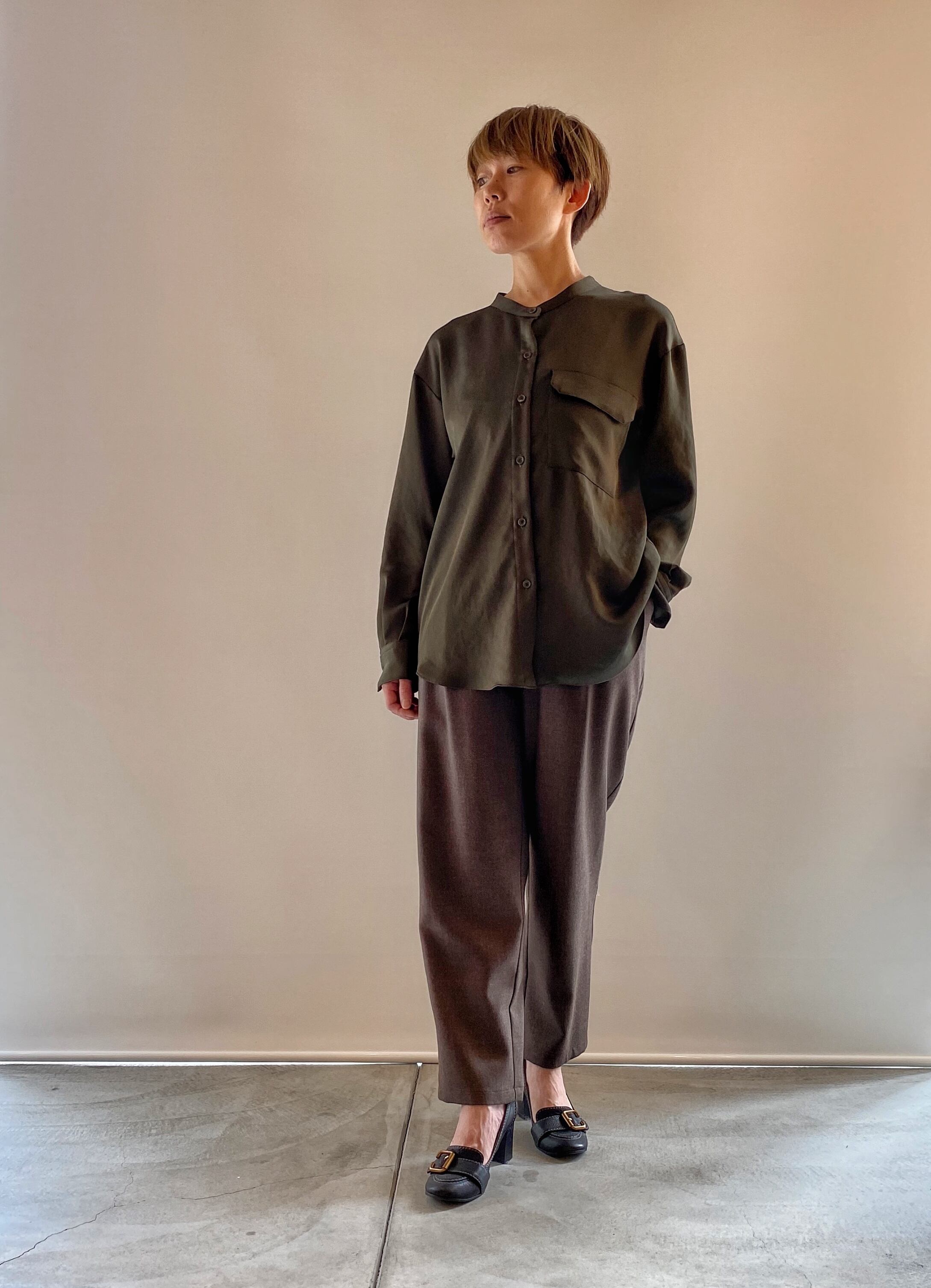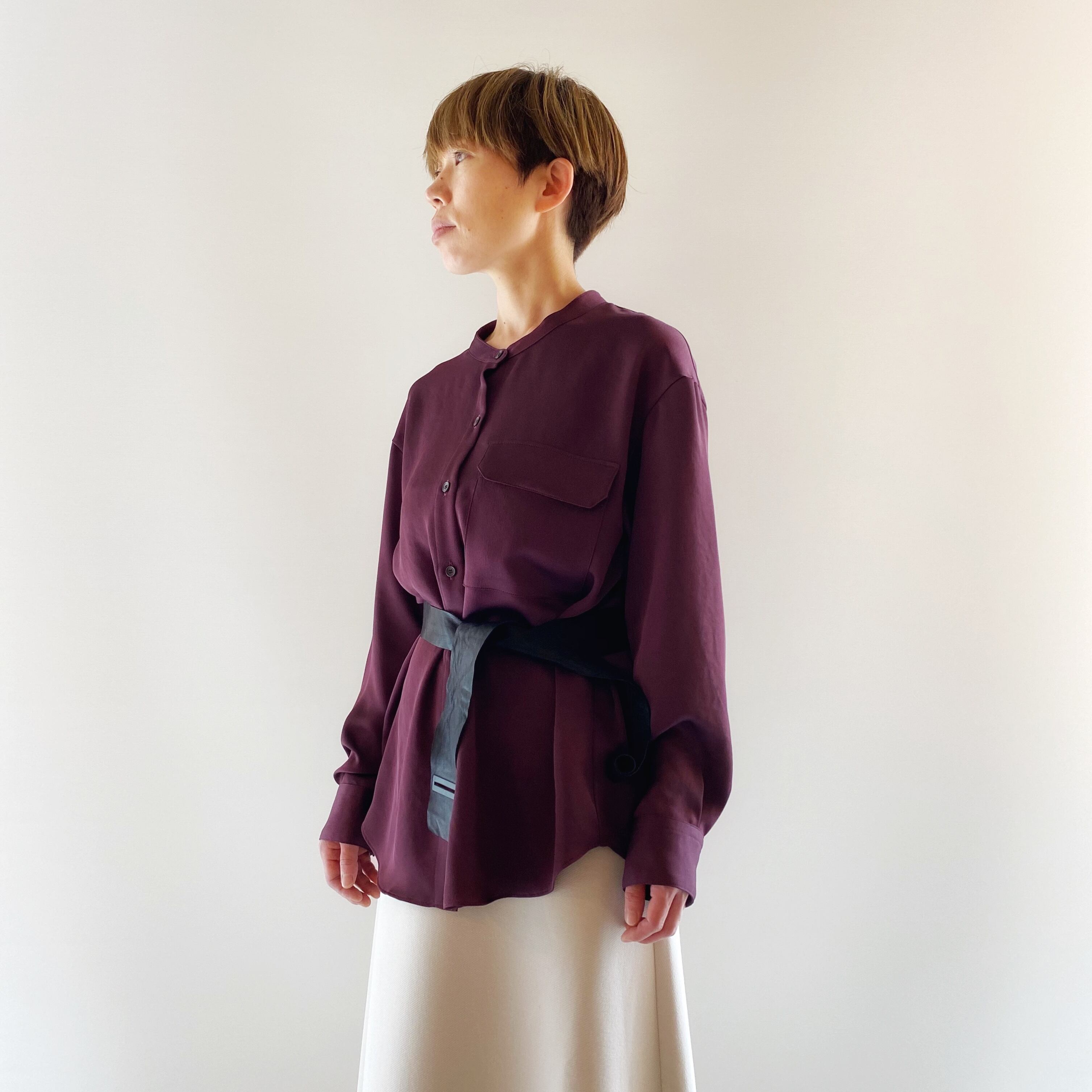 <Design Detail> 程よく厚みがあり上品でマットなサテン素材。胸元に大き目なポケットが気楽感を演出。 詰まり気味な丸首とオーバーサイズなシルエット。