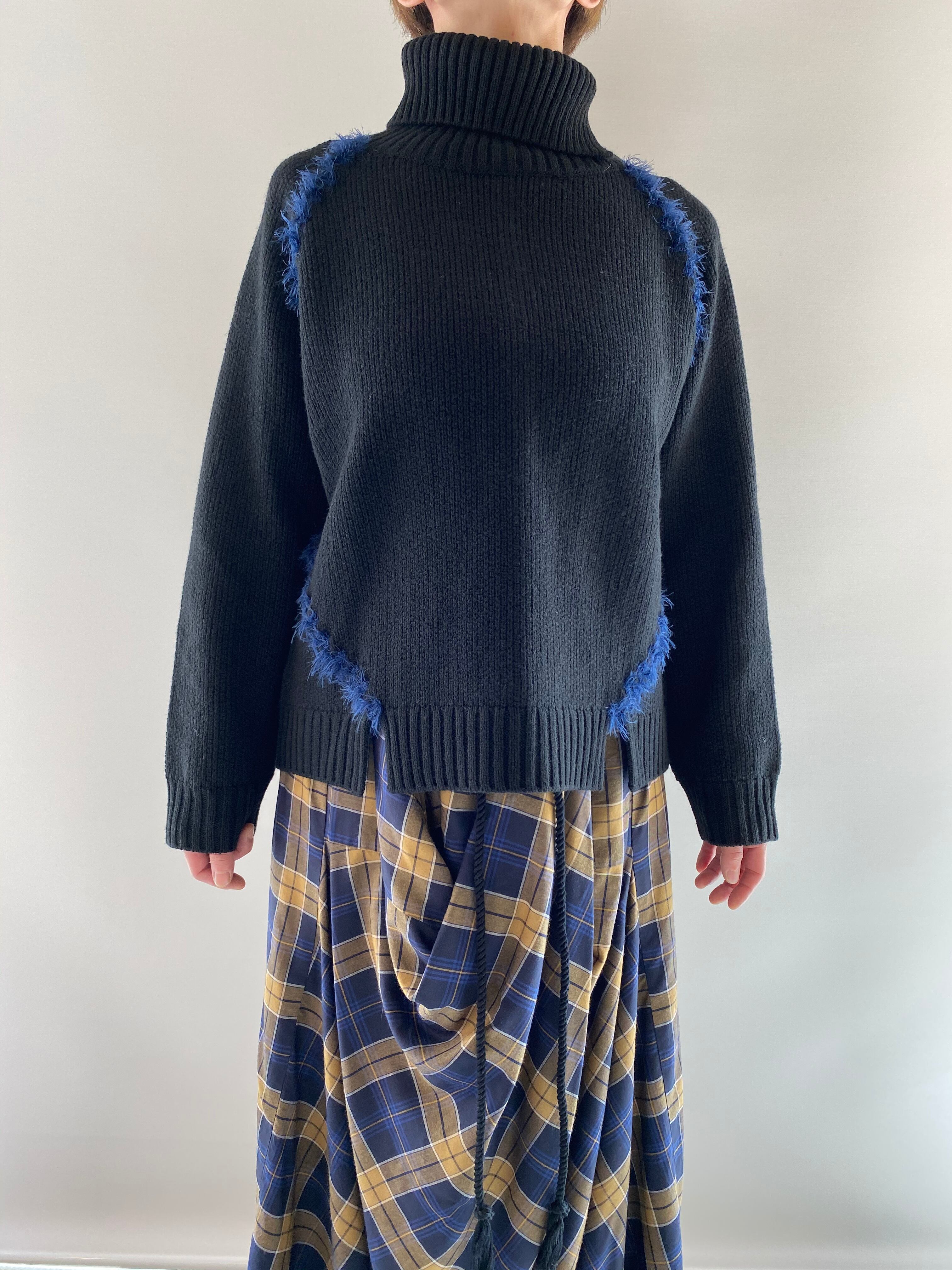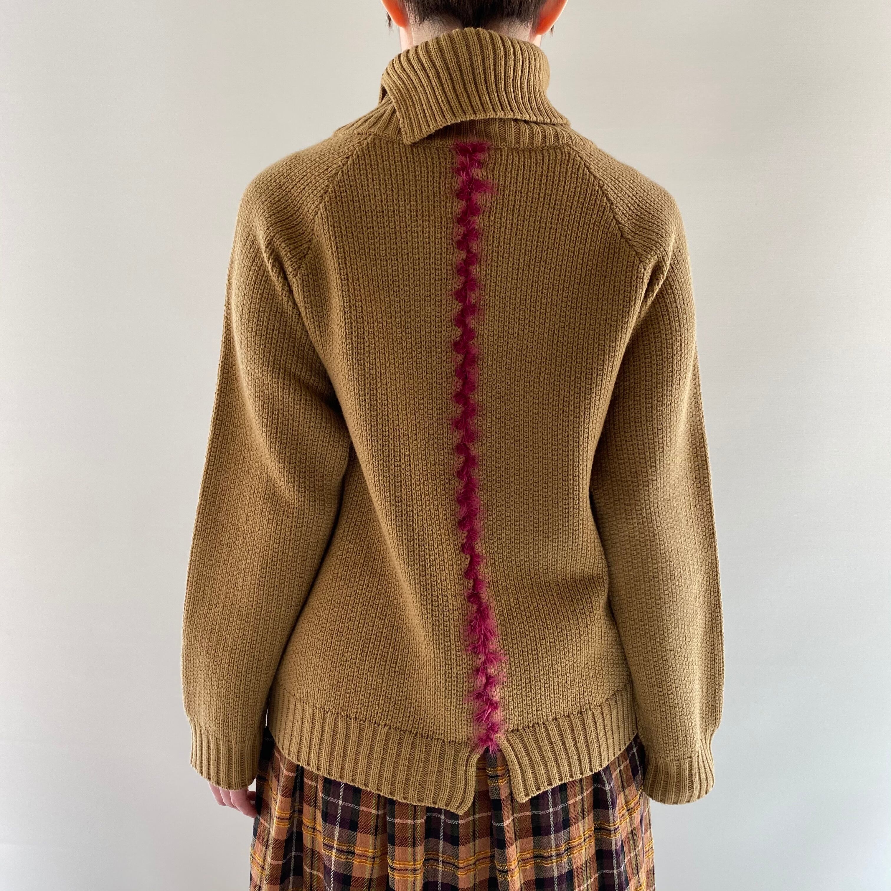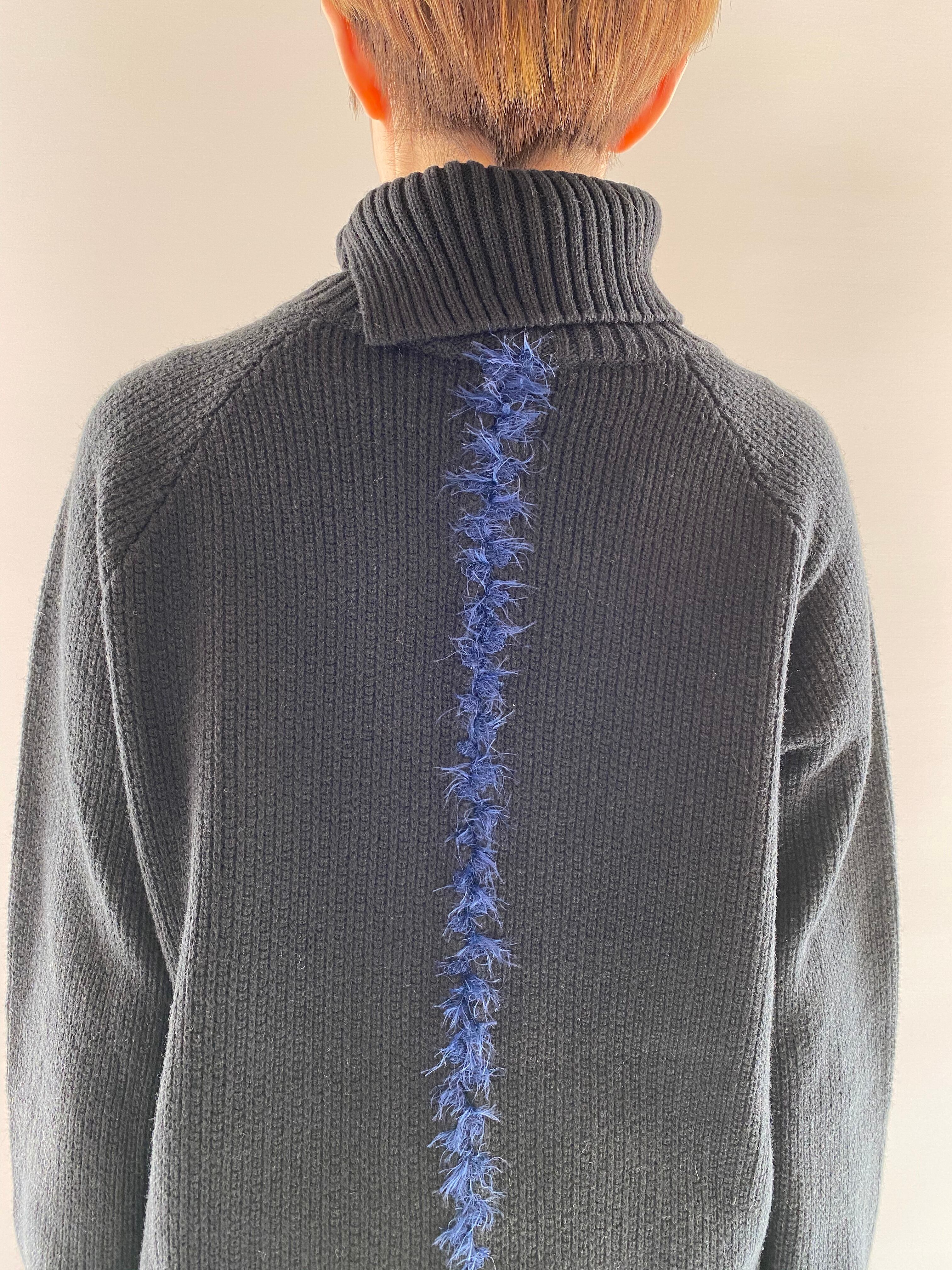 形はシンプルですが、キャメルにピンク、ブラックにブルーのモール糸が目を引き、前からも後ろからもおシャレなセーターです。