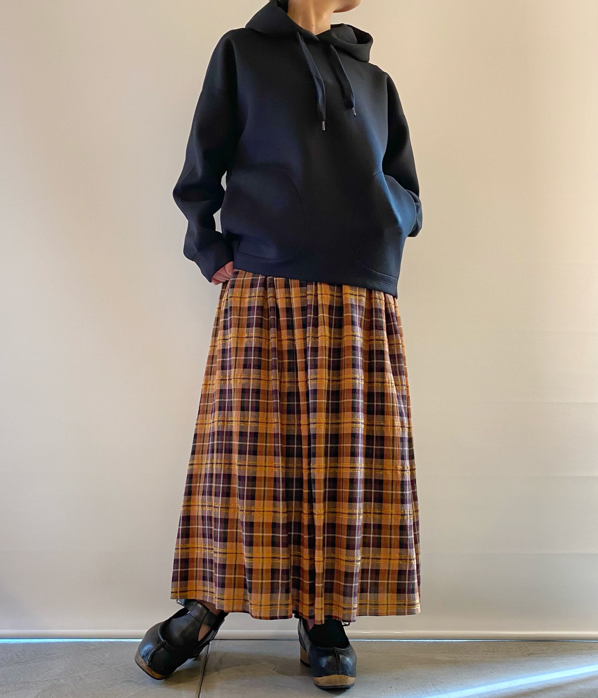 <Coordinate Tips>パンプキンカラーのチェックは合わせやすく、黒、オフホワイト、ネイビー、チャコールグレー、ベージュの基本カラーから、スカートに入っている、ボルドーやグリーンと合わせても。