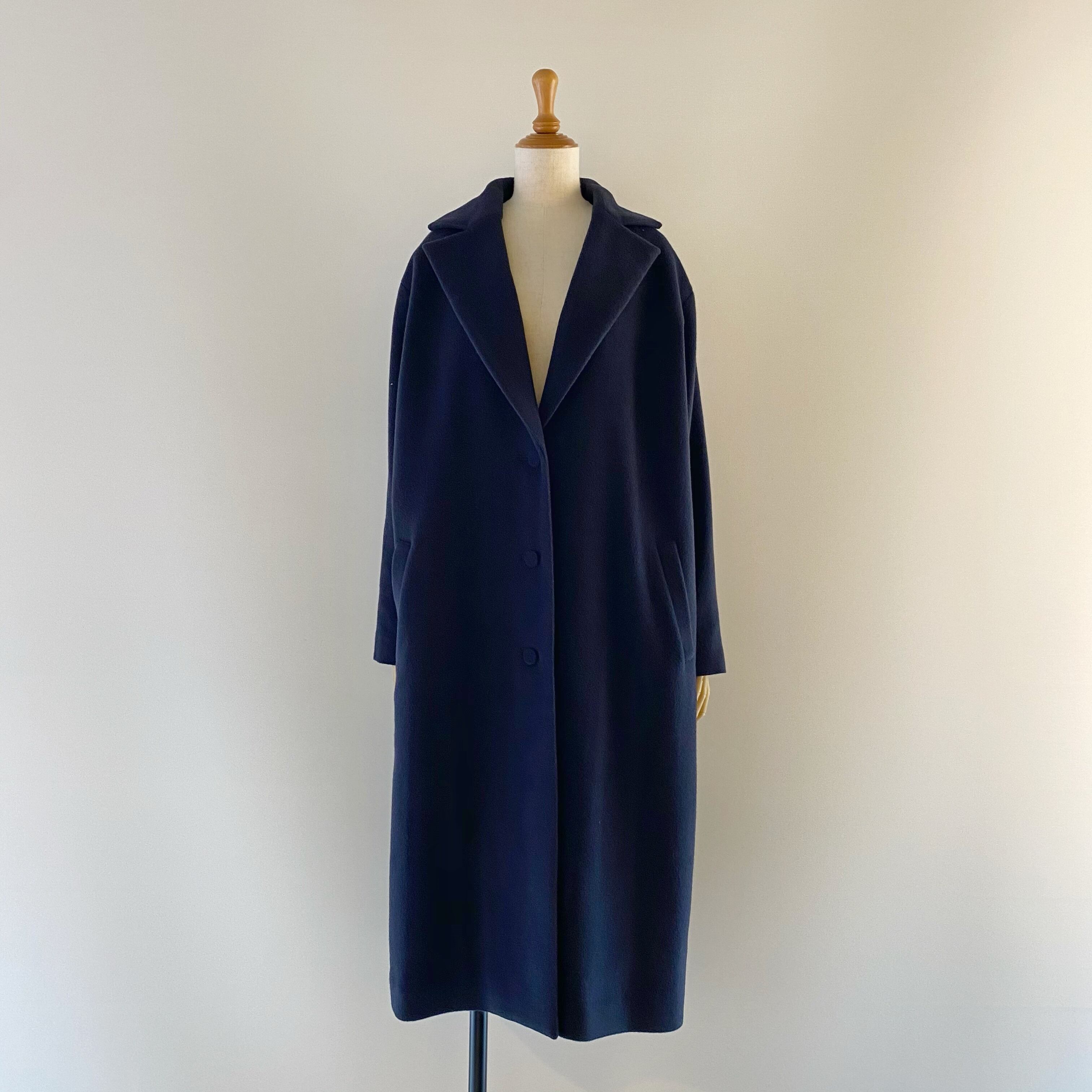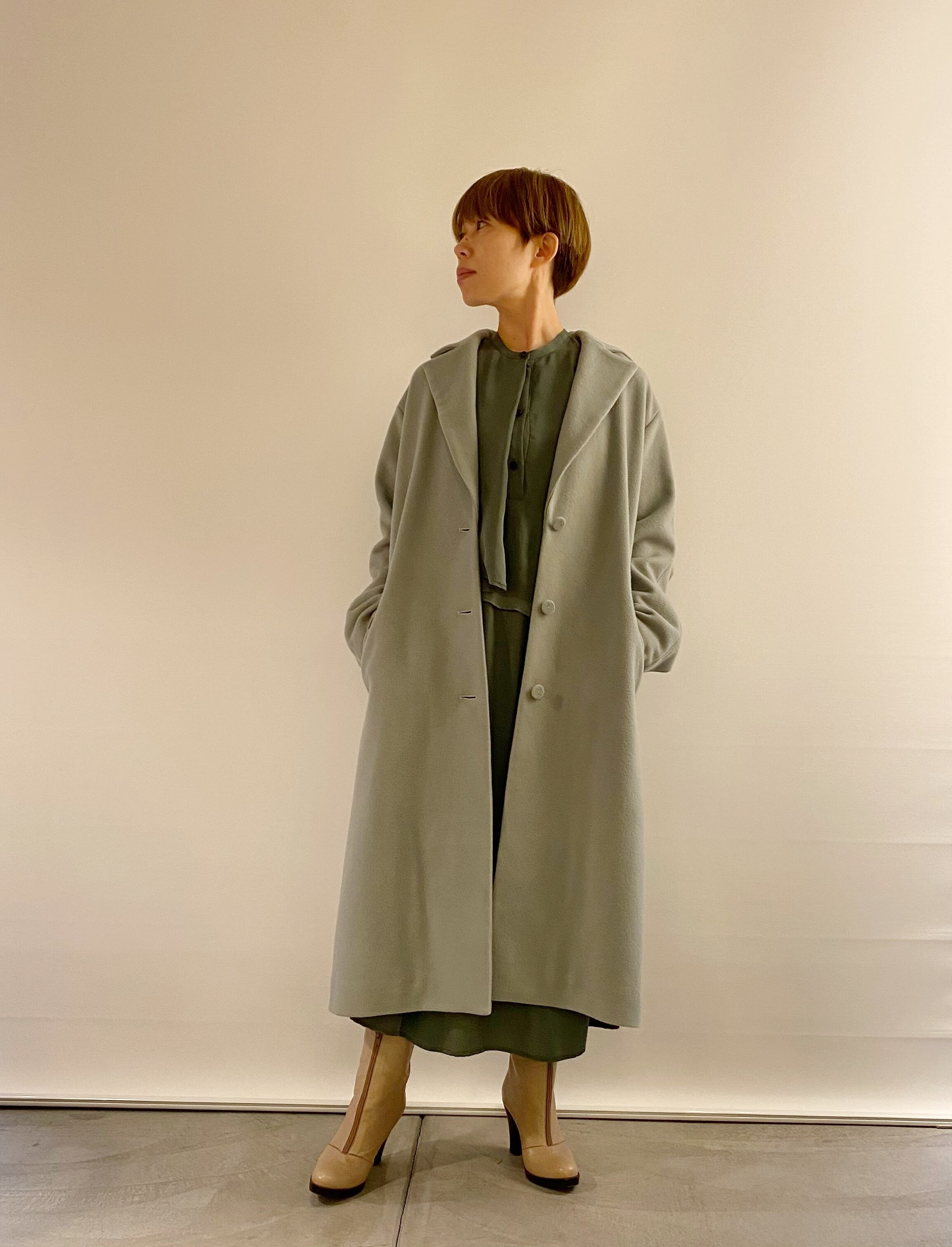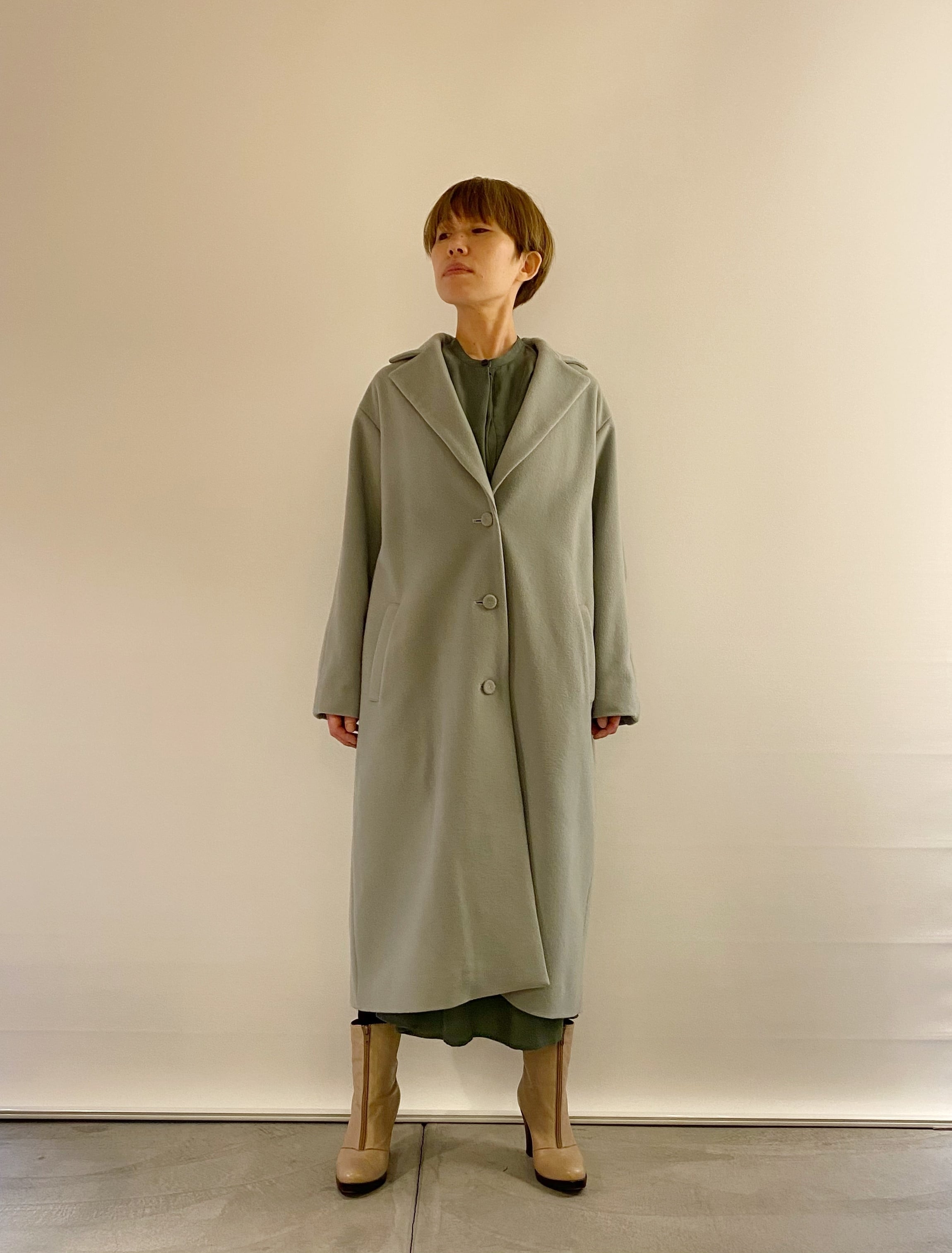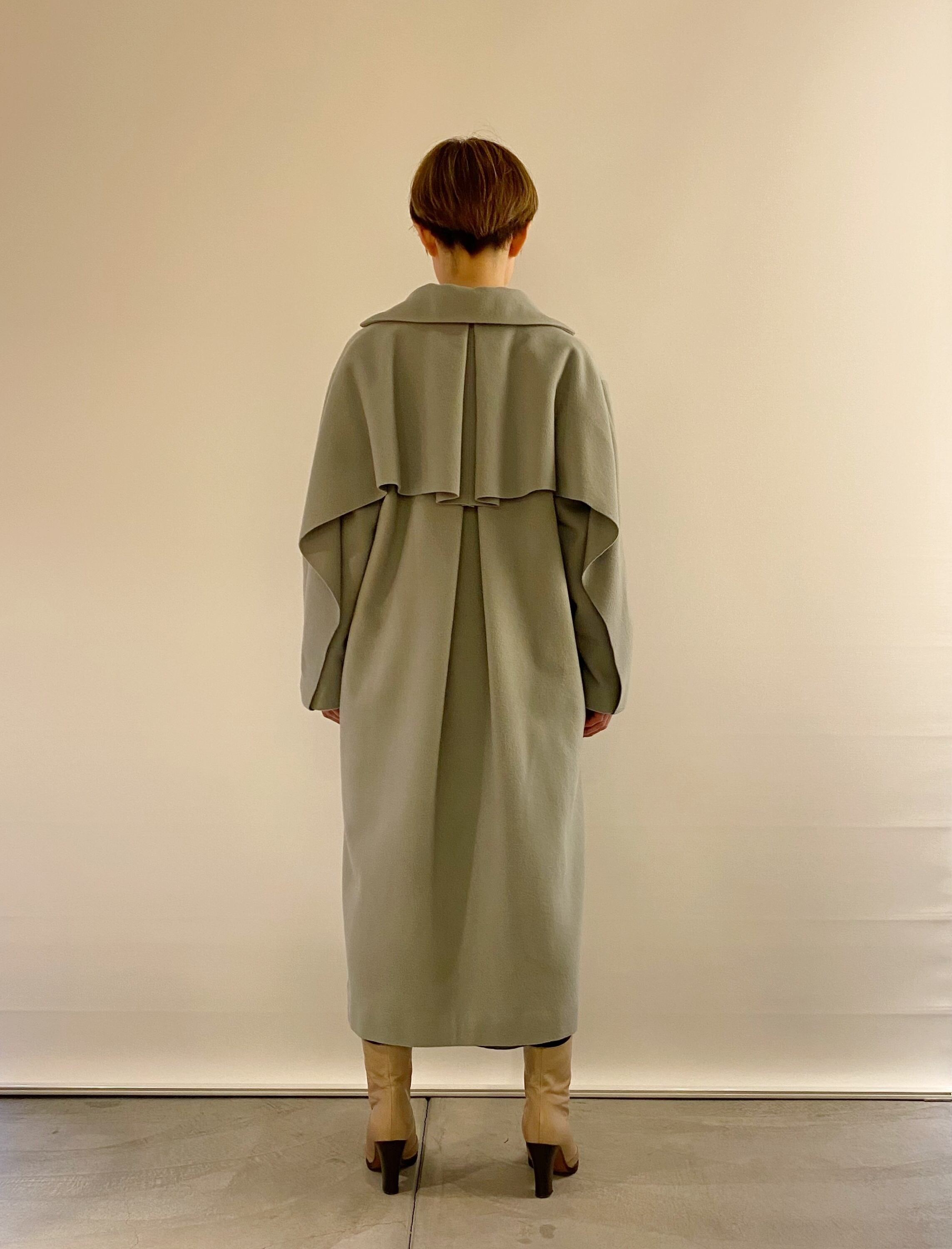 <Design Detail> 肩のヨークが袖まで伸びた、ケープを纏っているような雰囲気の変形チェスターコート。カシミヤが入っていることで、柔らかい風合いでしっかりした生地感の割に軽いです。