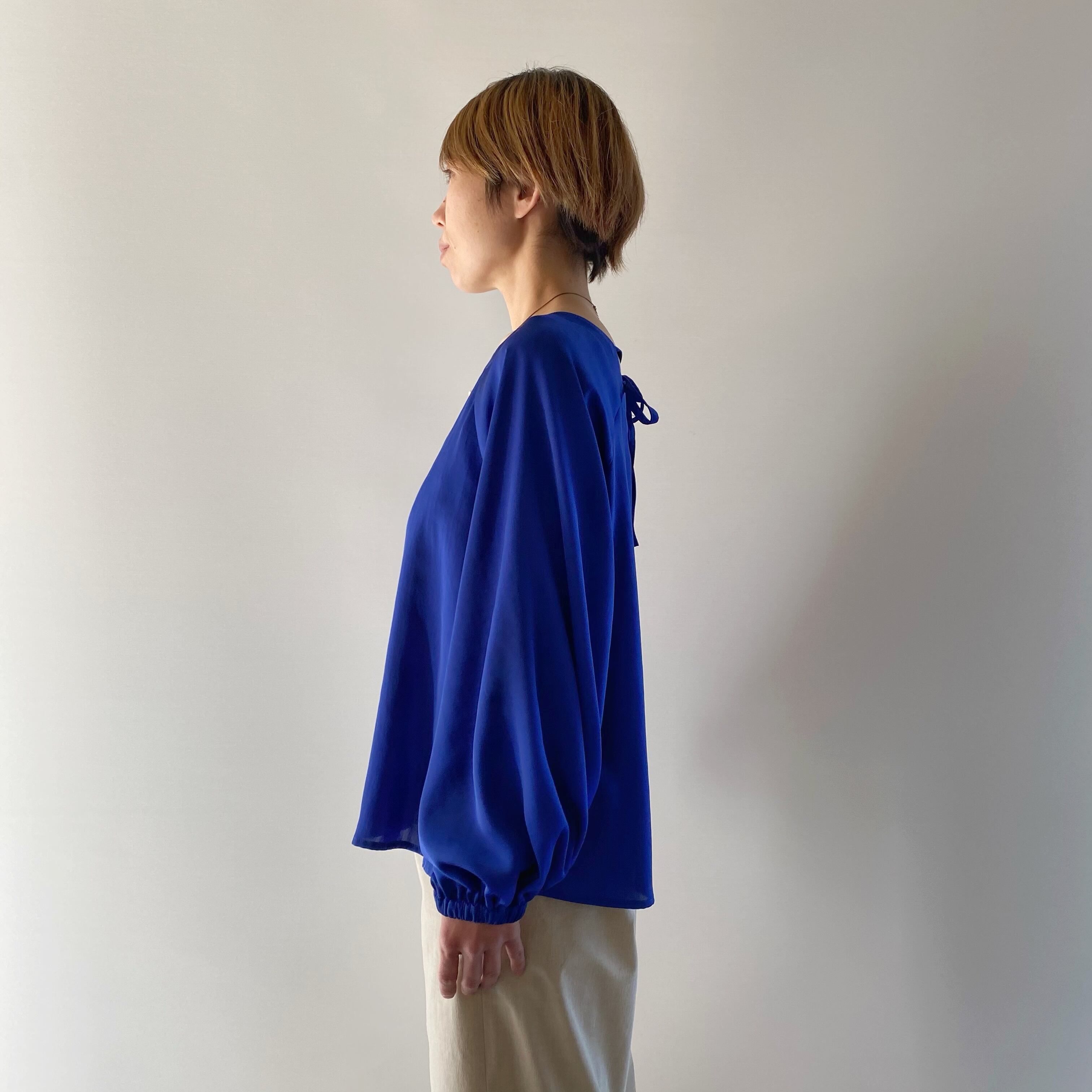 ボリューム袖でもトロミ素材で、ジャケットとのコーデも問題なし