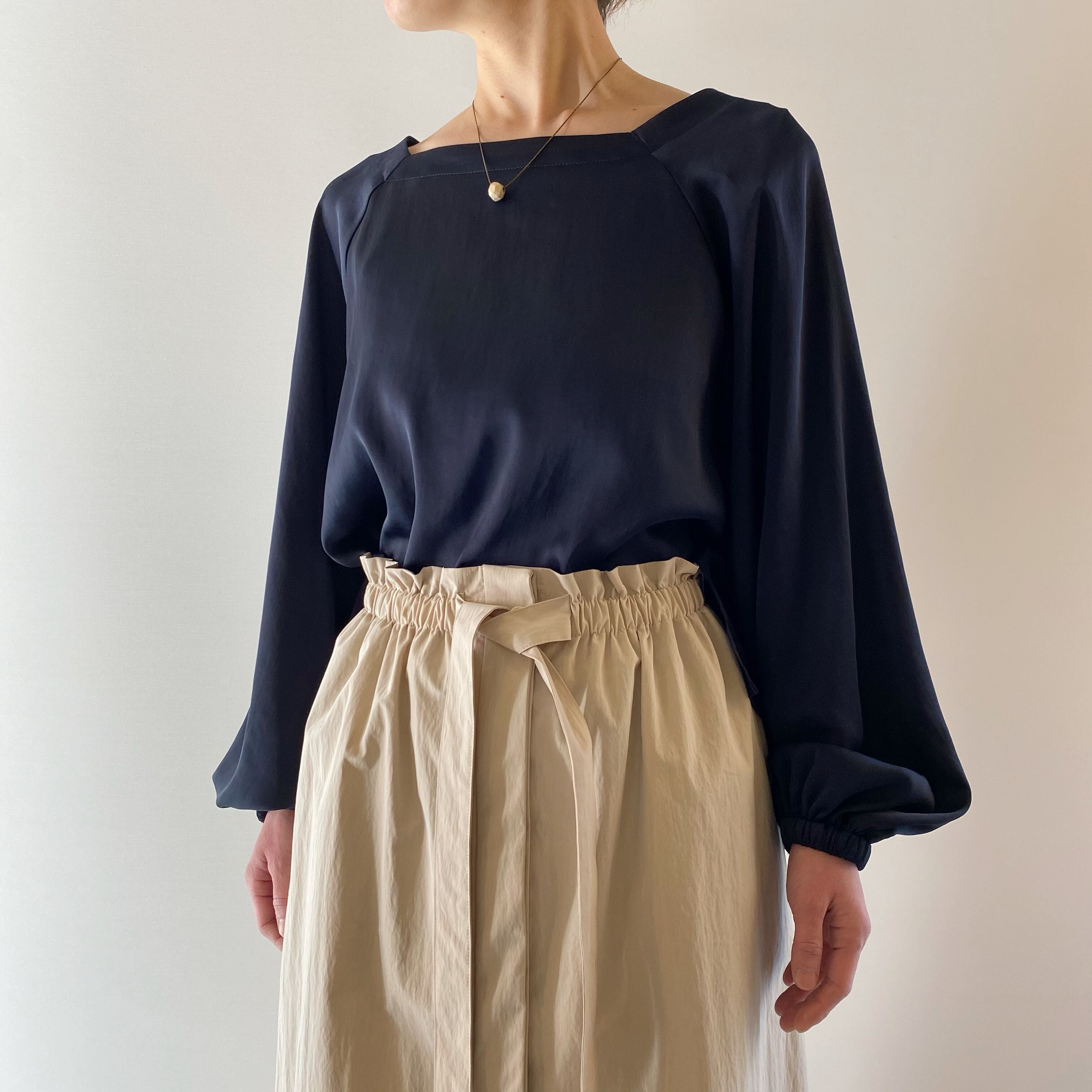 <Design Detail> スクエアネックがちょっと新鮮なサテンブラウス