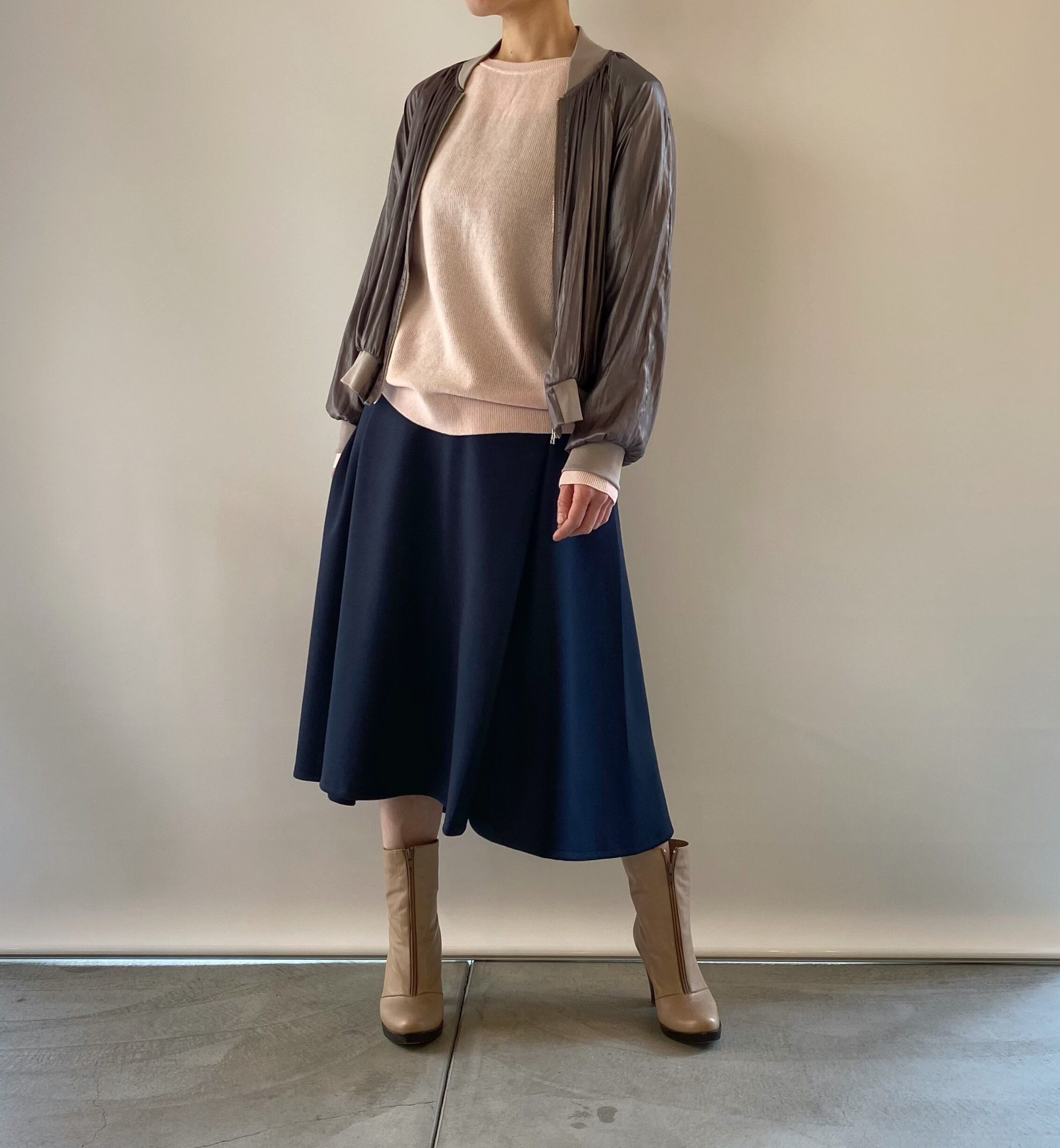 ボディーの前後、袖口にギャザーを施しドレープを作りだすことで、ブルゾンの形でもエレガント