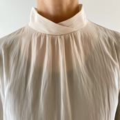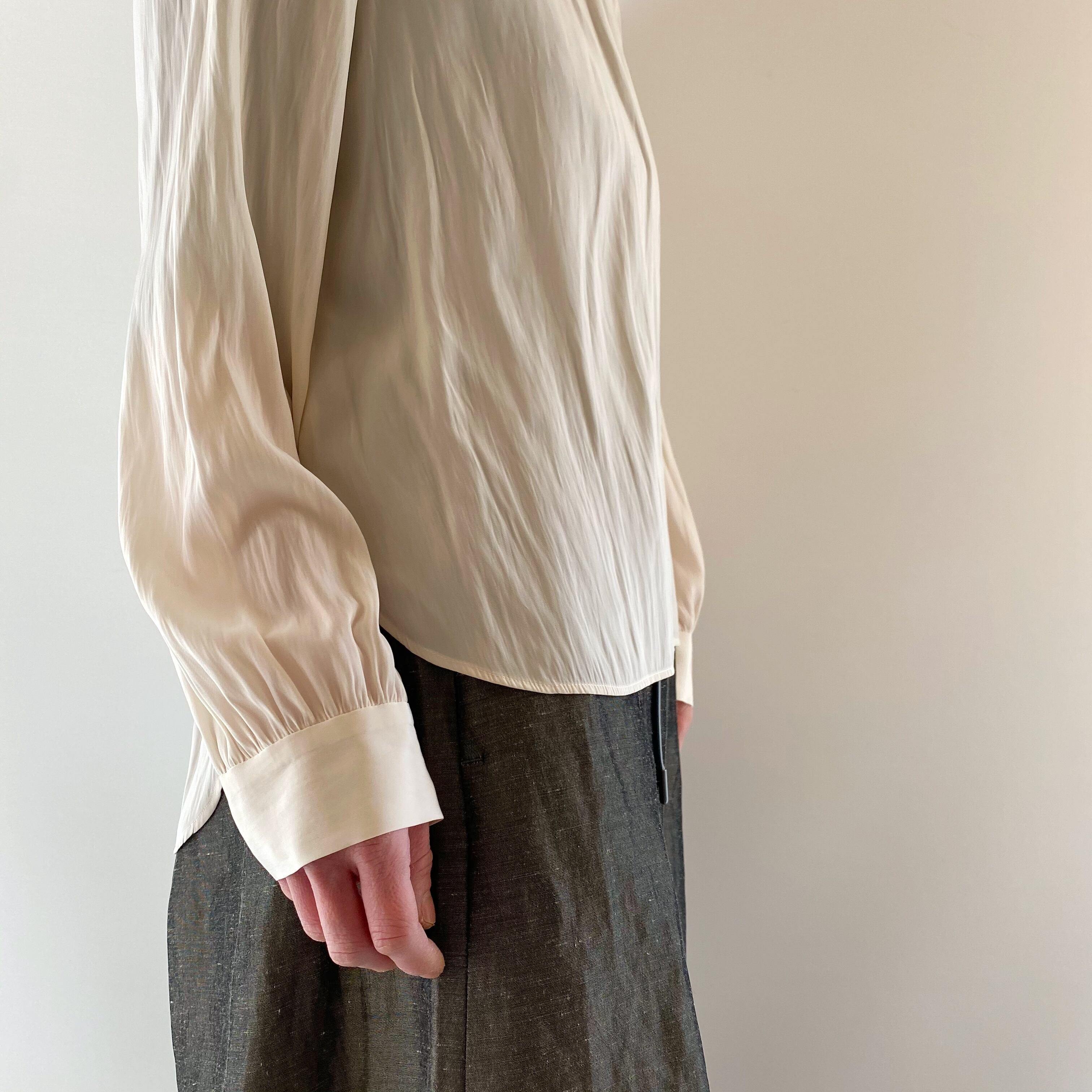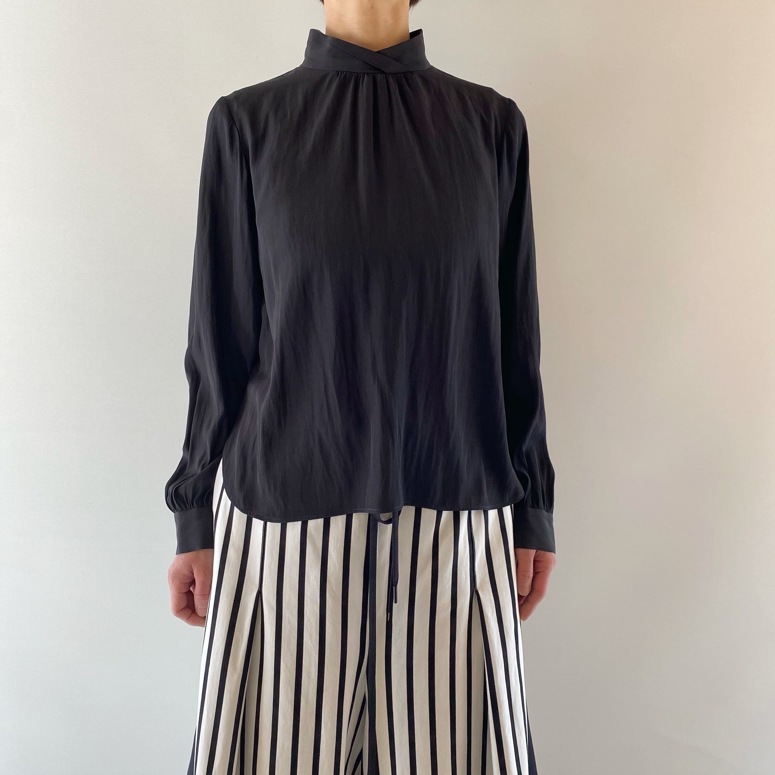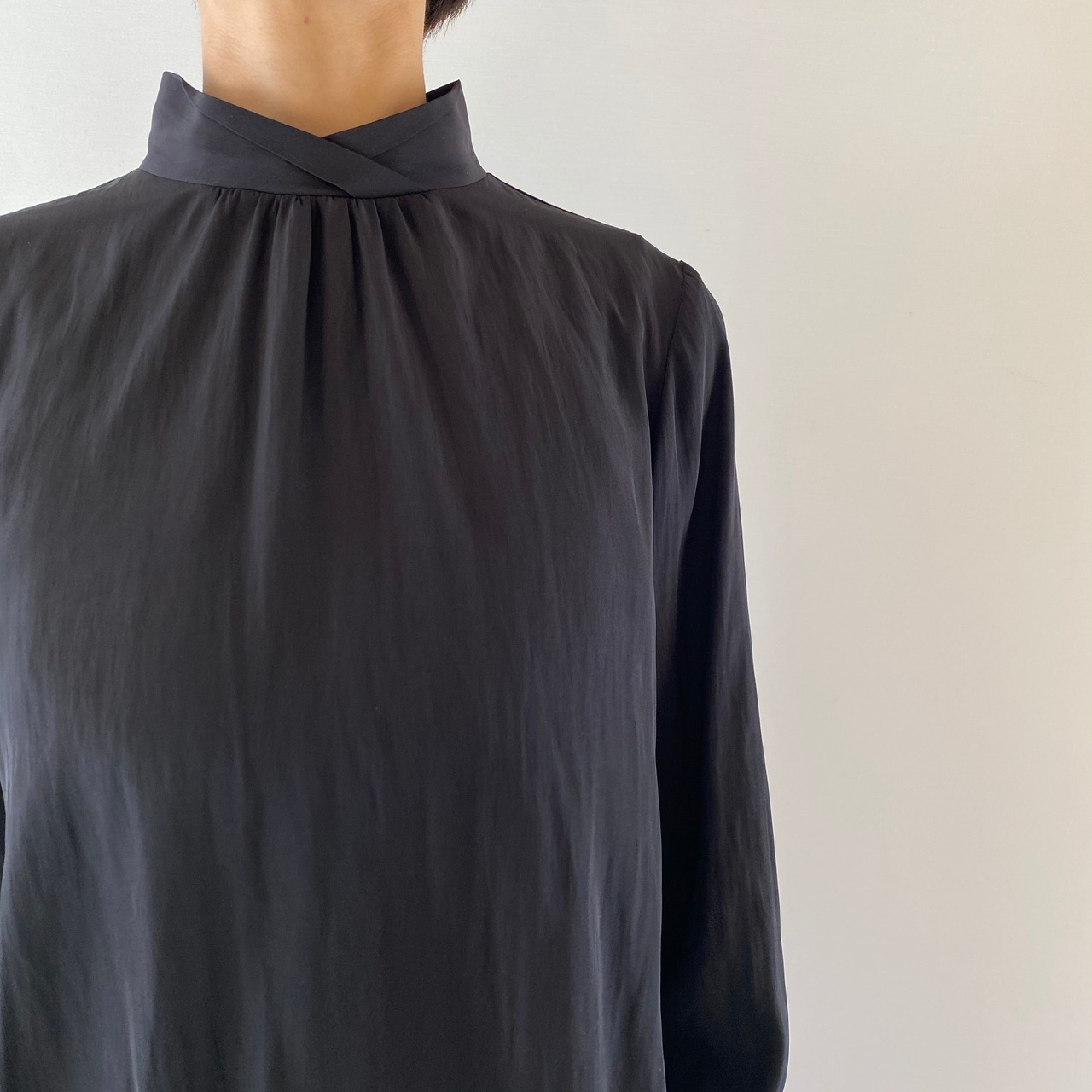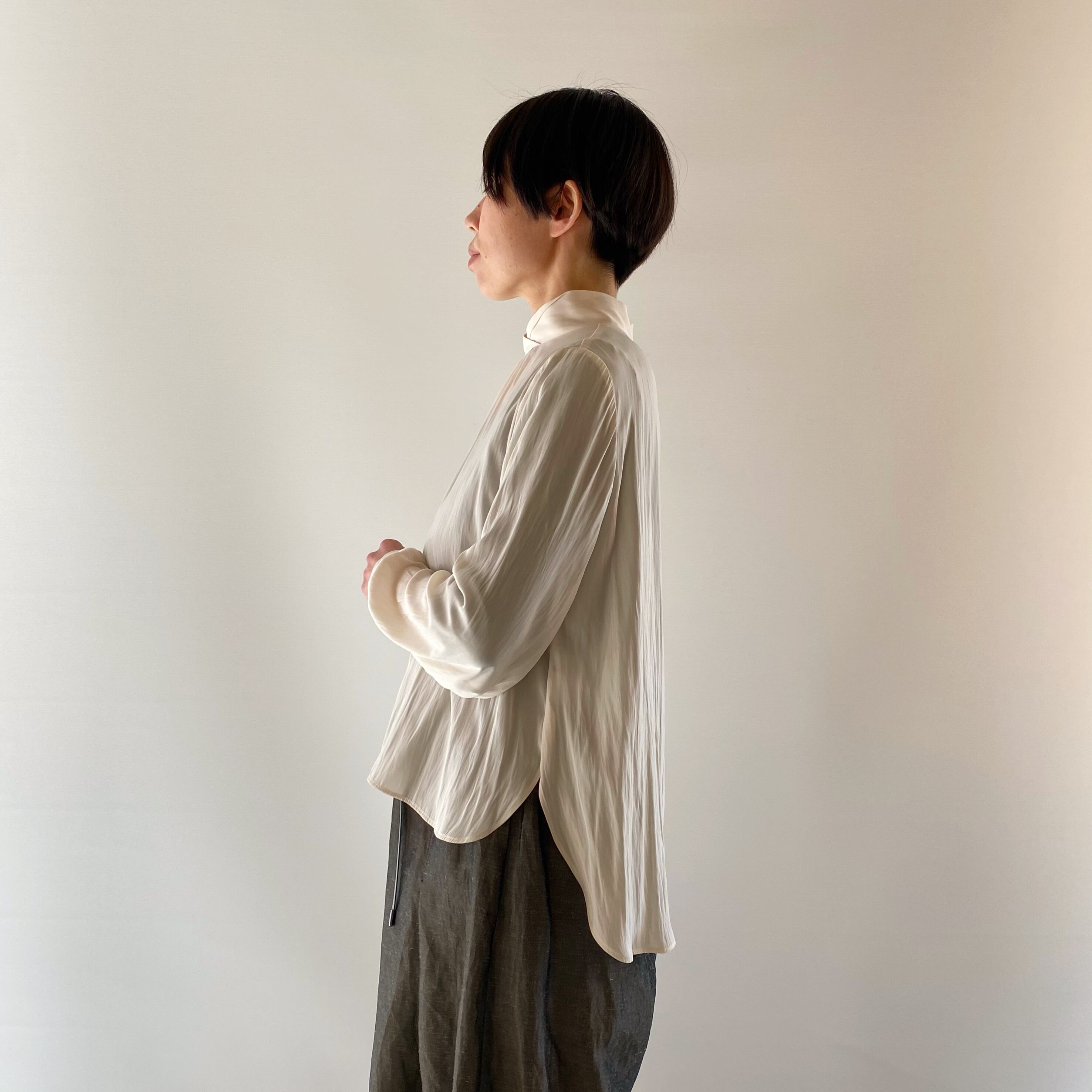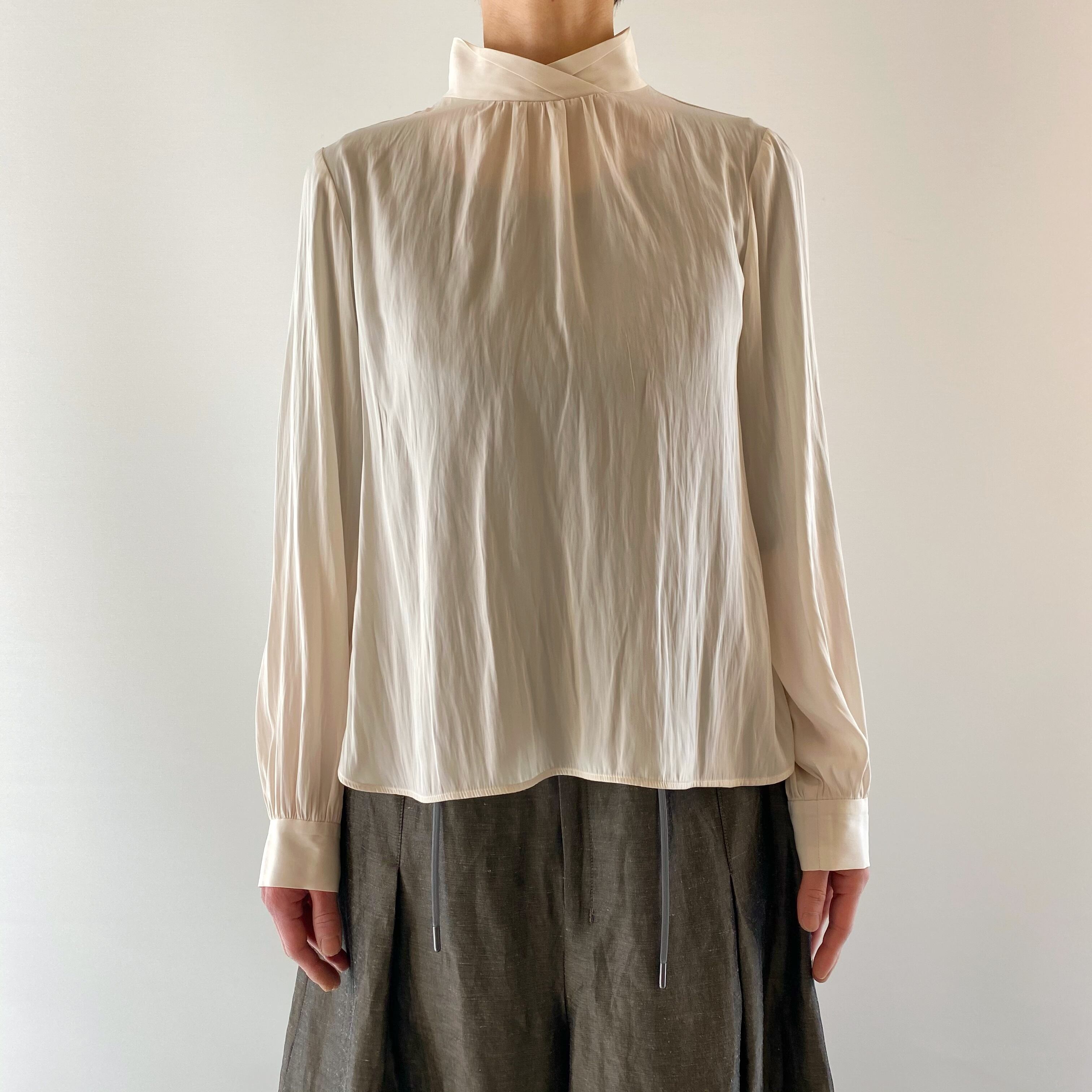 <Design Detail> デザインの入ったスタンドカラーが高貴な雰囲気のサテンブラウス