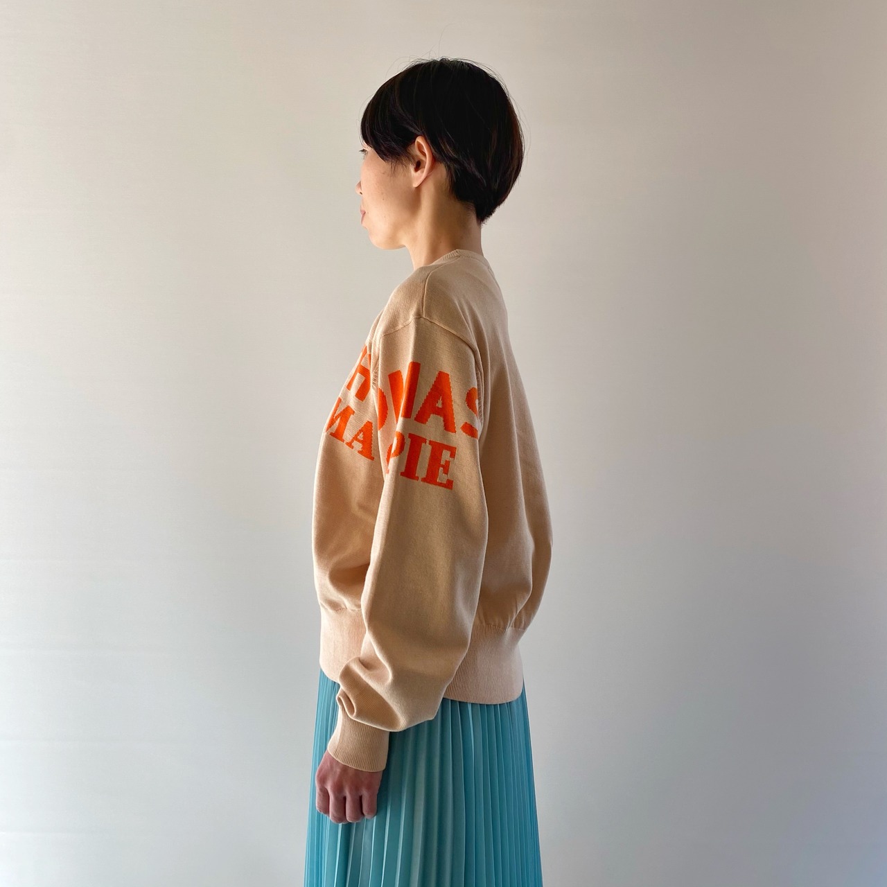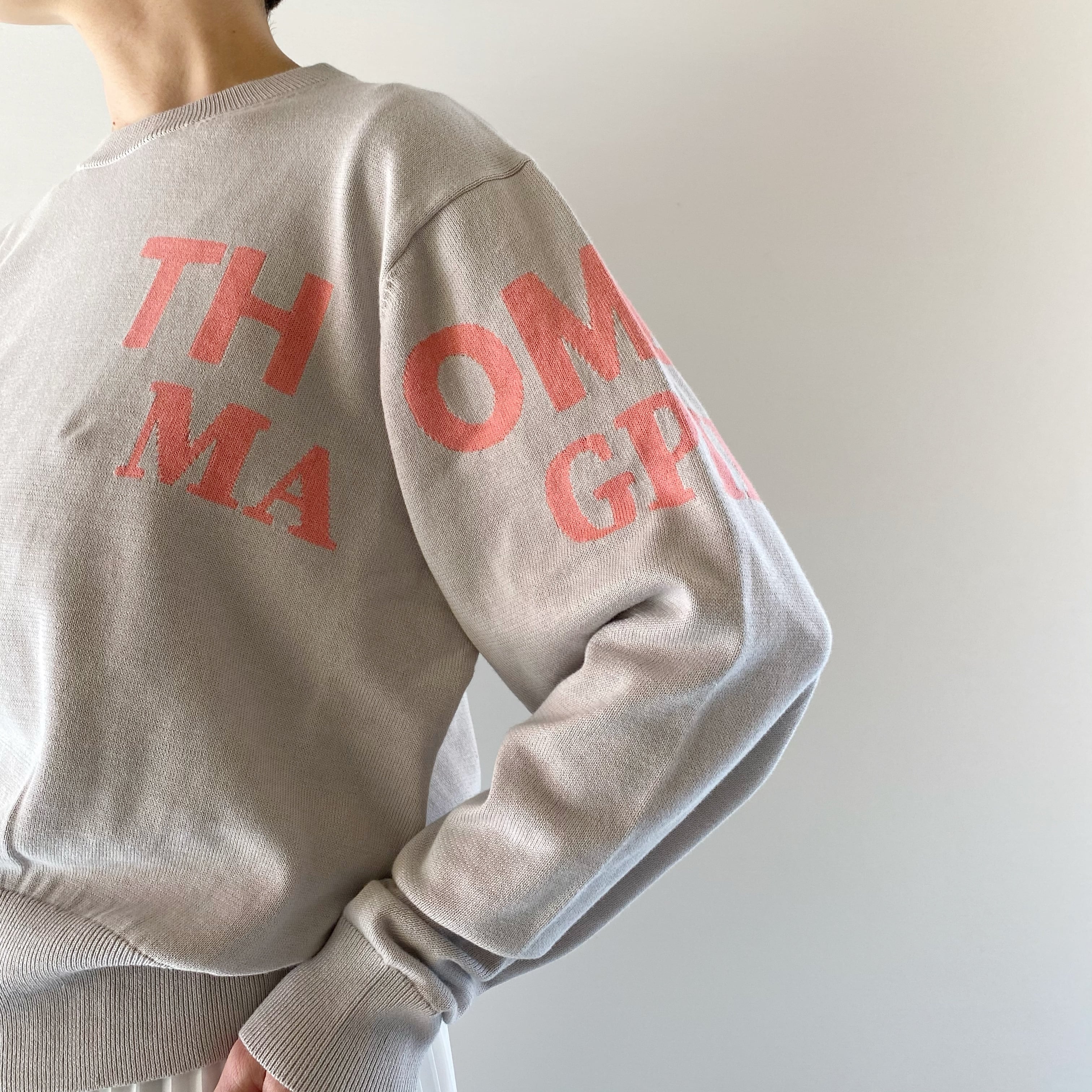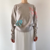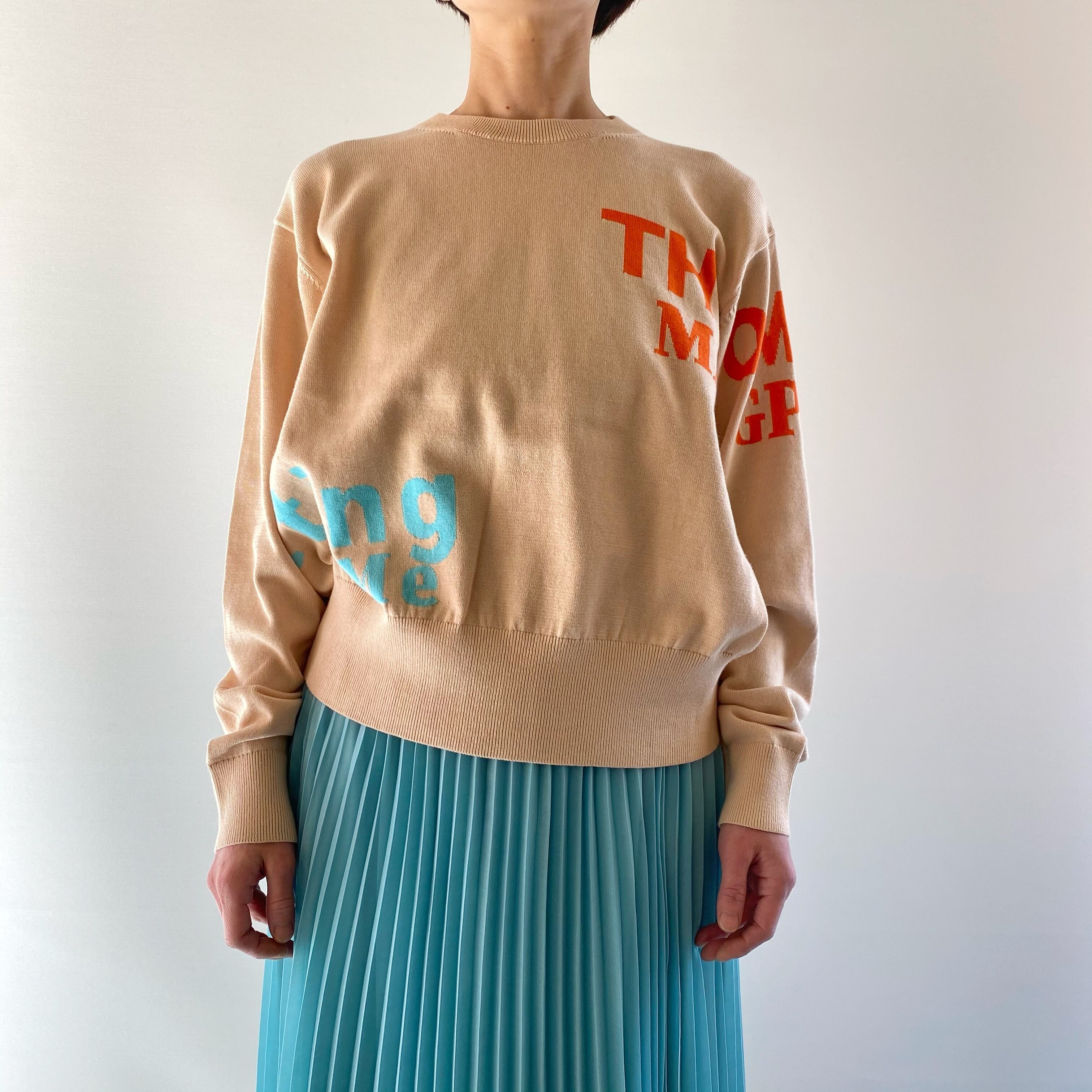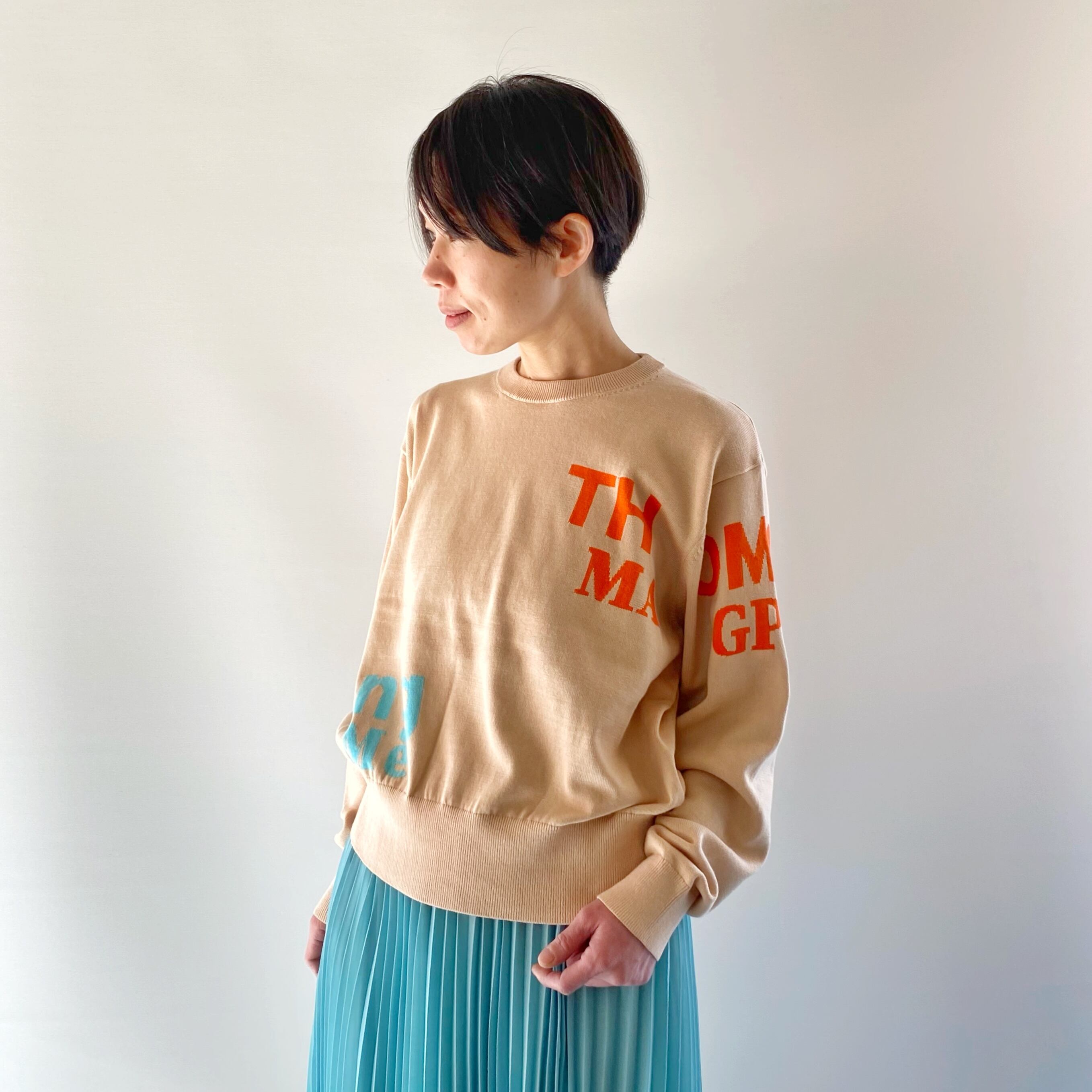 <Design Detail> 詰まり気味な丸首のベーシックな綿ニットに配置、配色が絶妙なロゴ。