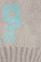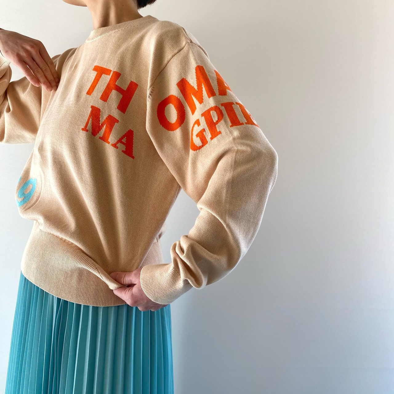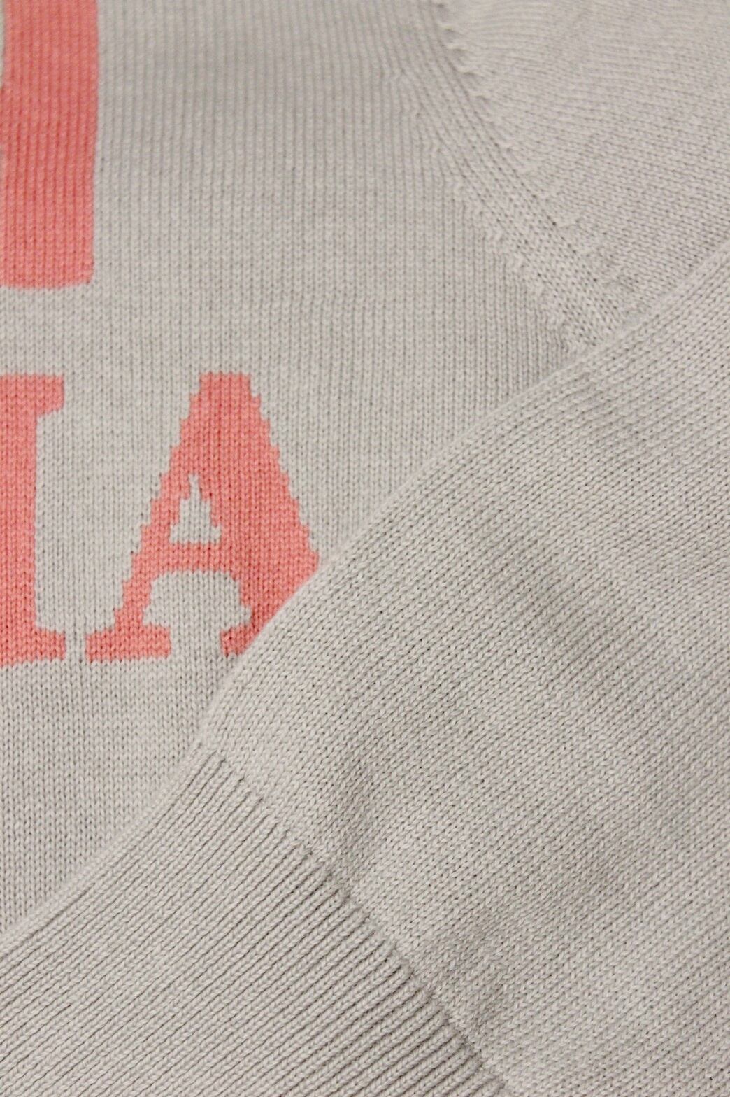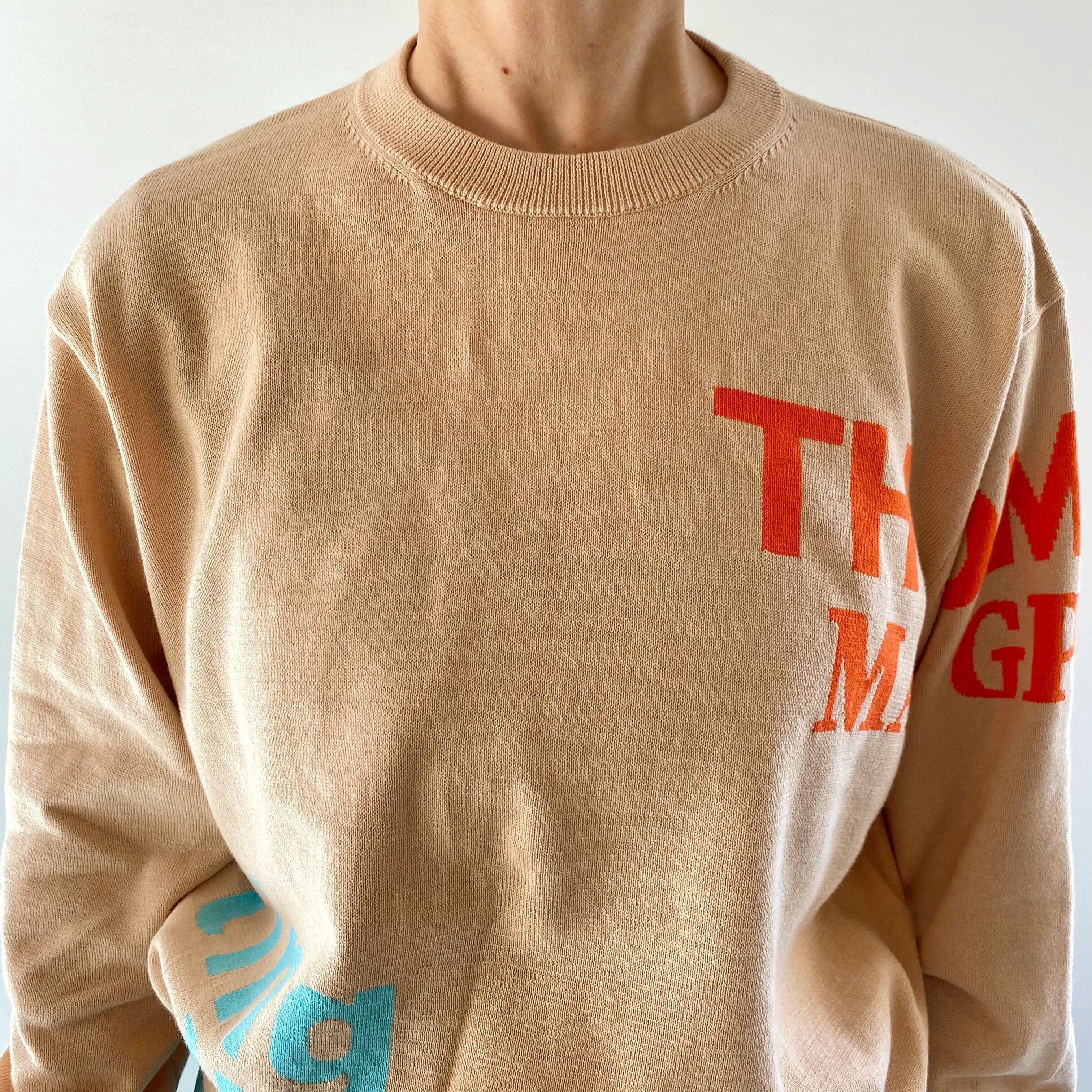 <Design Detail> 詰まり気味な丸首のベーシックな綿ニットに配置、配色が絶妙なロゴ。