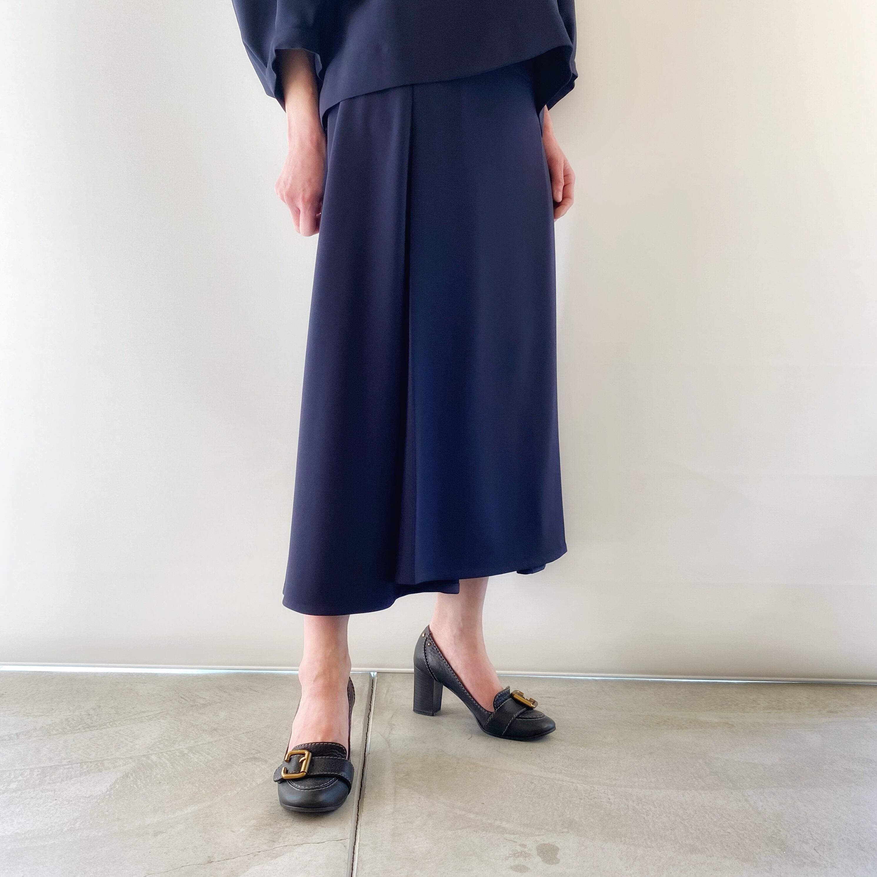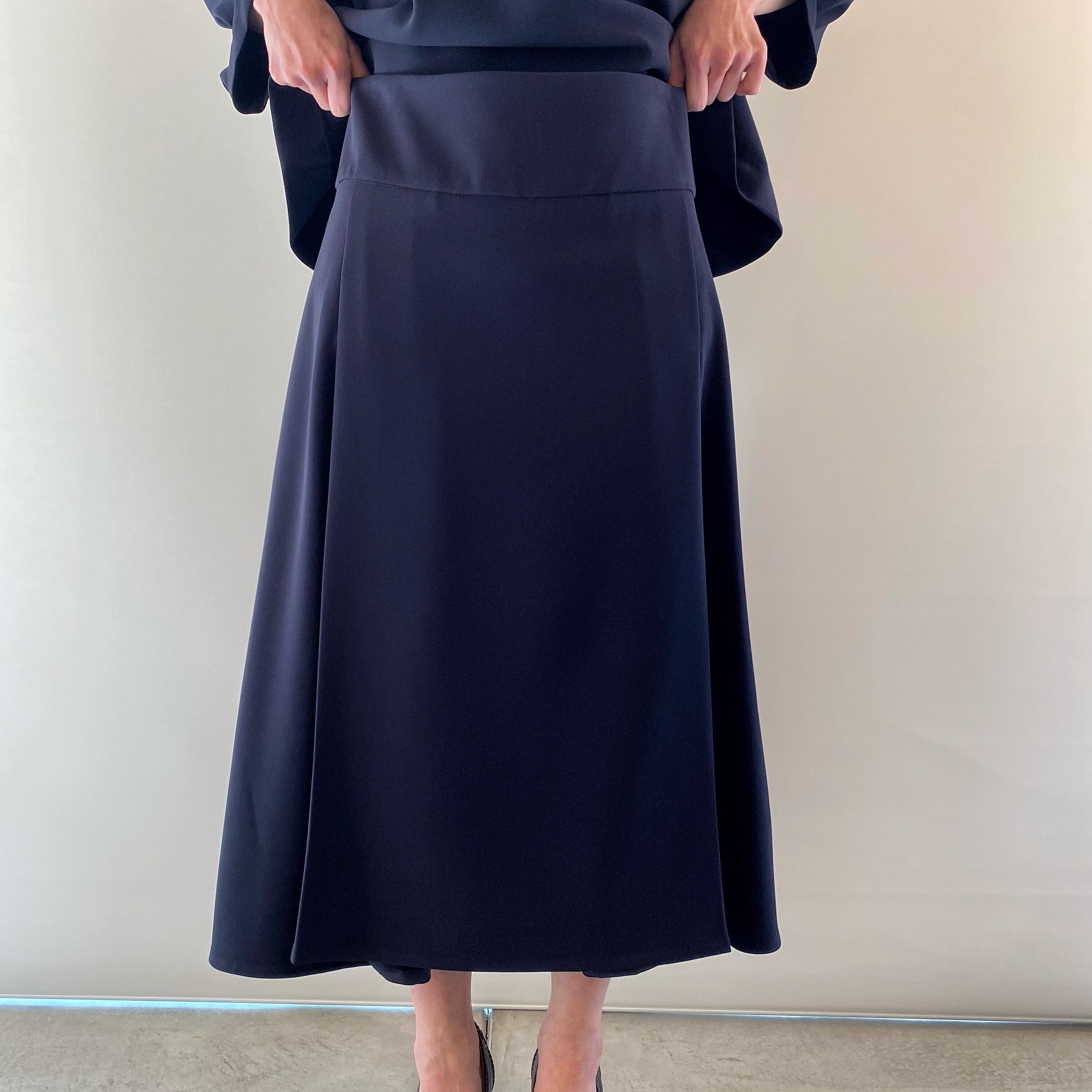 深めのタックをデザインしたフレアースカート。前後の丈差が5cmほどあります。ウエストの傾斜が様々な体型にフィットするよう設計されています