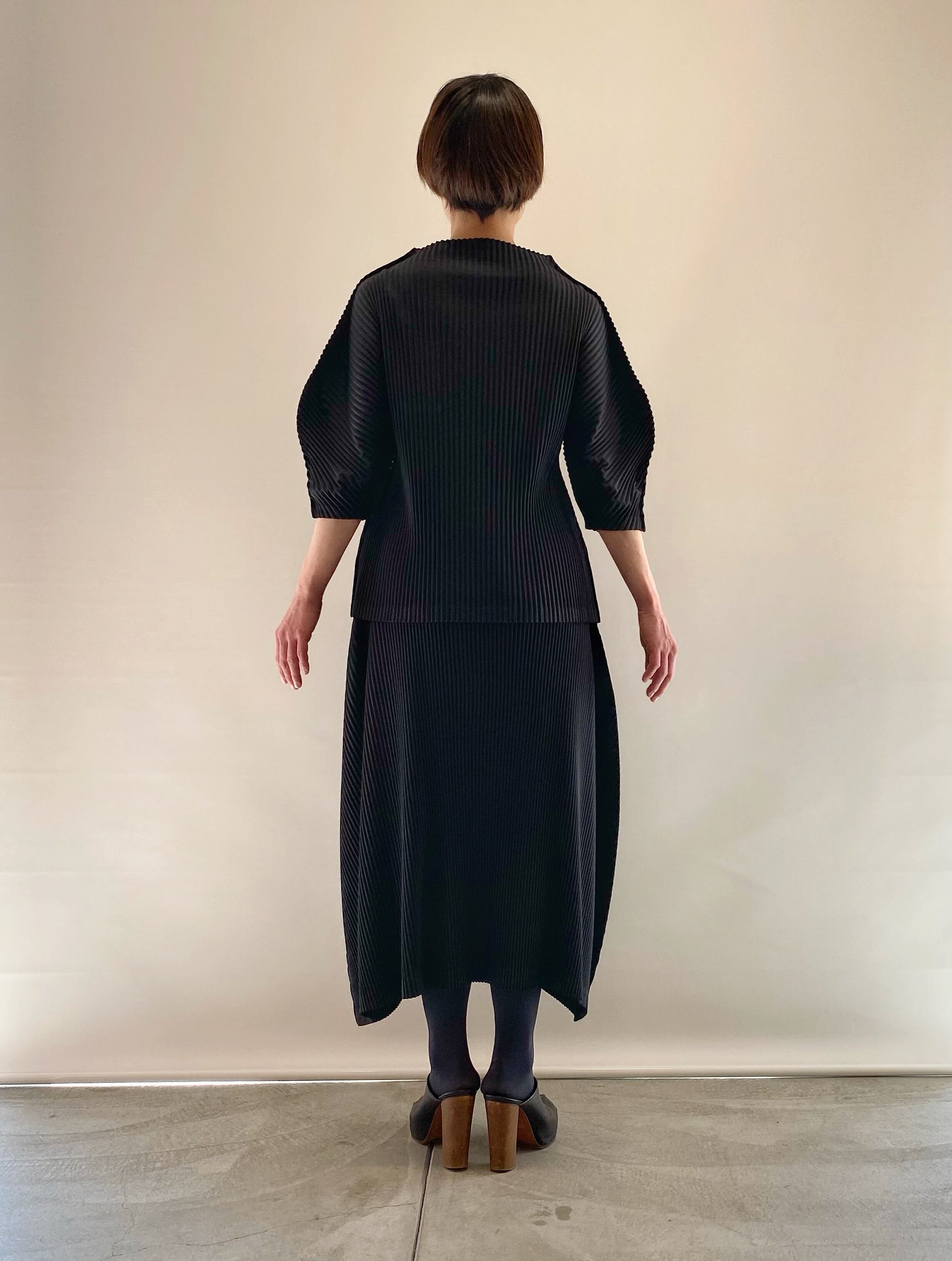 パターンの先生だけあって、マヌカンのお洋服はとにかくパターンが形が綺麗。一見ミニマルなデザインでも、綿密に計算されたタック使いなどで、着た時に意図したボリューム感やシルエットが出るようにデザインされています。
